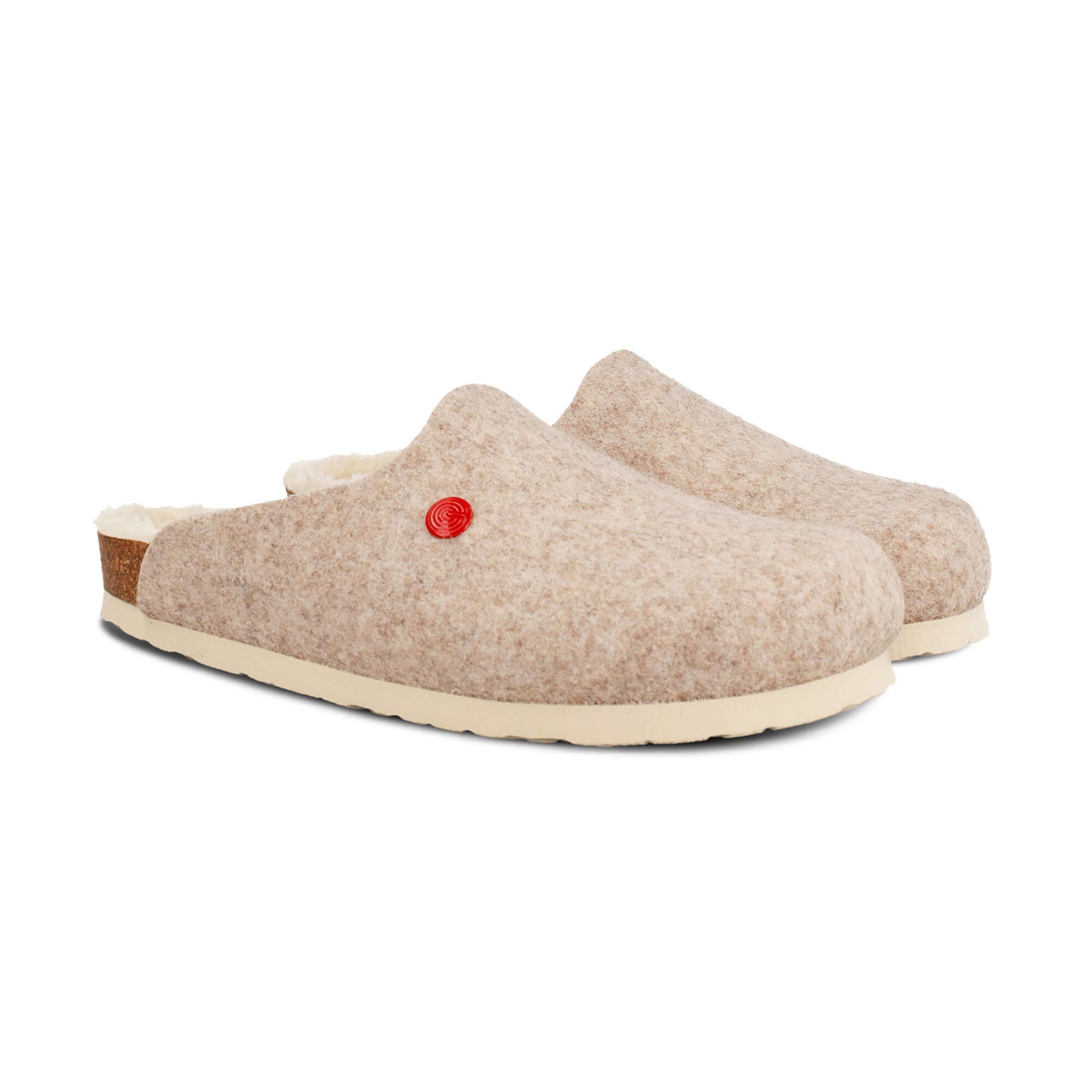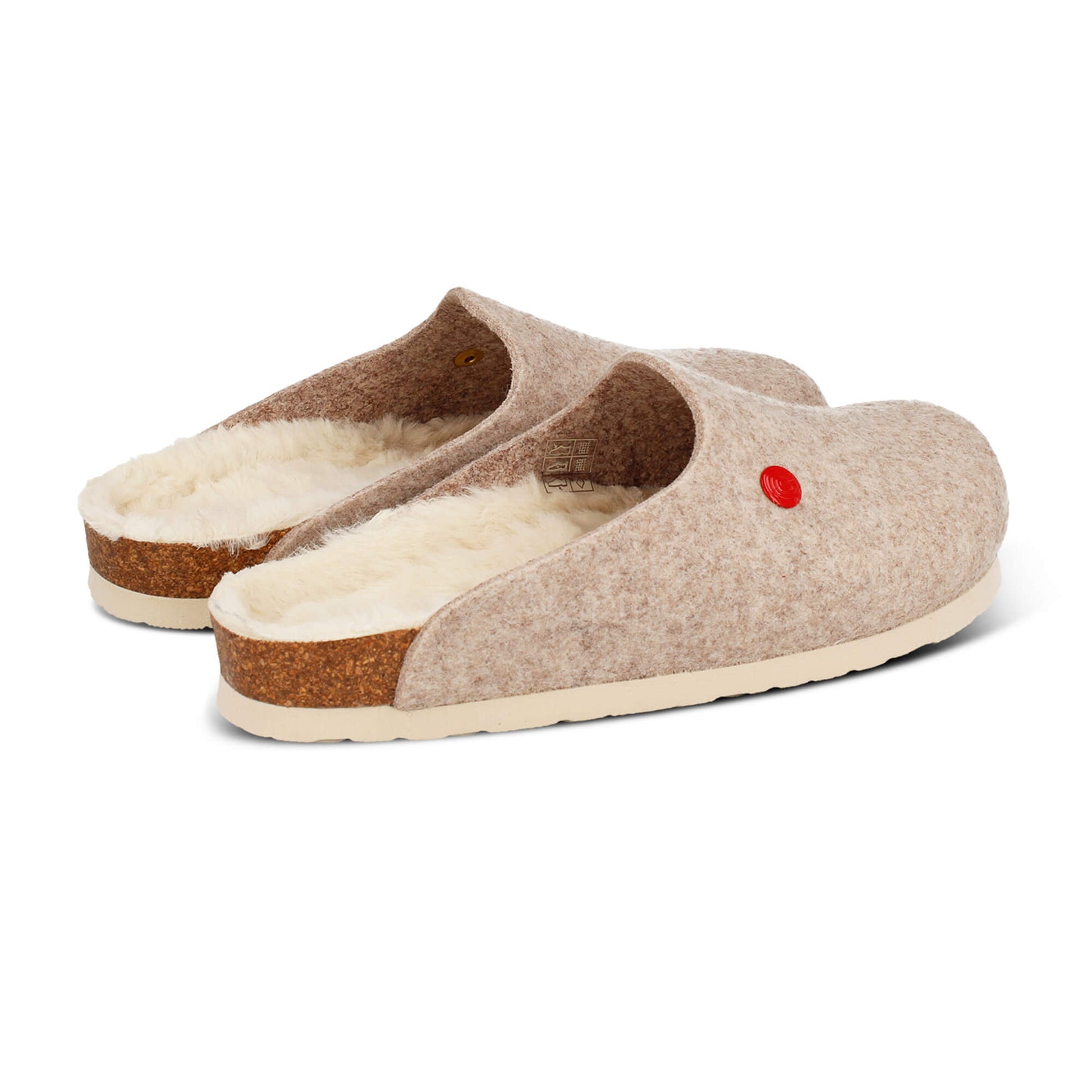 Crafted from felt fabric, these Genuins slip ons feature an anatomical plant made with natural cork and foam for superior comfort. The beige synthetic fur covering adds to the luxurious feel, while the rubber outsole ensures durability. Made in Spain with high-quality materials.