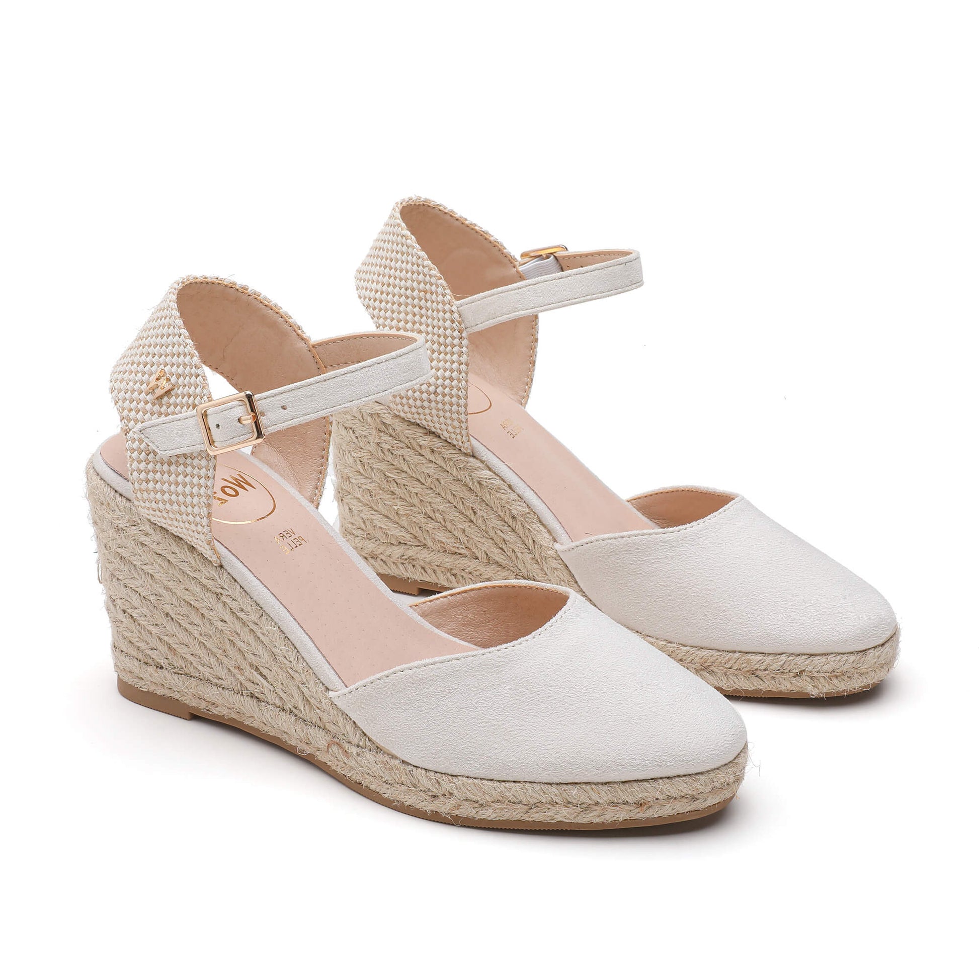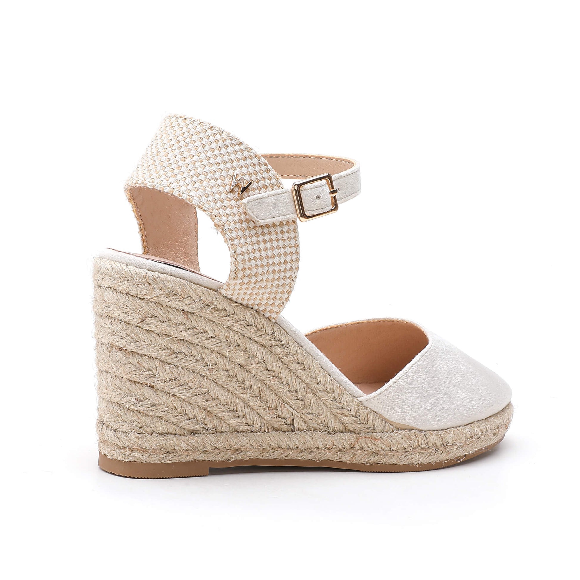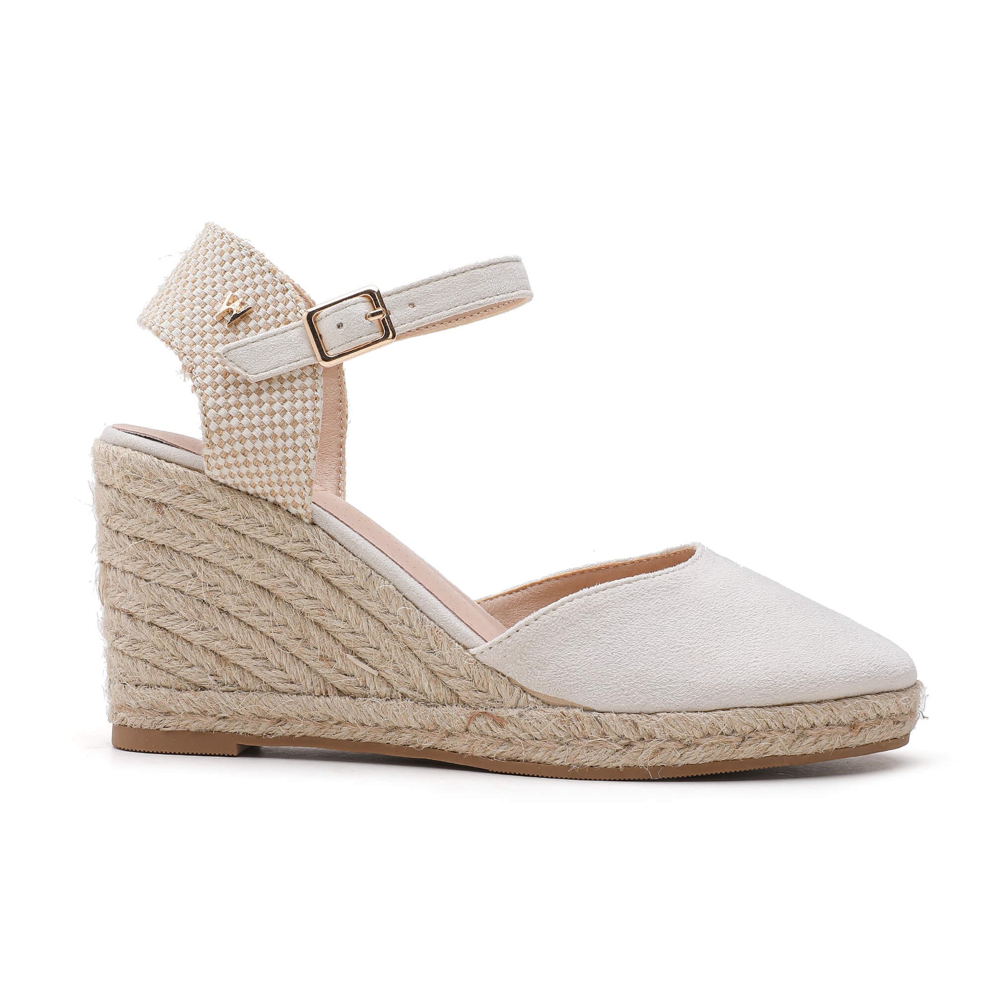 These Joy Ivory Espadrilles feature a timeless wedge design and are made with luxurious suede material. The ankle strap is fastened with a buckle, providing a secure fit. A padded footbed adds extra comfort, while the heel is adorned with a natural beige braided rope. With a heel height of 7 cm, these espadrilles are designed in Italy for a touch of elegance and sophistication.