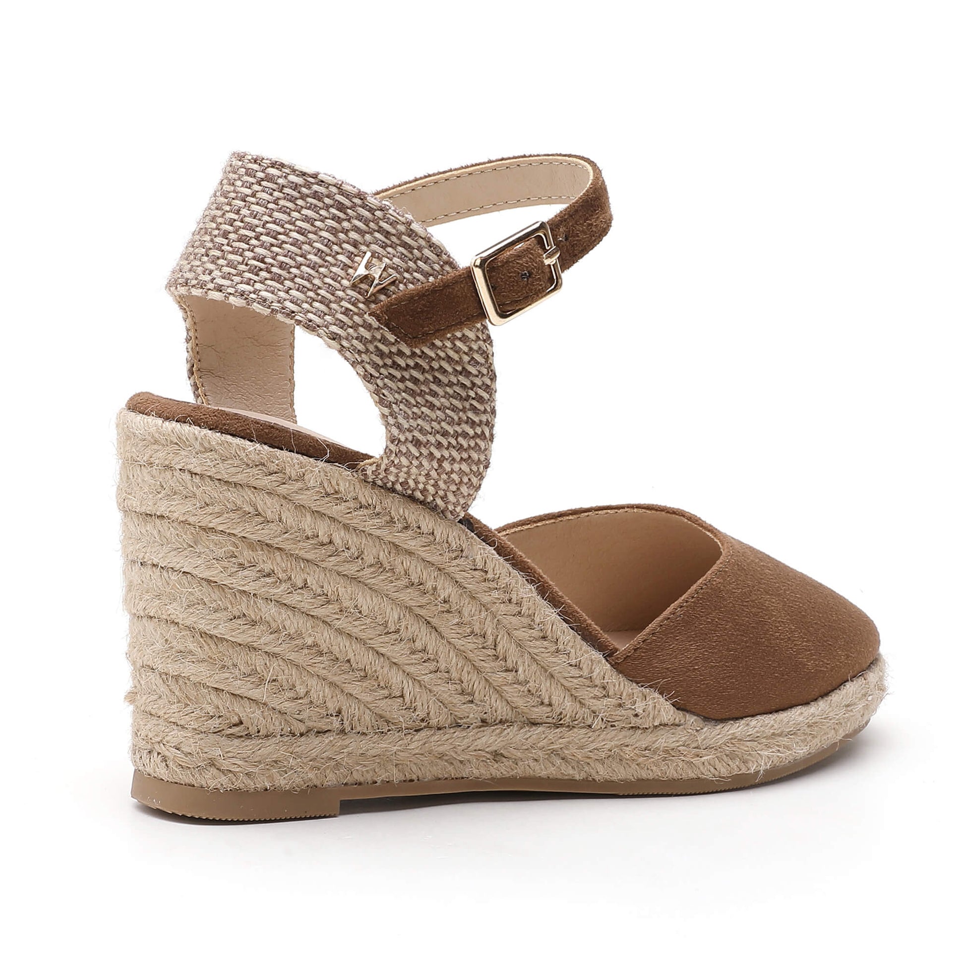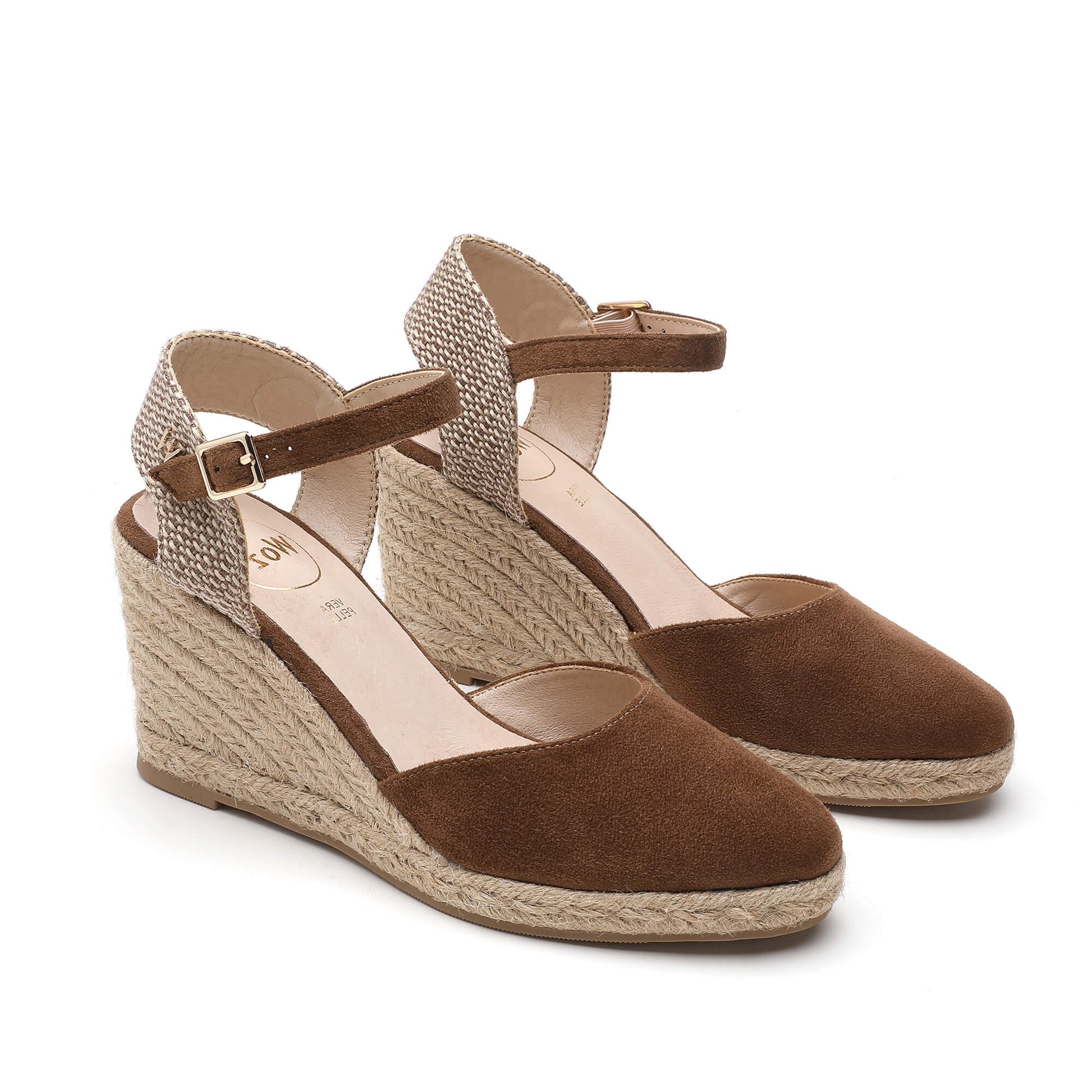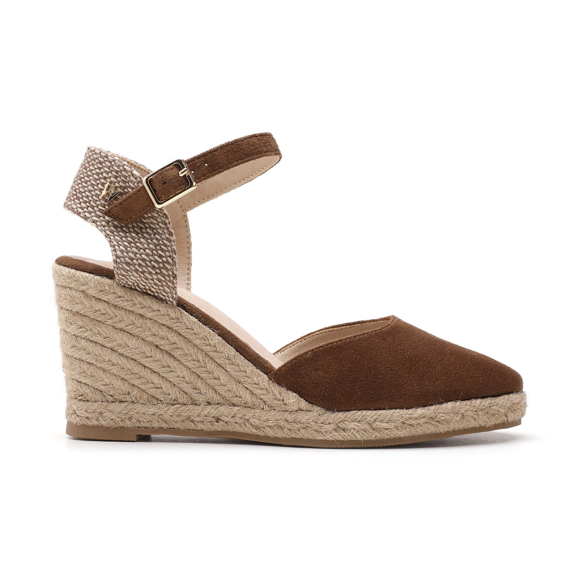 These Joy Tobacco Espadrilles feature a classic wedge design made from suede material. Ankle strap with buckle fastening and soft padded footbed provide comfort and support. The heel is elegantly covered with natural beige braided rope and has a height of 7 cm. These espadrilles were expertly designed in Italy for a sophisticated and stylish addition to any wardrobe.