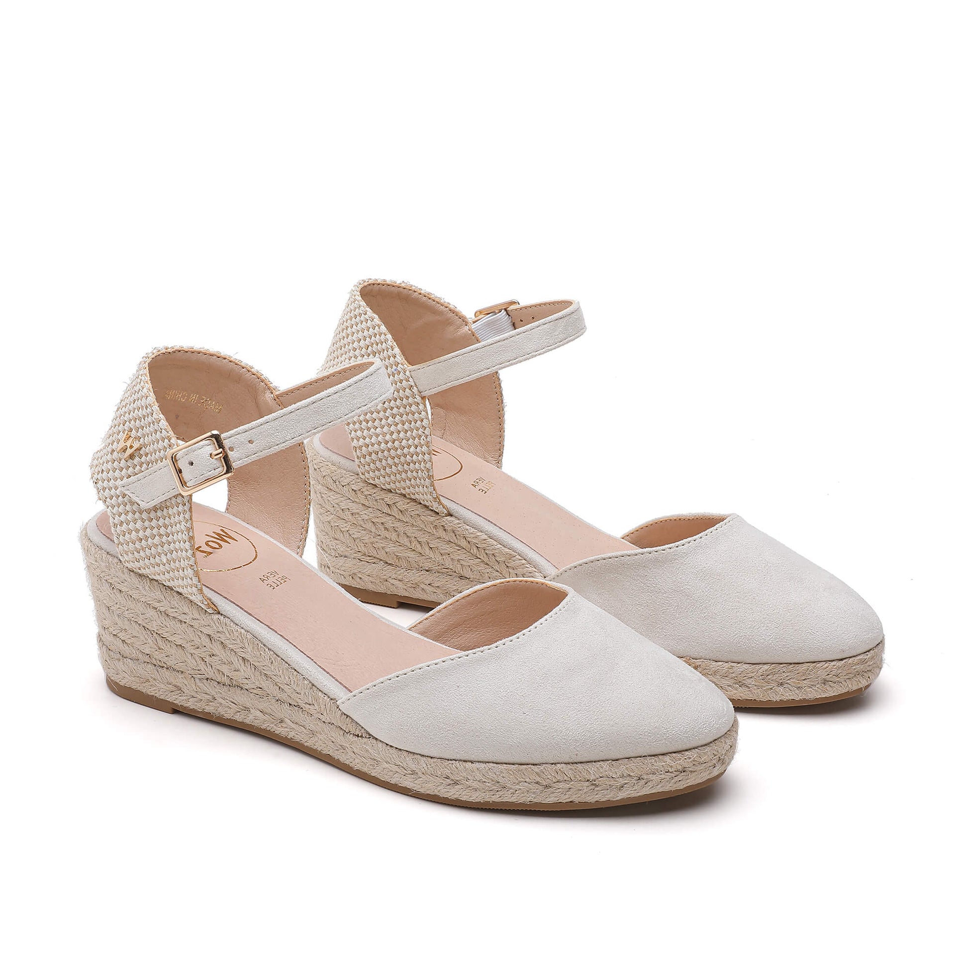 Expertly designed in Italy, these Kelly Ivory Espadrilles feature a fashionable mid high heel made of suede fabric. The soft padded footbed and natural beige braided rope covering add comfort and style. Secure the perfect fit with the buckle fastening ankle strap, and enjoy a heel height of 5 cm.