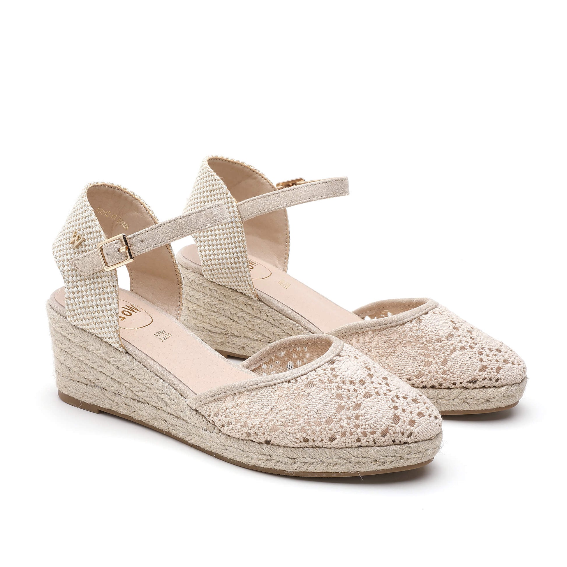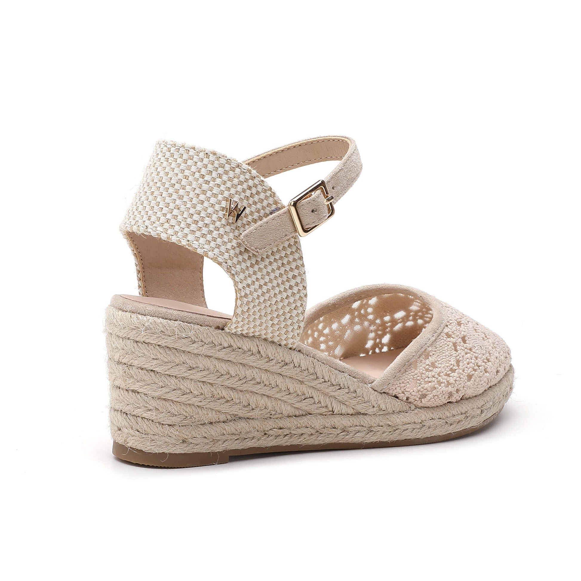 These Kelly Ecru Espadrilles feature a chic mid-high heel and a crochet upper for a fashionable look. The ankle strap fastens with a buckle, and the footbed is padded for added comfort. The heel is covered in a natural beige braided rope, measuring 5 cm, and the design is crafted in Italy.