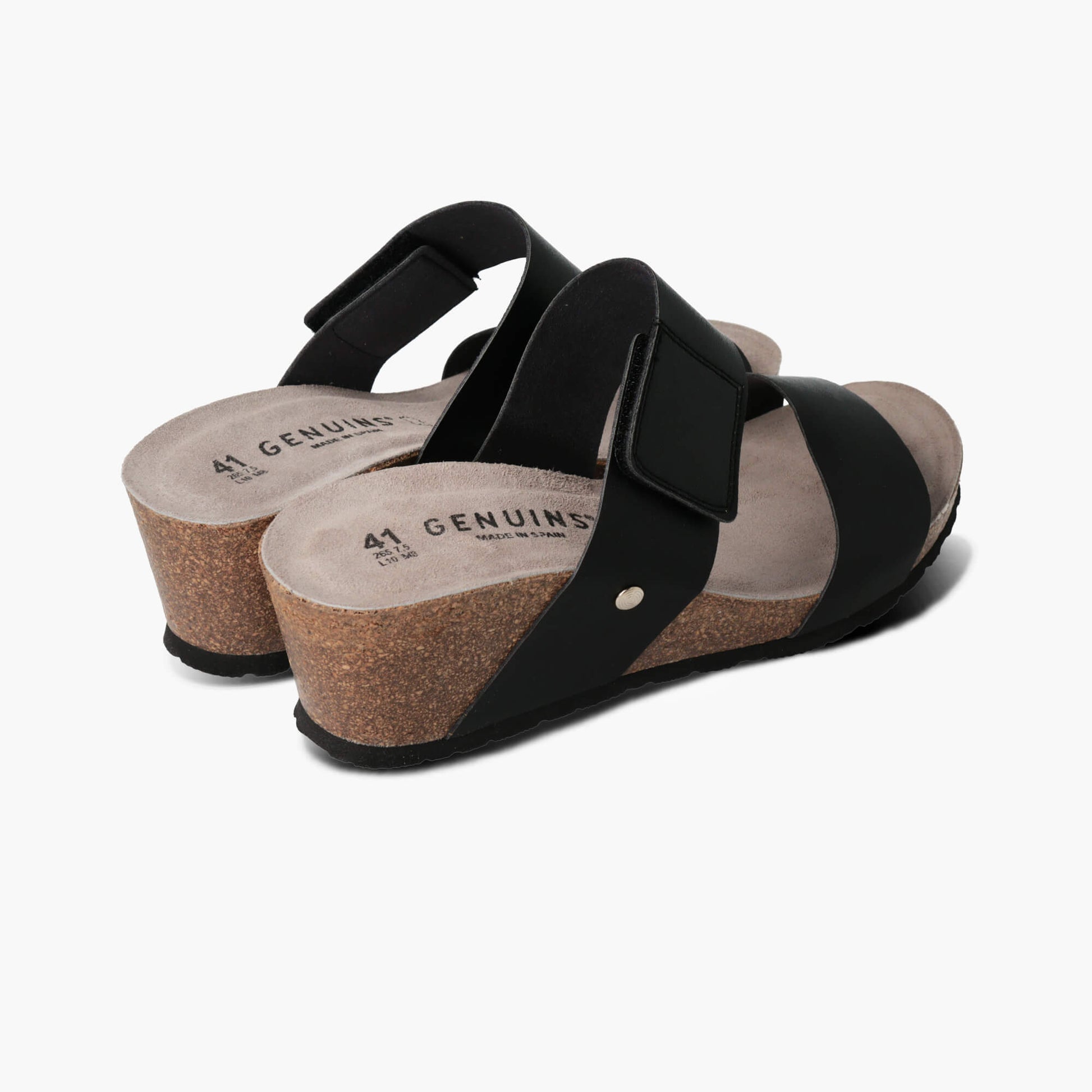 These Aline Black Sandals are constructed with synthetic material, allowing for adjustable straps and a comfortable 6 cm wedge height. The anatomical plant is expertly made with soft cork and the EVA outsole adds durability. Designed and produced in Spain with the utmost attention to detail.