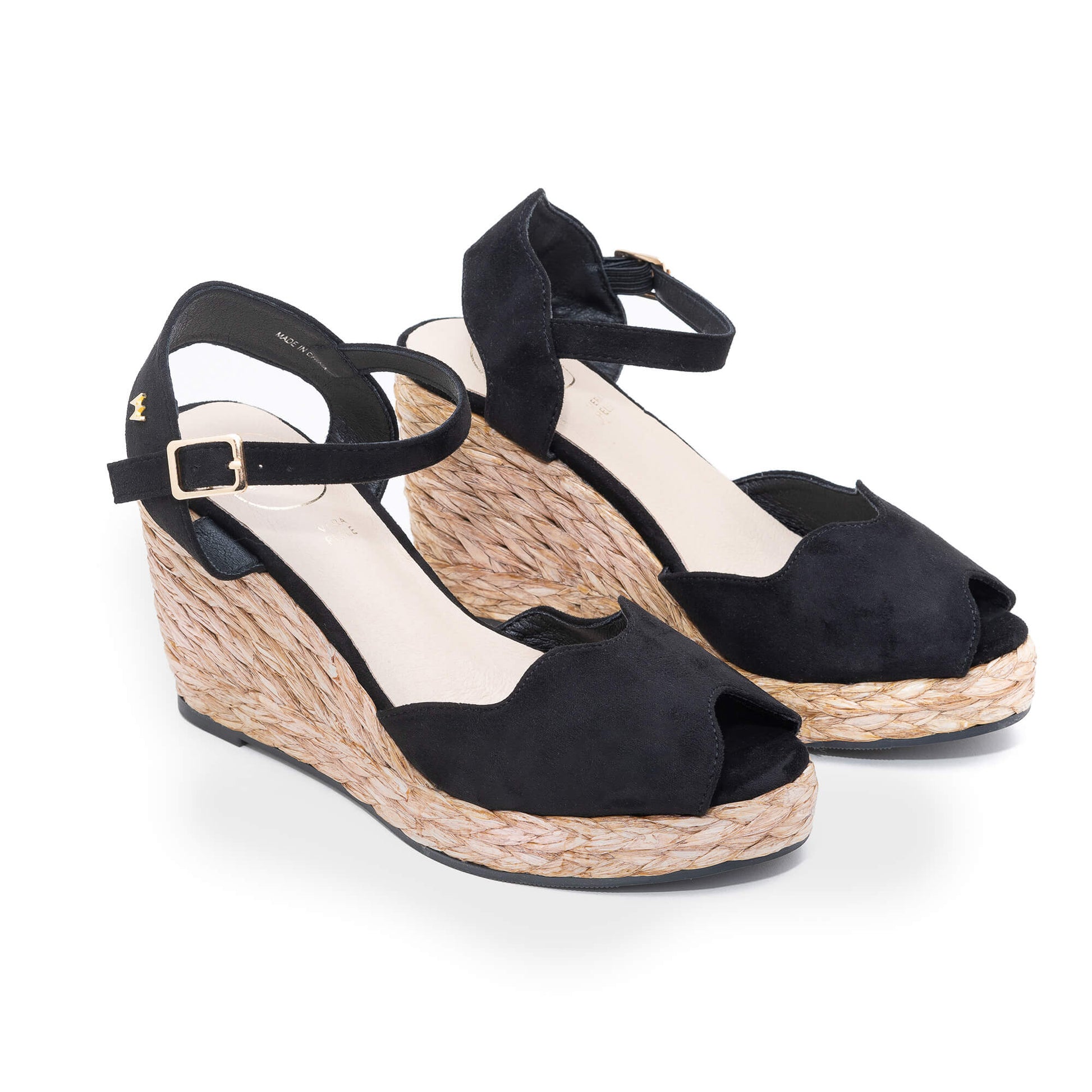 These Alison Black Espadrilles feature an open toe design with a fashionable wedge and a buckle fastening ankle strap. The soft padded footbed adds comfort while the heel is covered with natural beige braided raffia. With a heel height of 10 cm, these espadrilles were expertly designed in Italy.