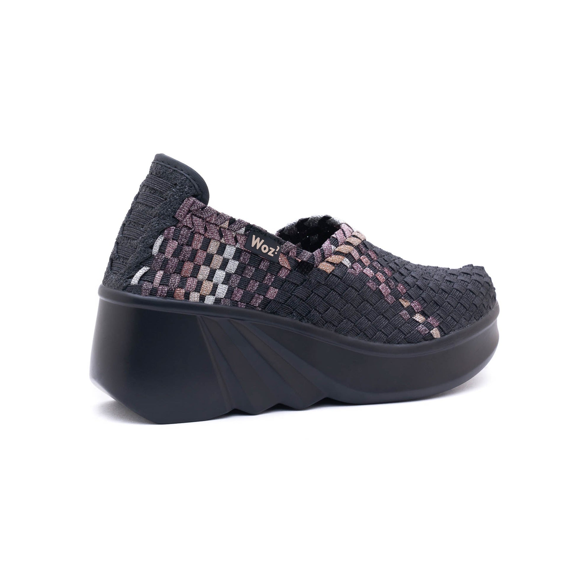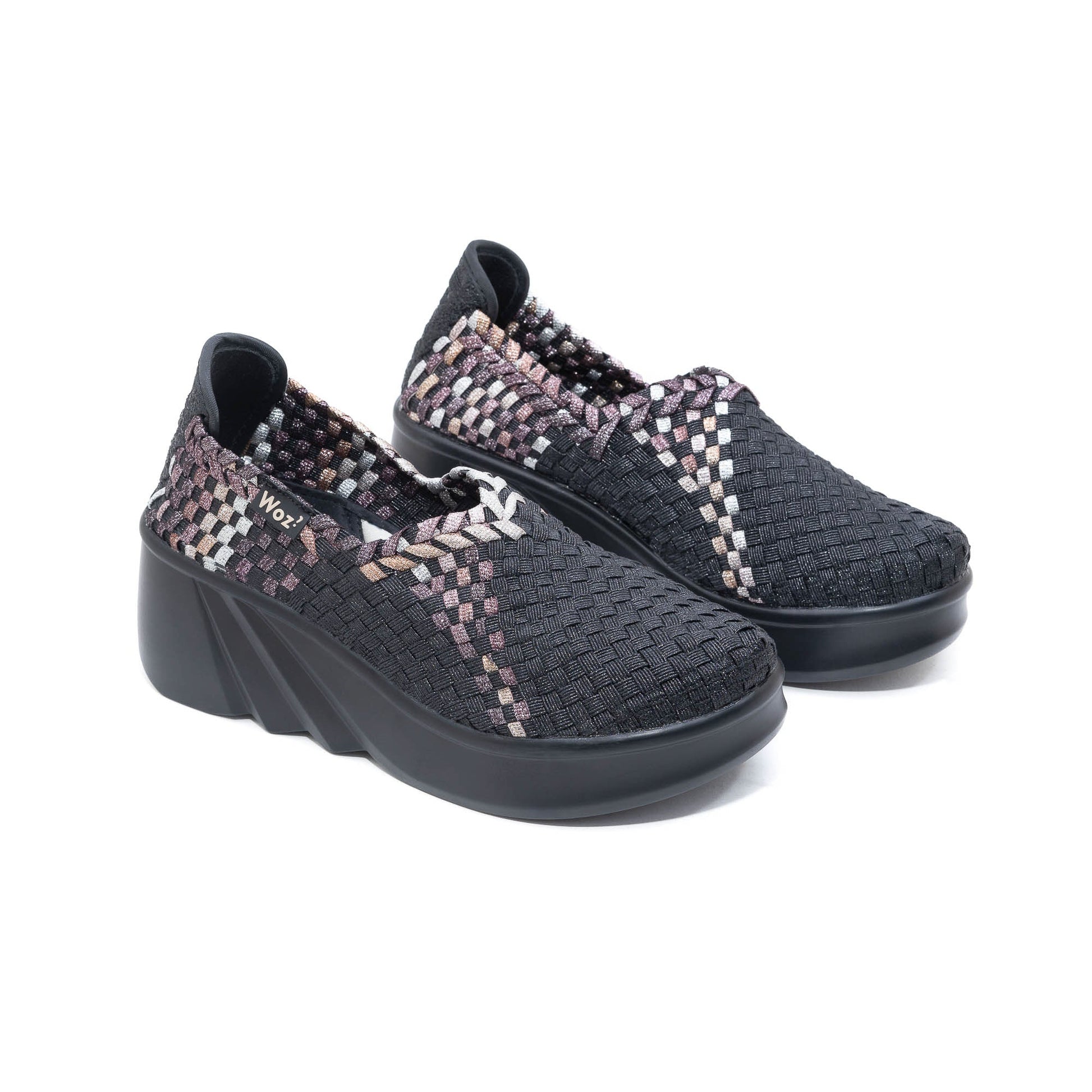 These Arezzo Black & Multi Bronze Wedge Heels feature a slip-on design and are made with a stretch woven textile. The soft padded footbed ensures a relaxed and comfortable feel while walking, while the black textured outsole provides excellent grip with each step. With a 7 cm heel height, these heels are expertly designed in Italy for both style and comfort.