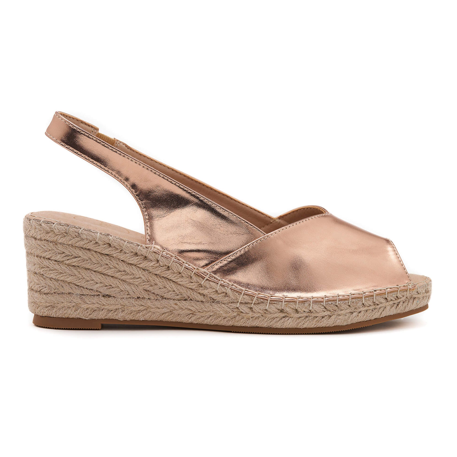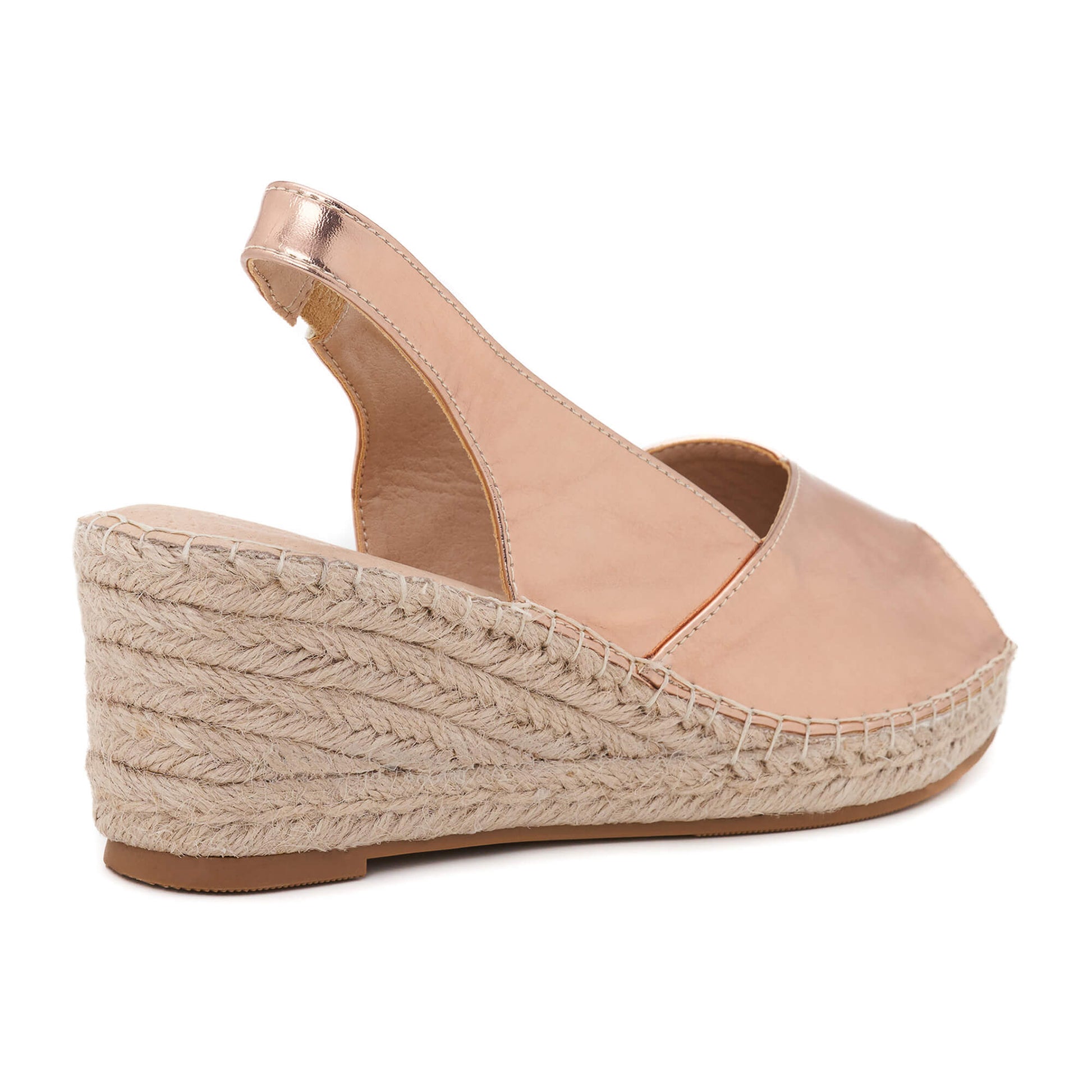 Crafted from durable synthetic leather, these Barry Rose Gold Espadrilles feature a secure elastic strap and a 5 cm heel covered with natural braided rope for both style and comfort.