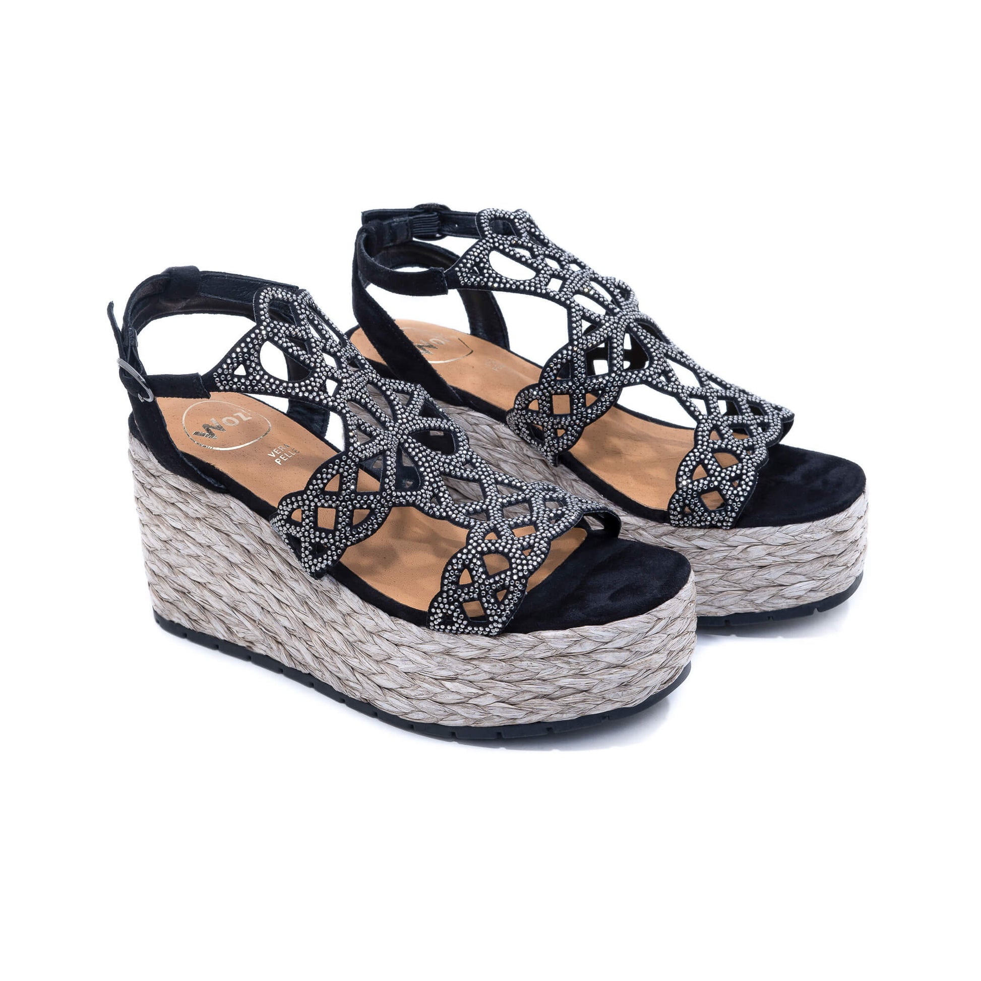 Crafted from luxurious fabric and embellished with stunning stones, these sophisticated sandals feature a plush, padded footbed and a heel wrapped in braided raffia. With a towering height of 9 cm, these imported Italian designs exude elegance and style.