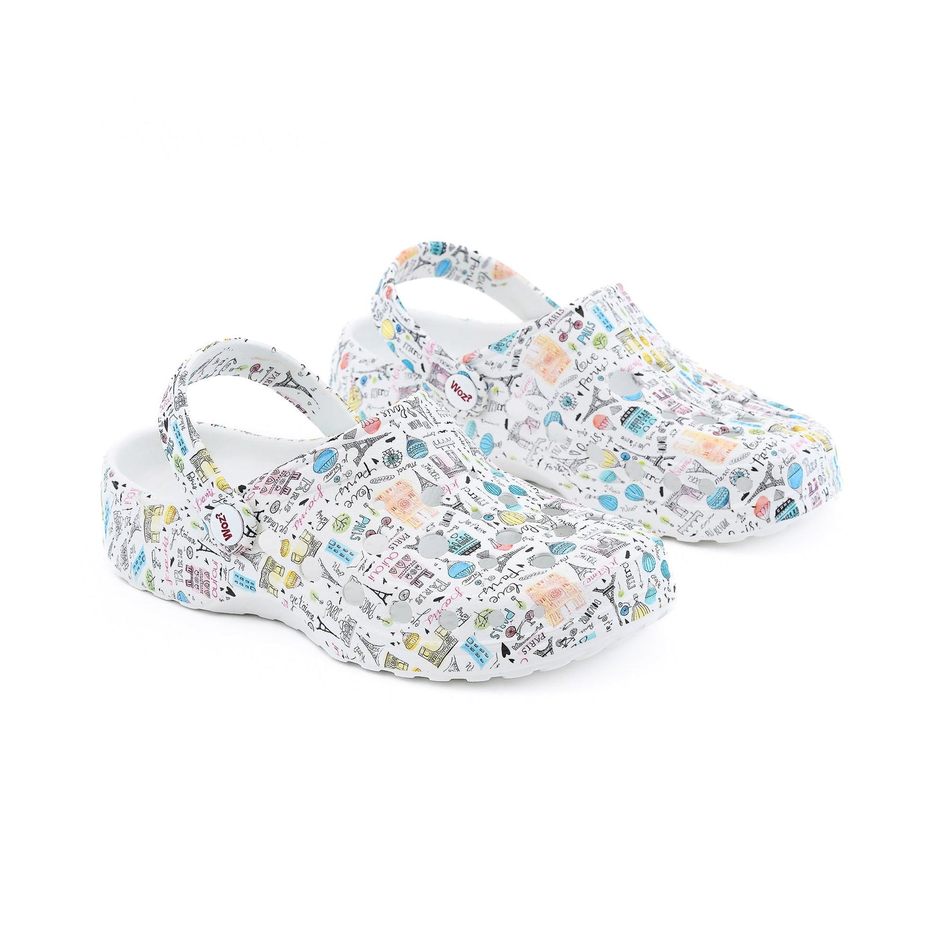 Experience all-day comfort and secure footing with our Paris print clogs from Woz. These lightweight and flexible clogs are a must-have for everyday wear and are expertly designed in Italy. Enjoy easy maintenance and a stylish look with this essential addition to your wardrobe.