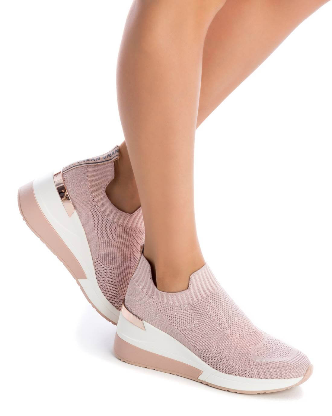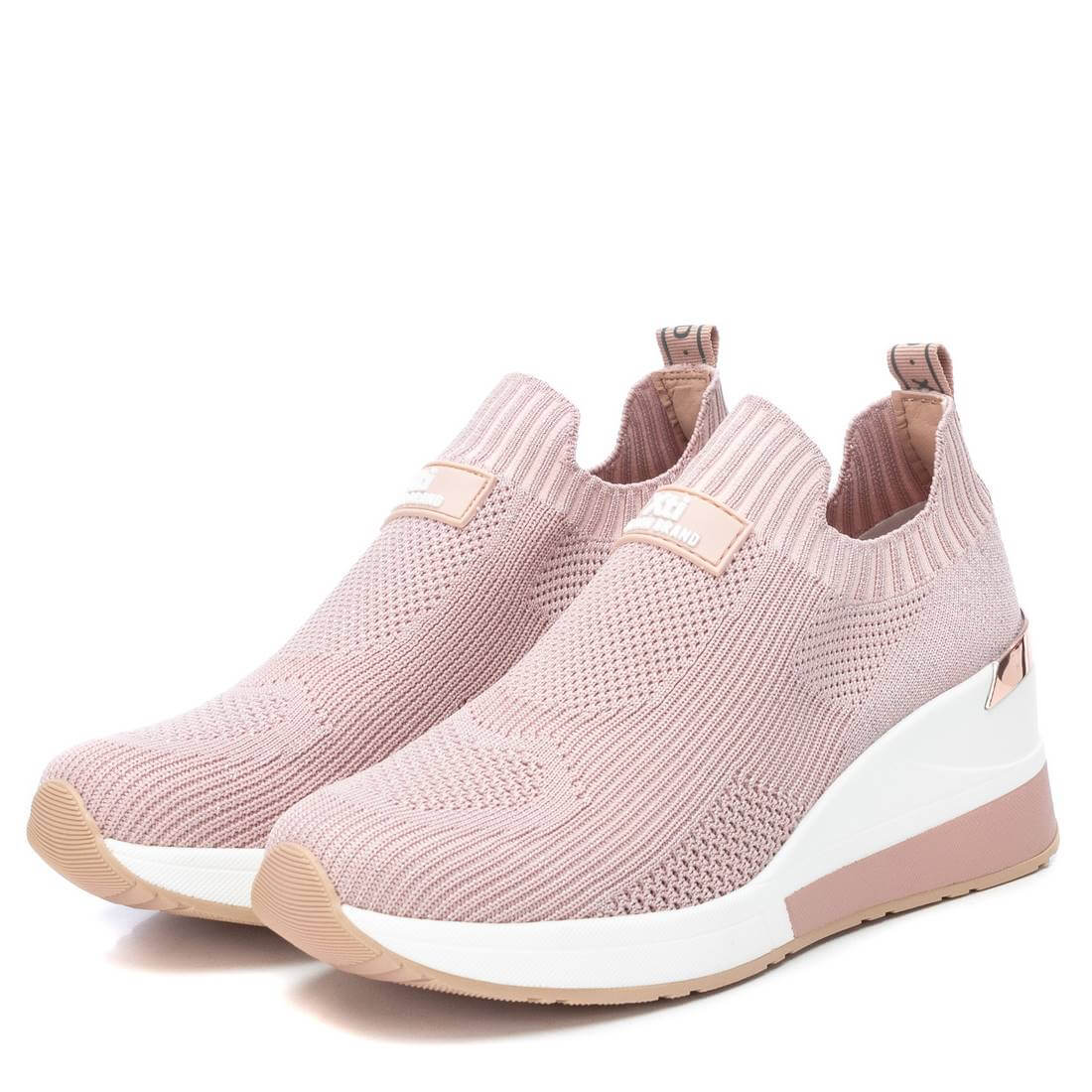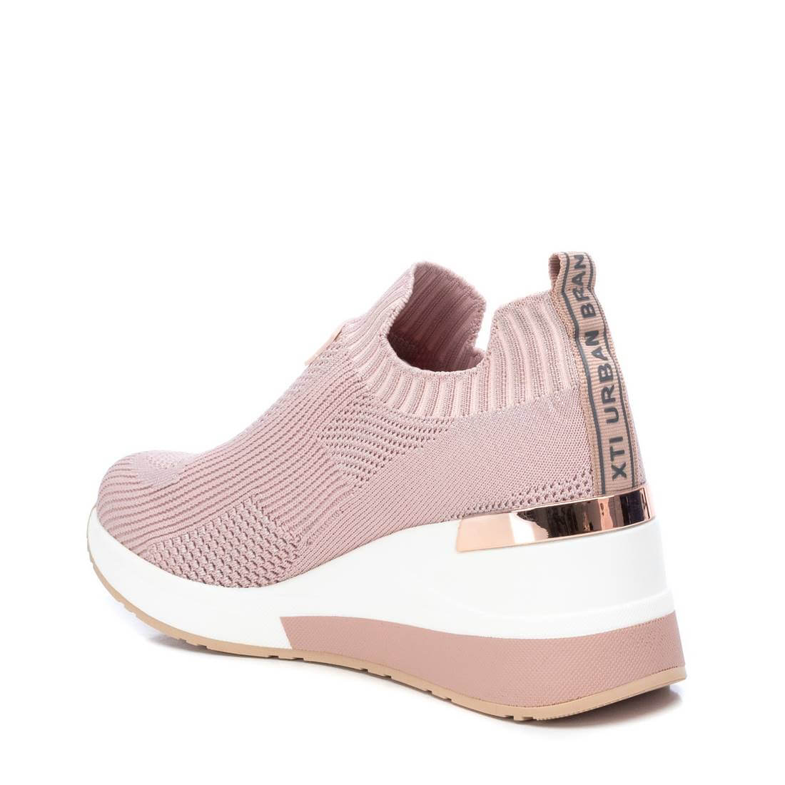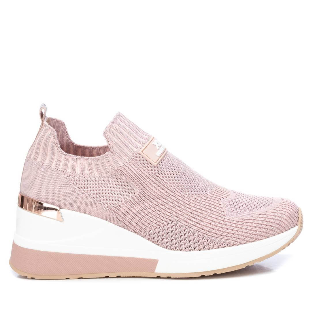A comfortable, athletic design for a sporty appearance. Ladies' sneakers from the Xti brand featuring elastic textile material with varying textures for easier wear. The 6 cm wedge is two-toned and has a non-slip rubber sole.