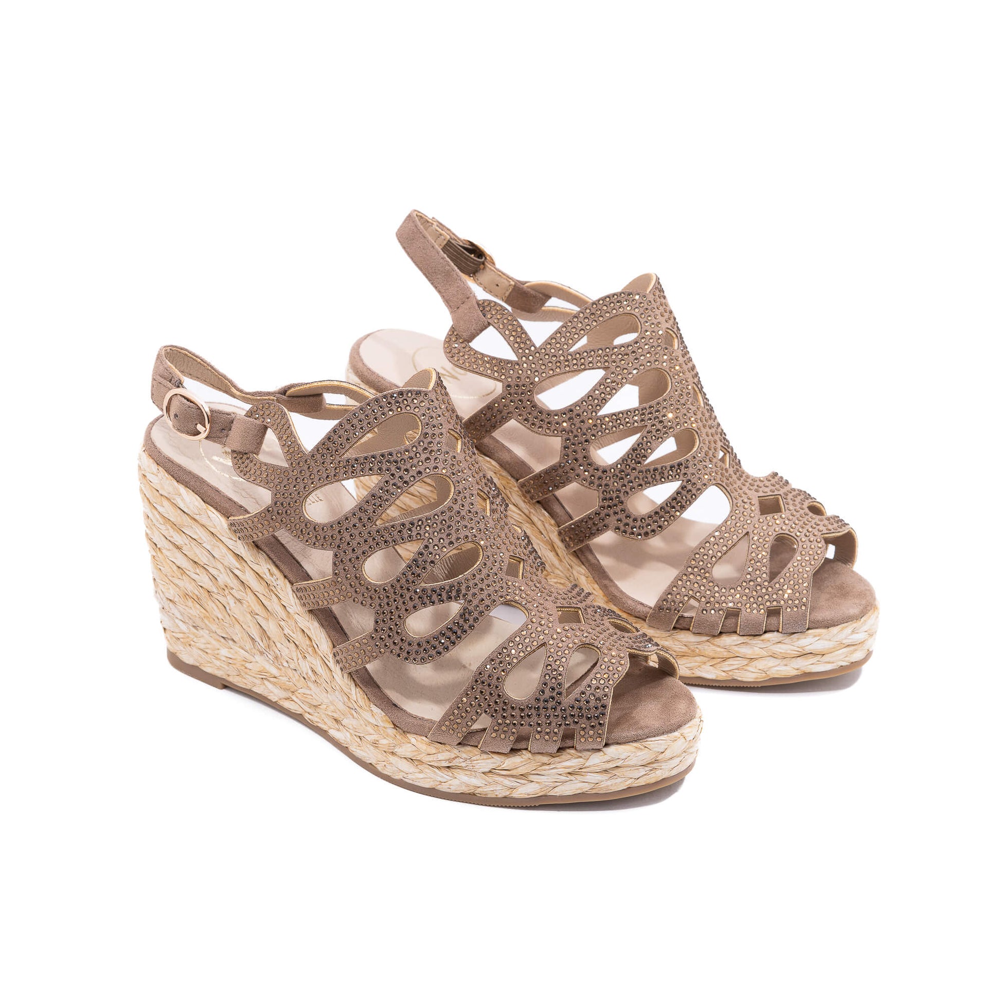 These expertly crafted sandals feature a luxurious fabric construction adorned with stones. A soft, padded footbed adds comfort, while the heel is elegantly covered in natural beige braided raffia. With a heel height of 10 cm, these sandals are both stylish and practical. Designed in Italy.