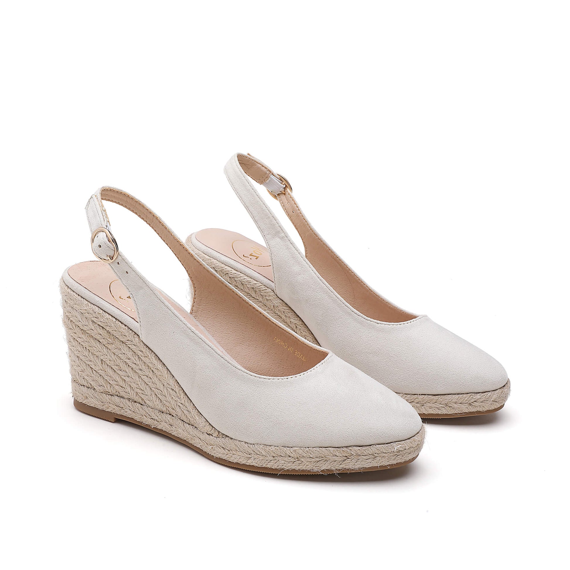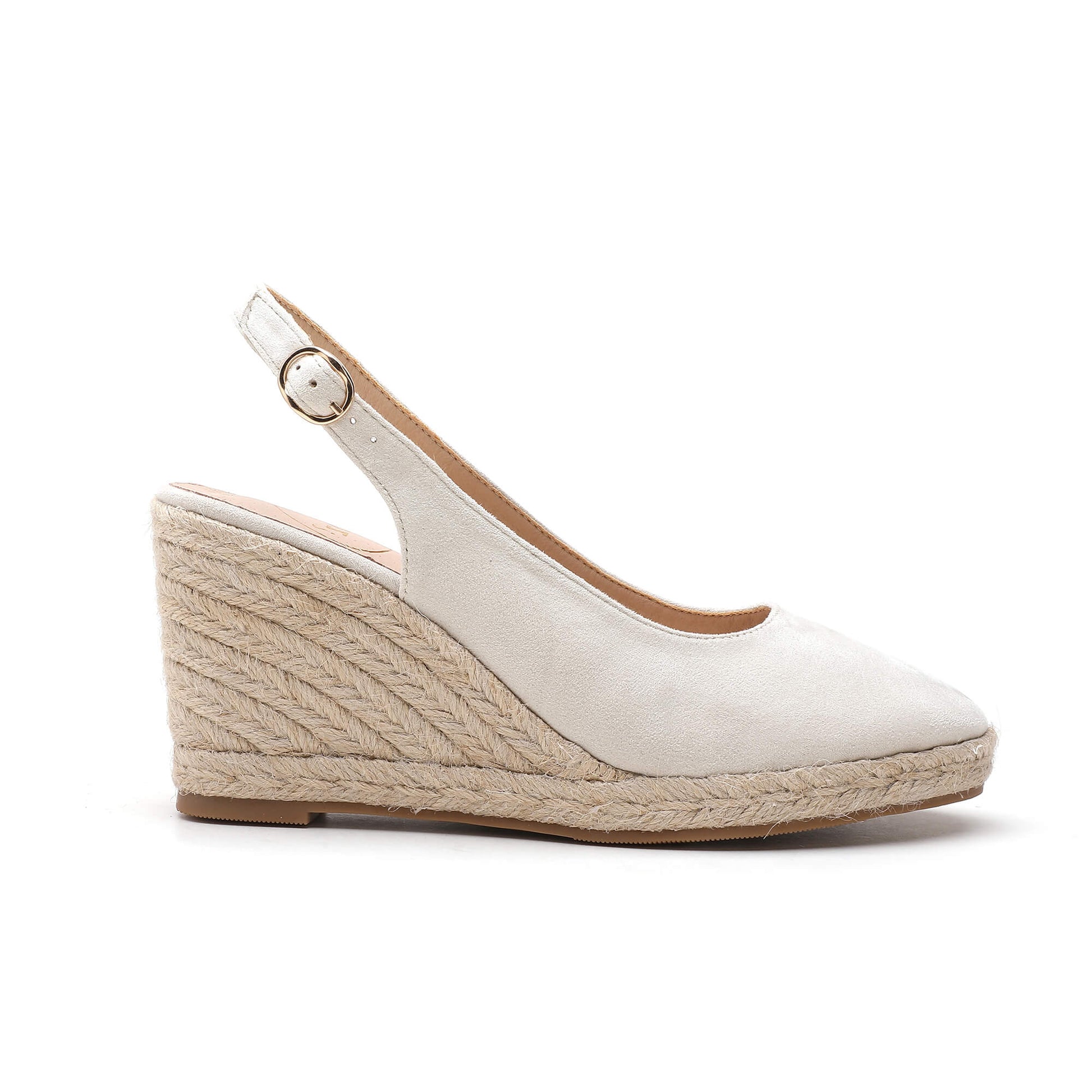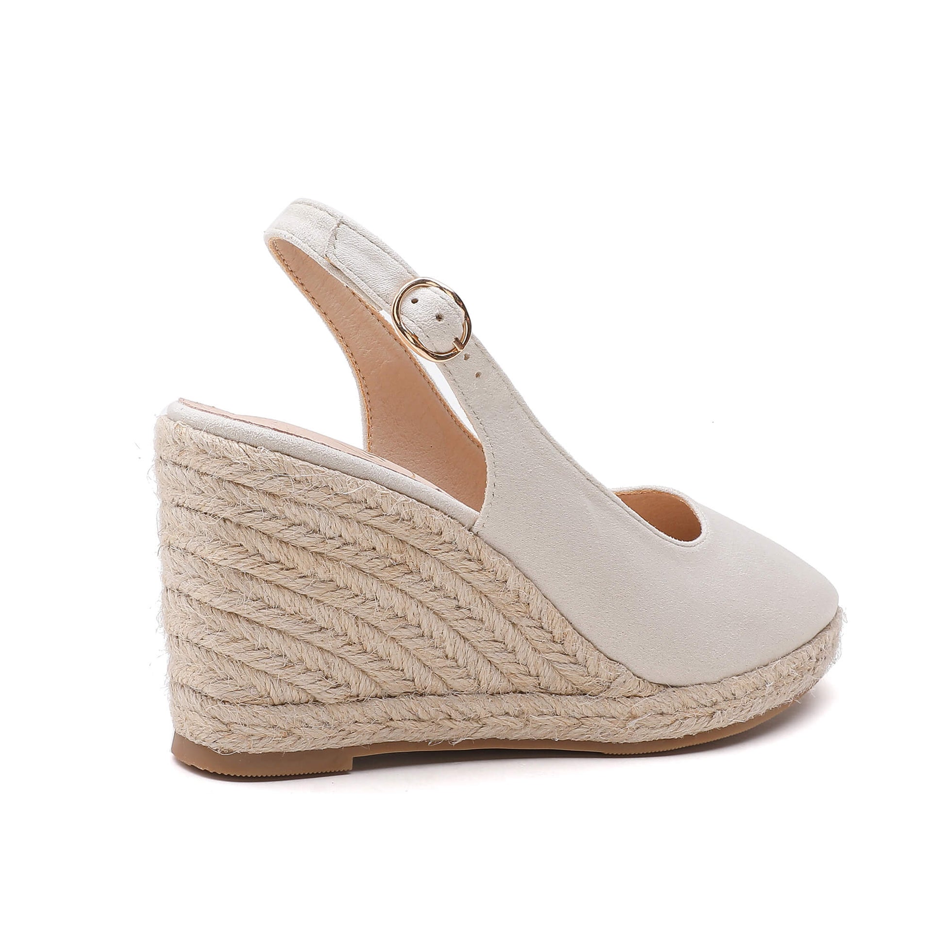 Elevate your style with the stunning ivory suede Elma Espadrilles. Enjoy a comfortable and relaxed walking experience with the soft padded footbed. The heel, measuring 7 cm, is covered in beige braided jute for a stylish touch. These elegant espadrilles were expertly designed in Italy.