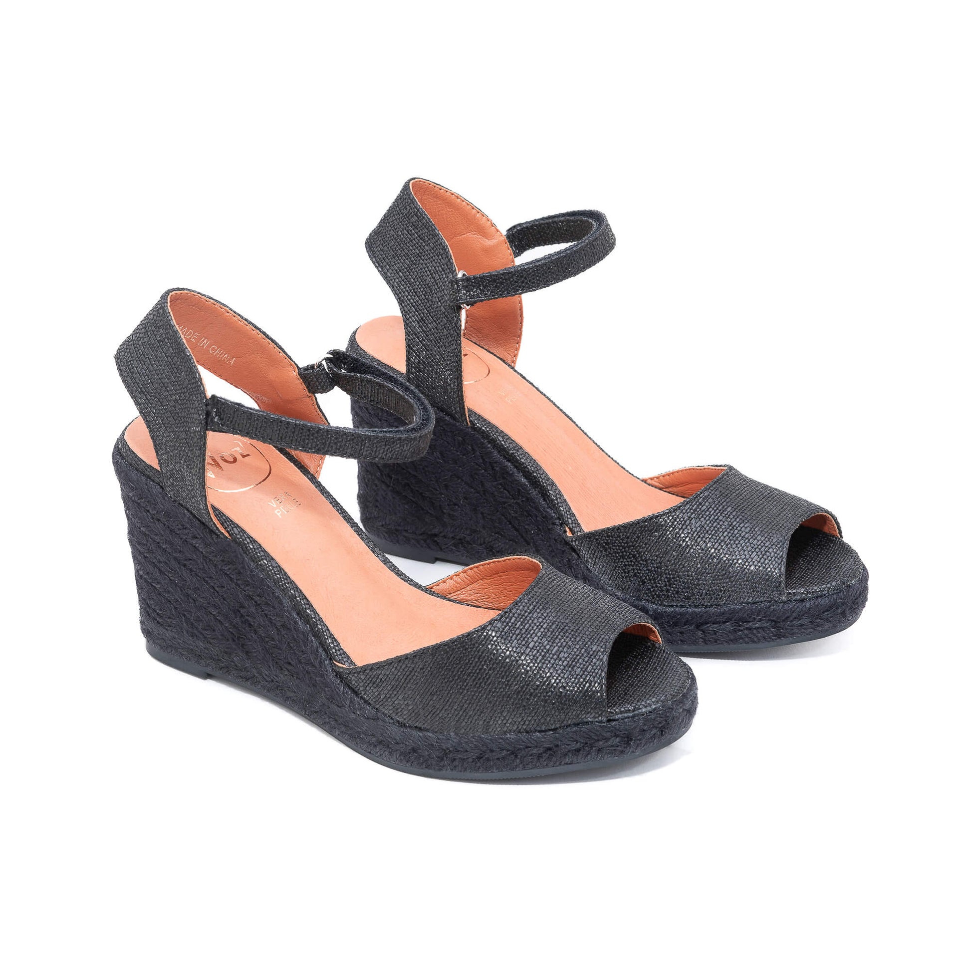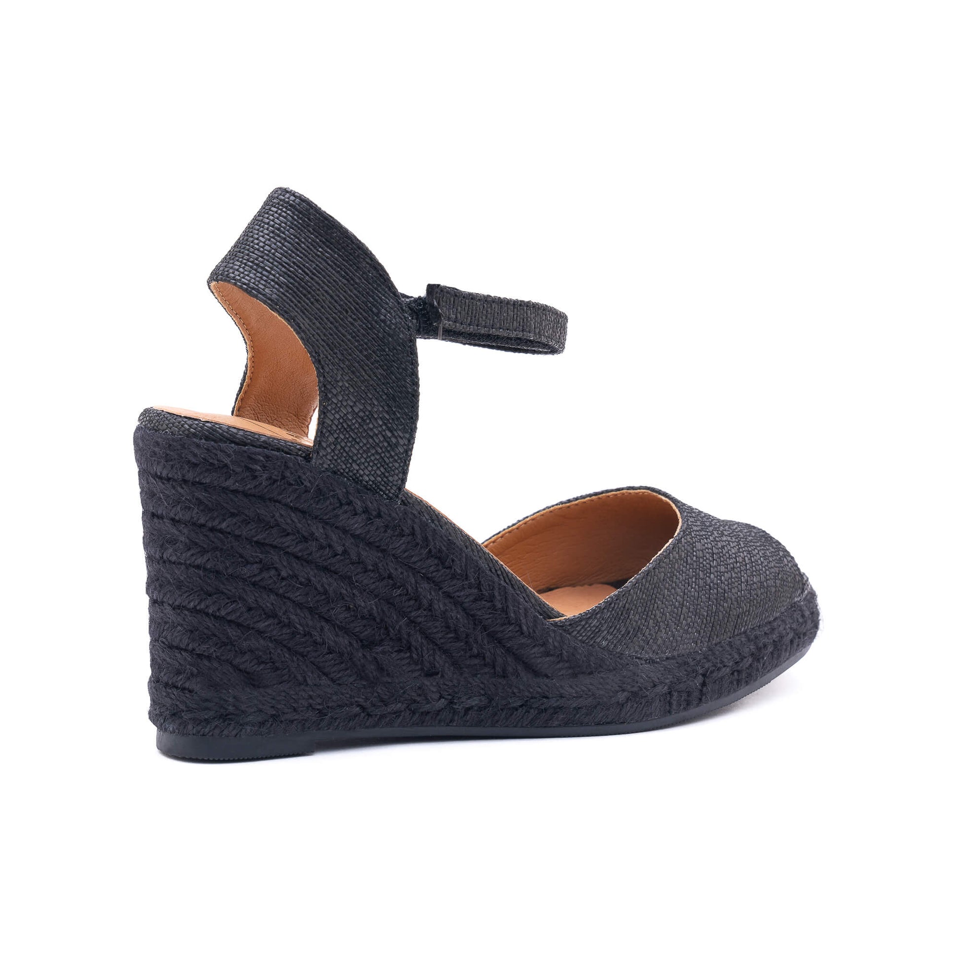 Elevate your look with Flora Black Espadrilles. Featuring an open toe, buckle fastening ankle strap, and soft padded footbed, these stylish wedges are designed in Italy. The heel is covered in a sleek black braided rope, with a height of 7 cm.