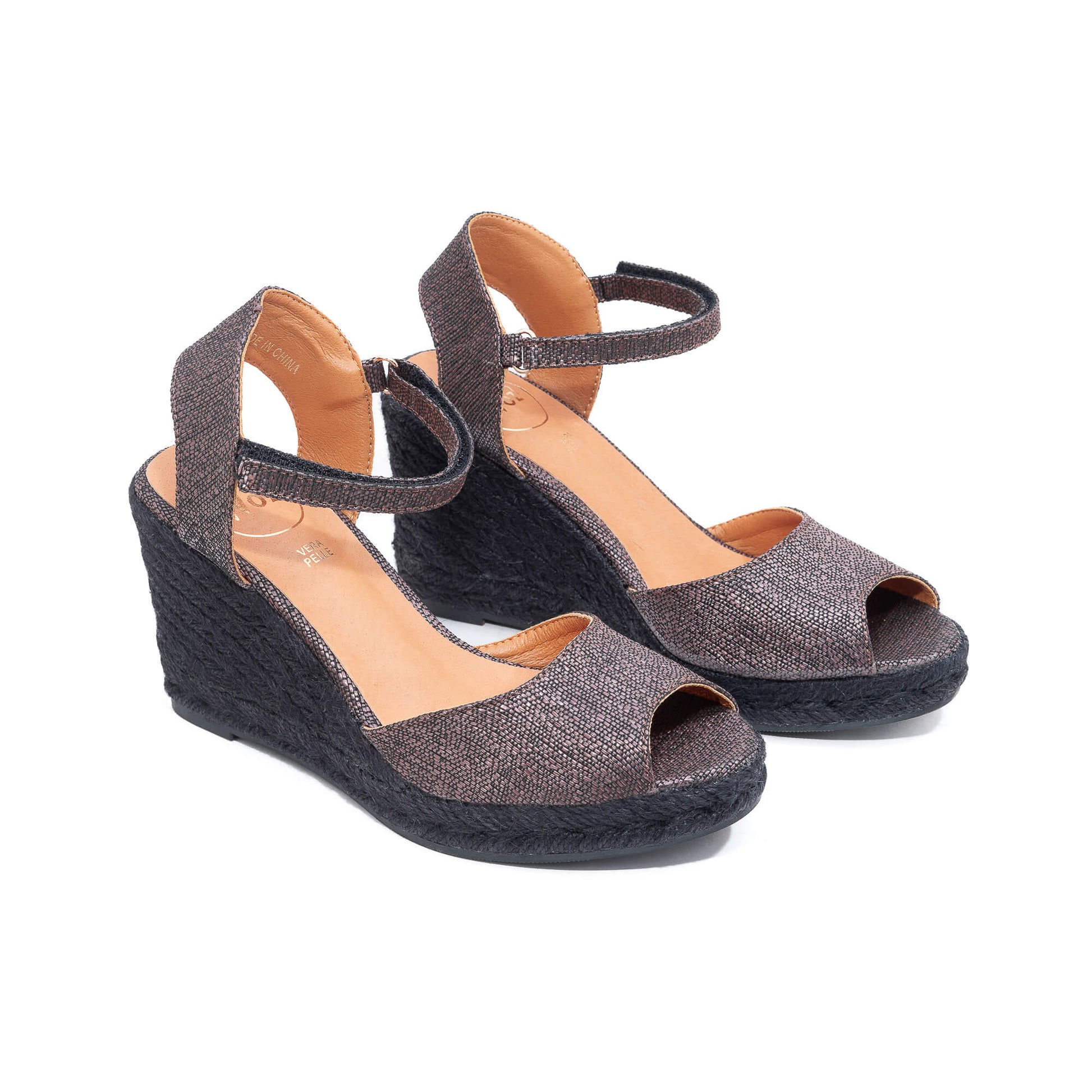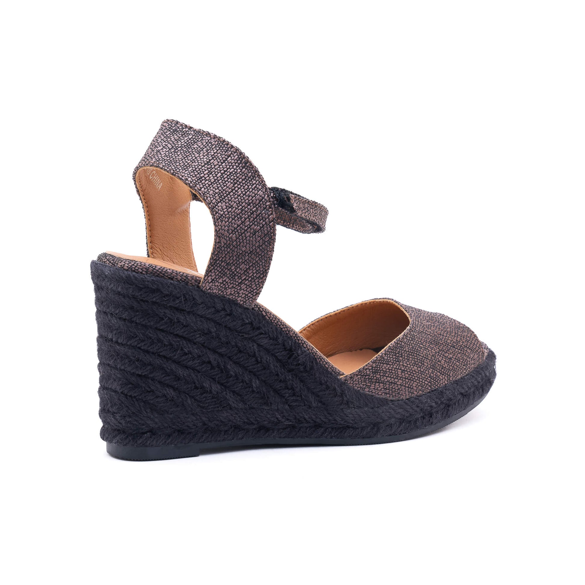 These stylish espadrille wedges feature an open toe and velcro fastening ankle strap, with a soft padded footbed for comfort. The heel is adorned with a black braided rope and has a height of 7 cm. This design was created in Italy.