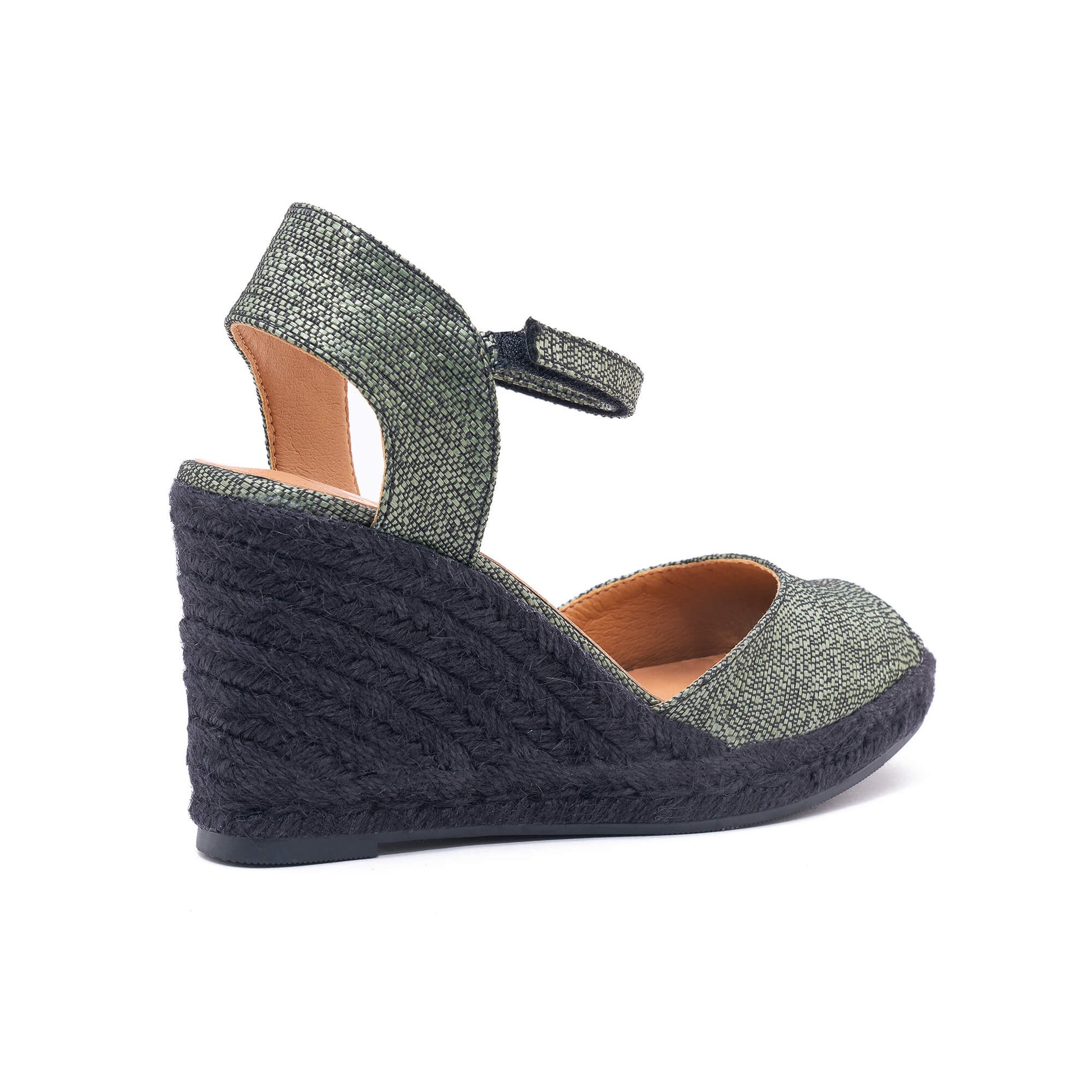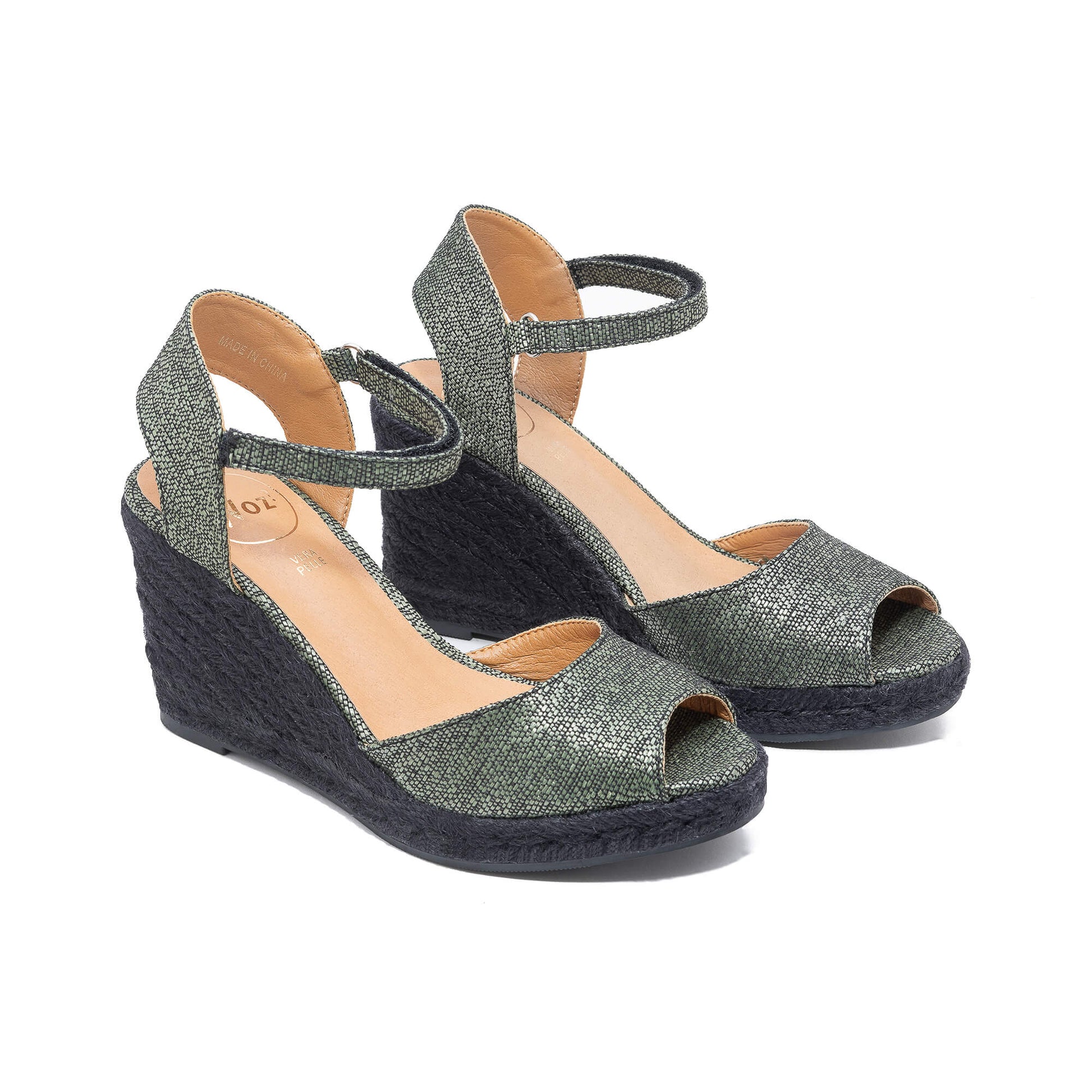 These stylish espadrille wedges feature an open toe and a velcro fastening ankle strap. With a soft padded footbed and a 7 cm heel covered in black braided rope, these shoes were expertly designed in Italy.