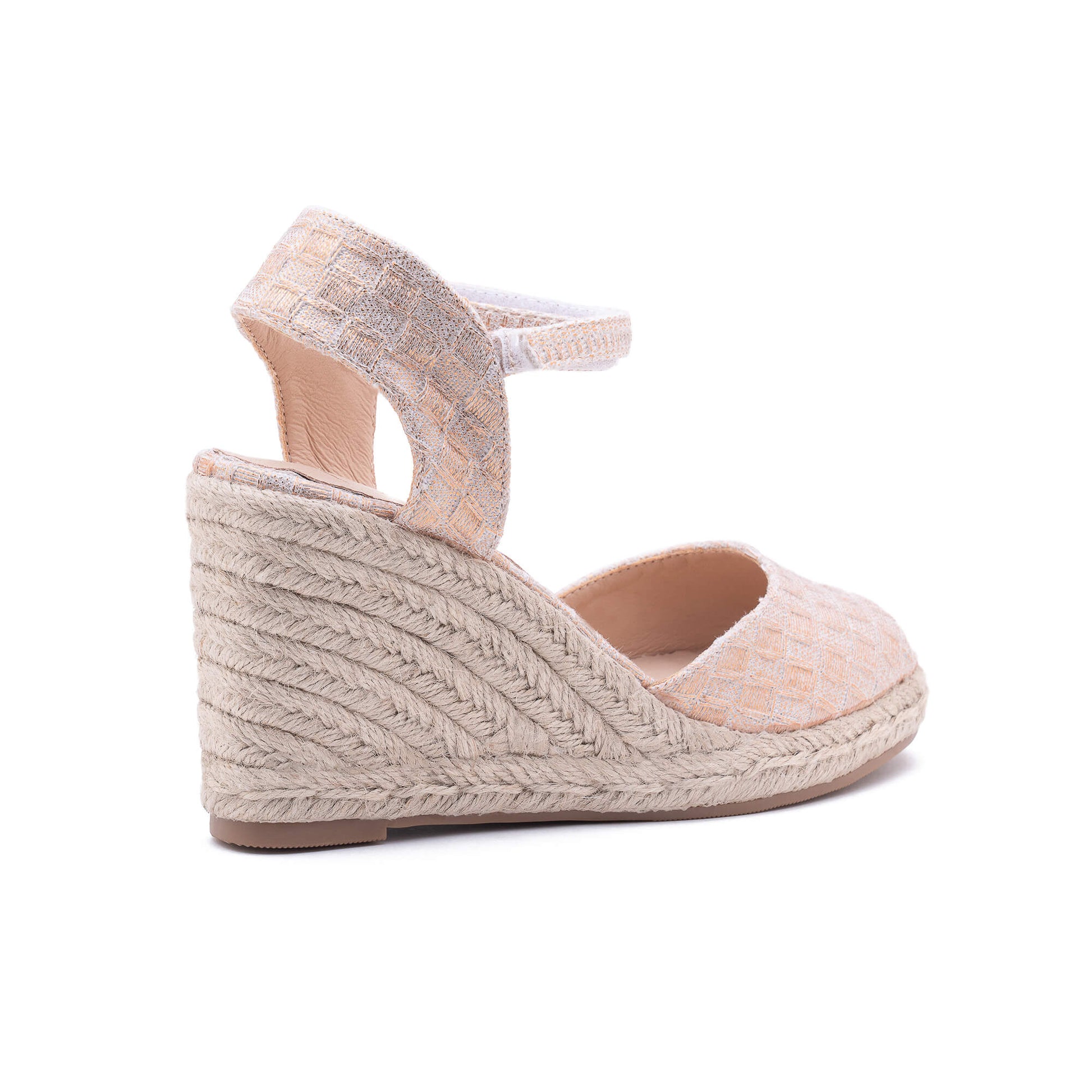 These Flora Rose Gold Espadrilles feature a trendy open toe design and a comfortable wedge heel. The ankle strap fastens with a buckle, while the heel is covered in a natural beige braided rope. The footbed is soft and padded for added comfort. With a heel height of 7 cm, these stylish shoes were designed in Italy.