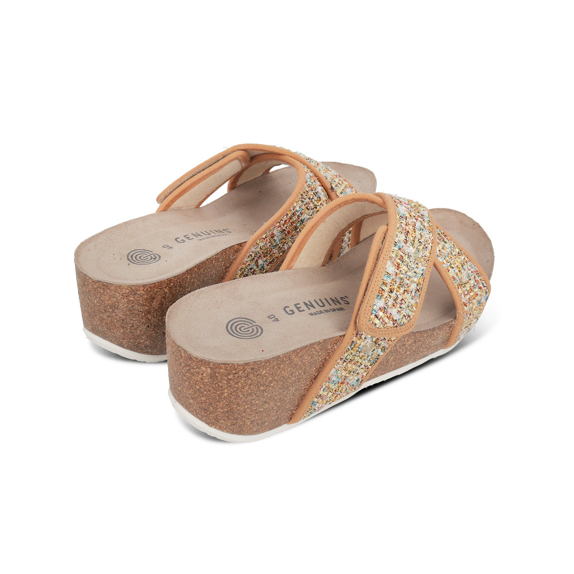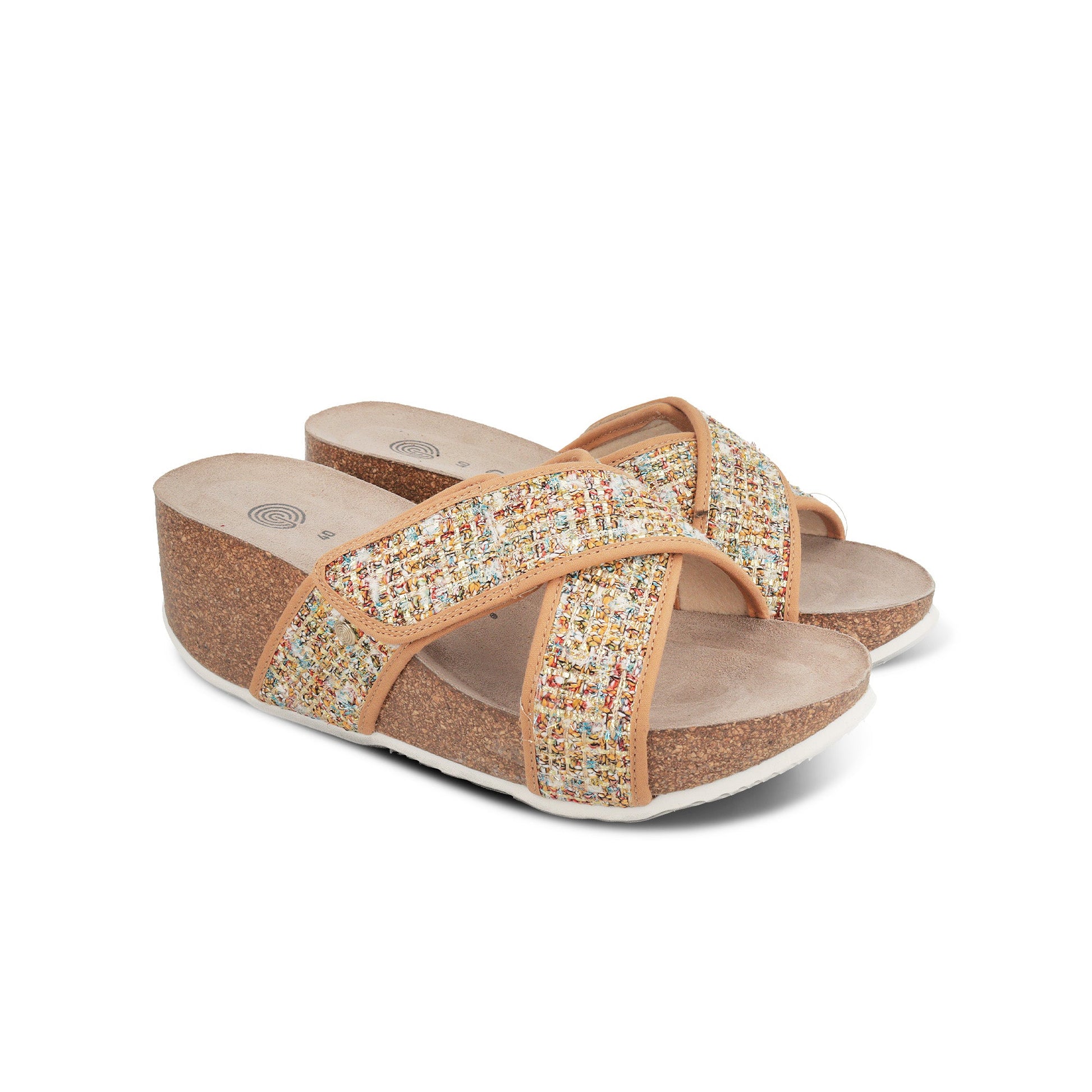 Experience comfort on a whole new level with Benicasim's Caramel Sandal. The anatomical cork and Eva outsole, expertly hand crafted in Spain, provide stability and durability. The adjustable velcro straps, made from stylish fabric, add a touch of convenience to this reliable sandal.