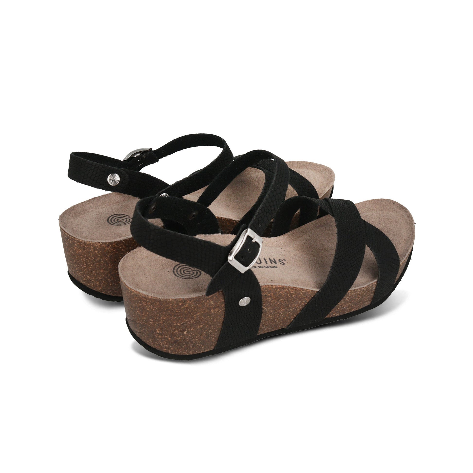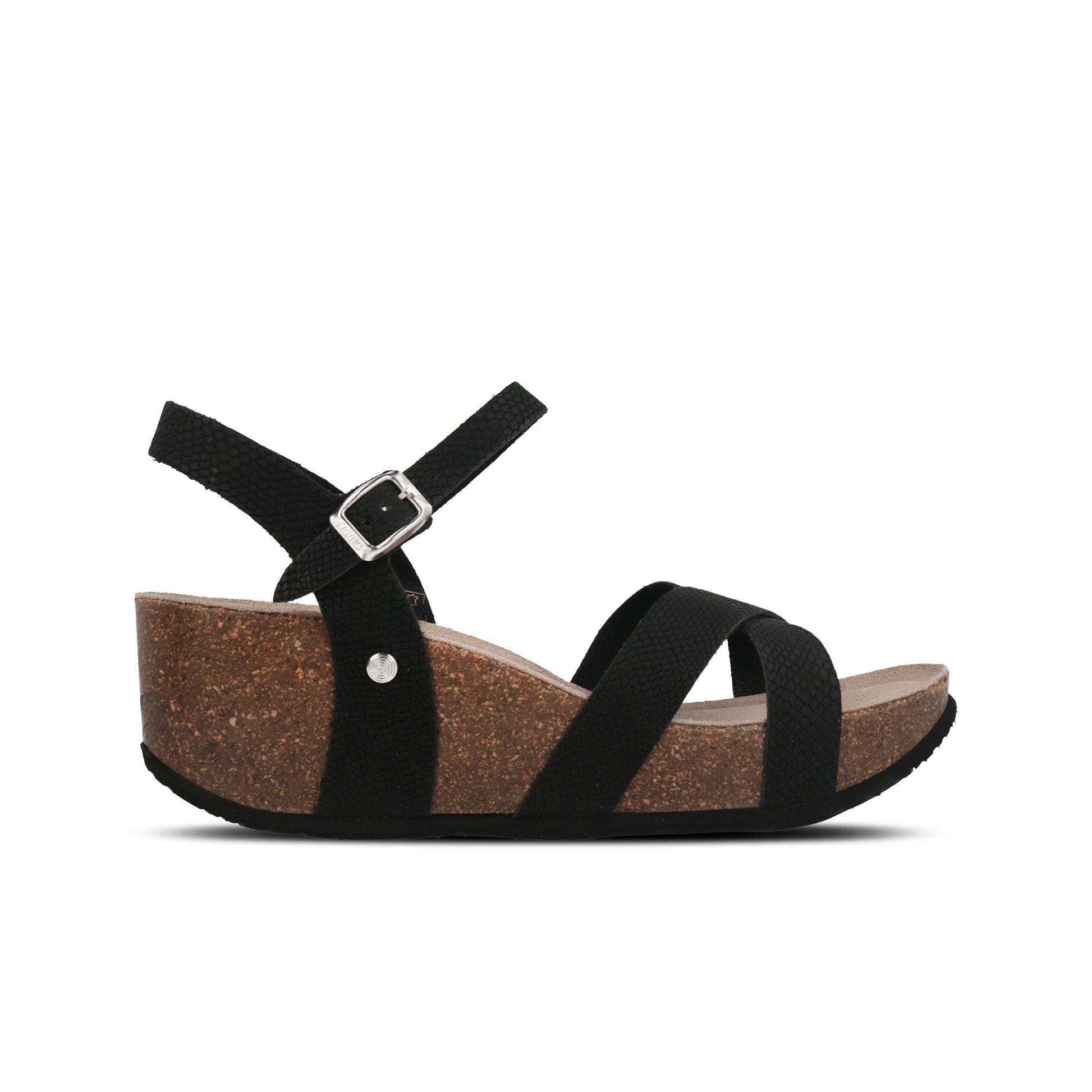 Crafted from a leather upper and fastened with a metal buckle around the ankle, the Camille Black Sandals feature two crossed straps at the front. The heel height of 7 cm is supported by an anatomical plant made of soft cork, providing comfort and stability. These sandals are completed with an EVA outsole and are proudly made in Spain.