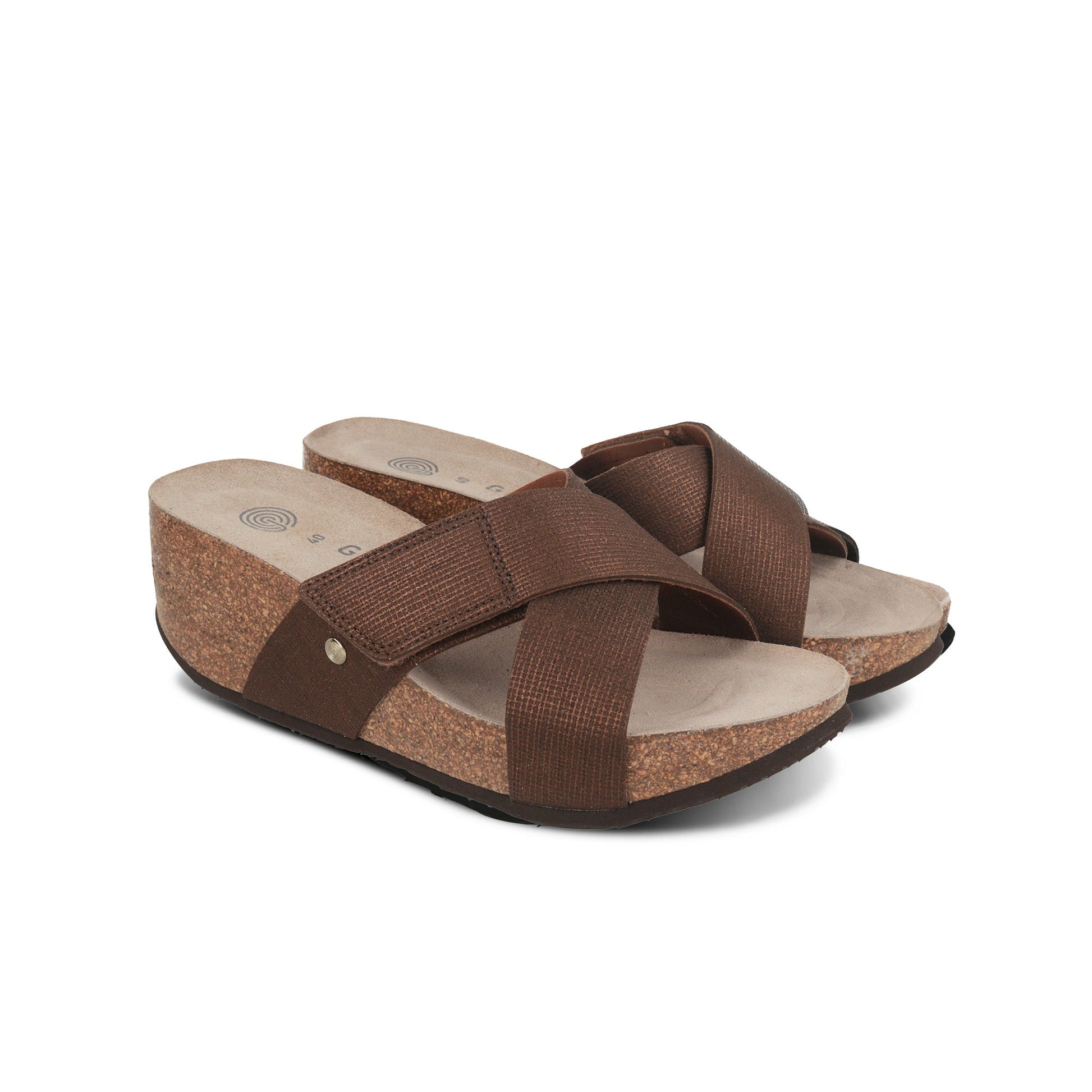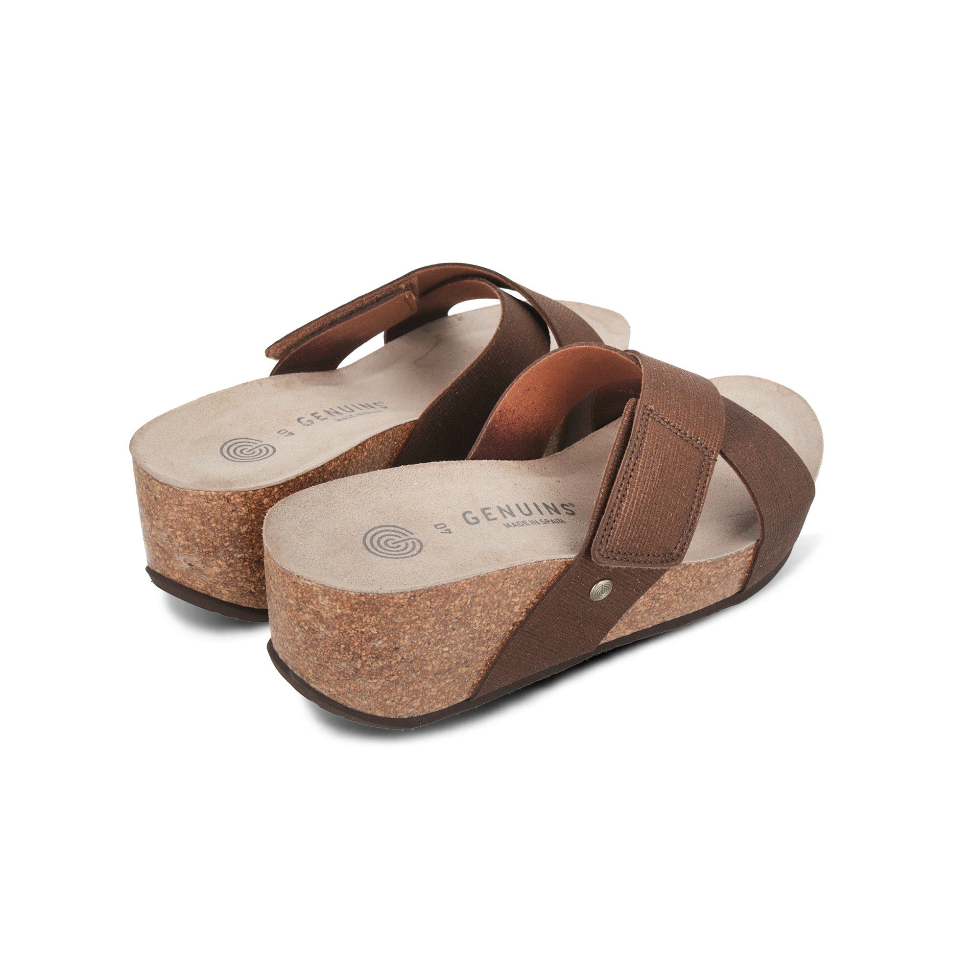 The Benicasim Bronze Sandal offers the convenience of adjustable velcro straps and a 7 cm anatomical cork and Eva outsole for optimal comfort and stability. This sandal is expertly crafted in Spain for long-lasting quality.