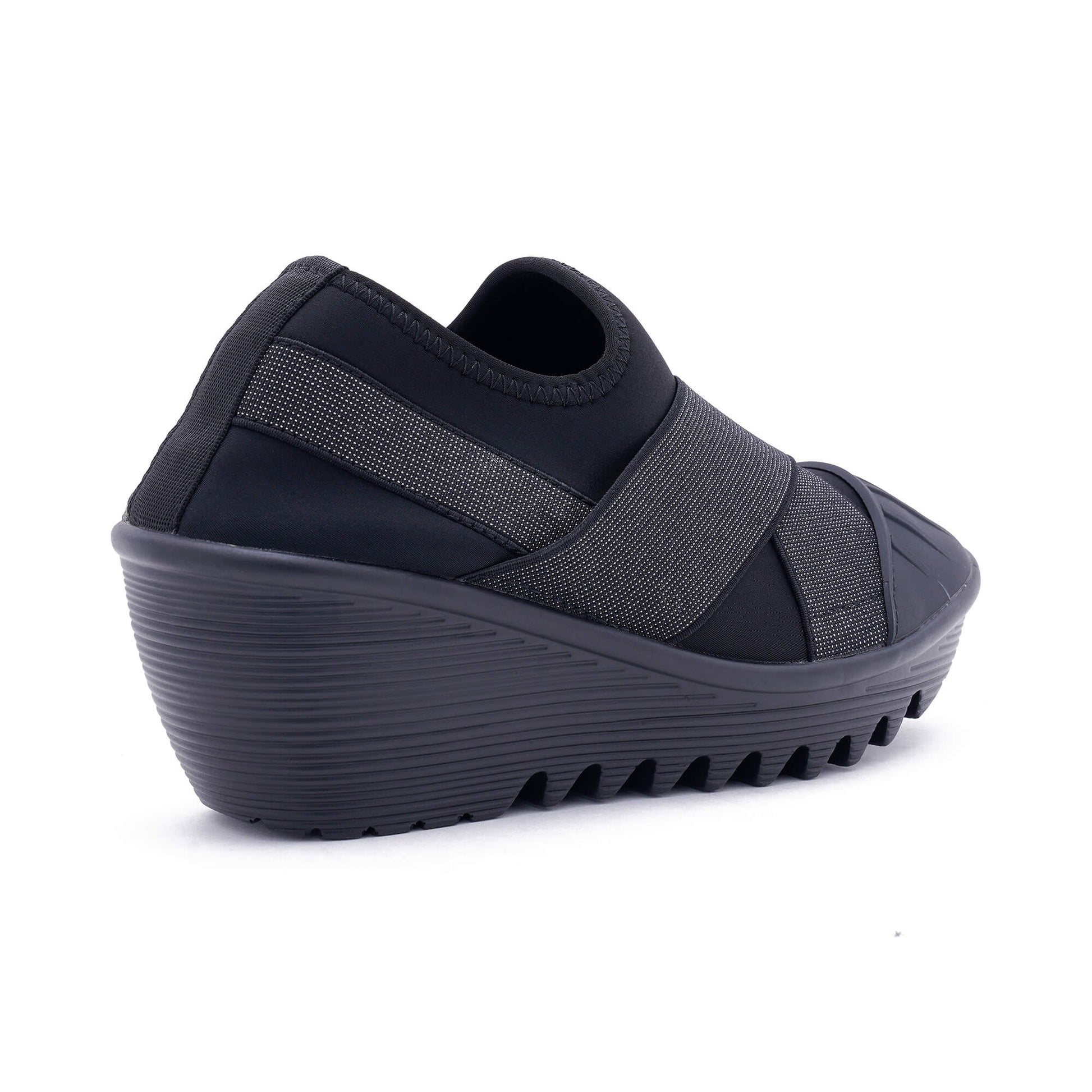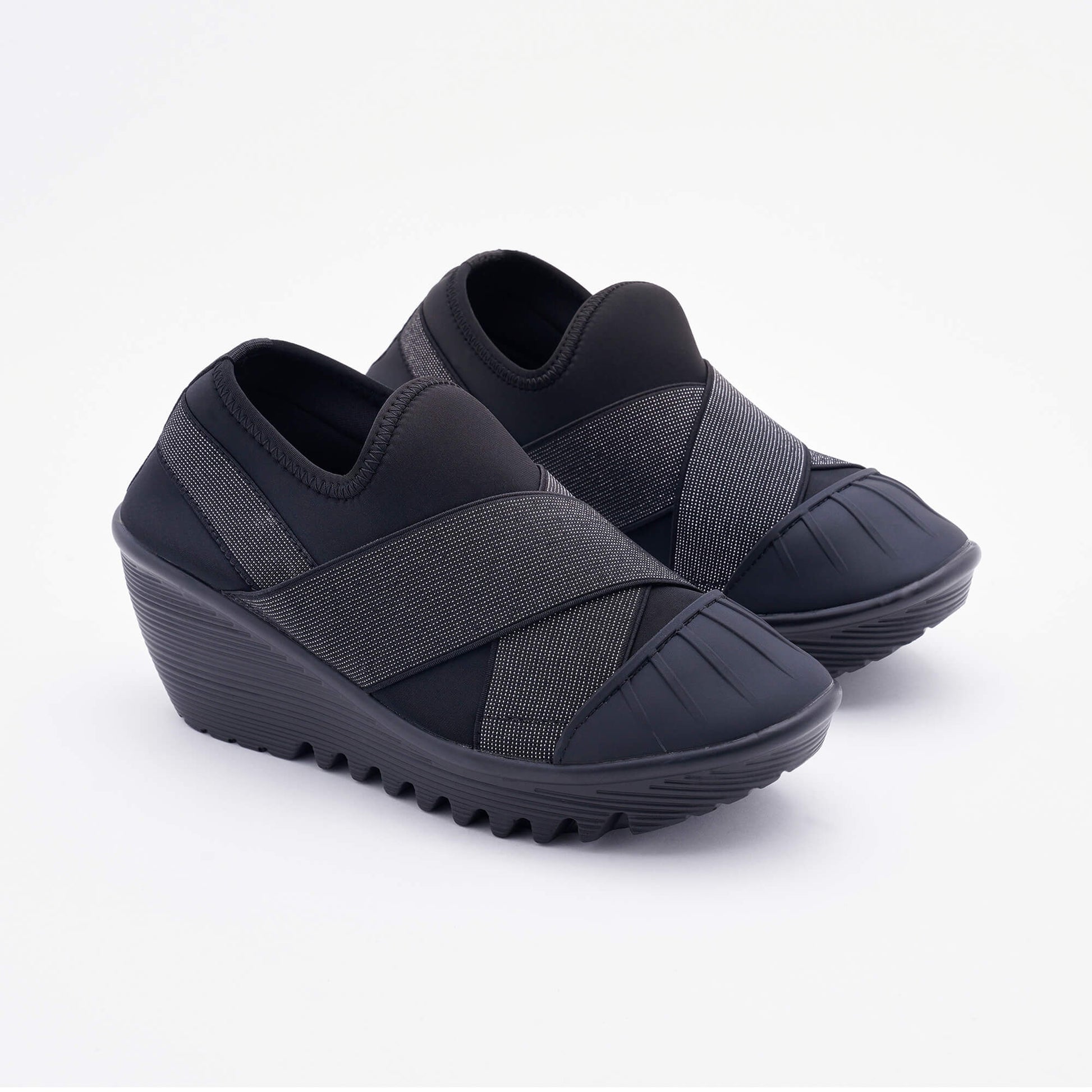 This wedge is designed in Italy and features a slip on style, perfect for everyday wear. The black lycra fabric offers a sleek and durable look, while the upper elasticated straps provide a secure fit. The soft padded footbed ensures comfort with each step, and the textured outsole offers better grip. With a heel height of 7 cm, this shoe is both stylish and practical.