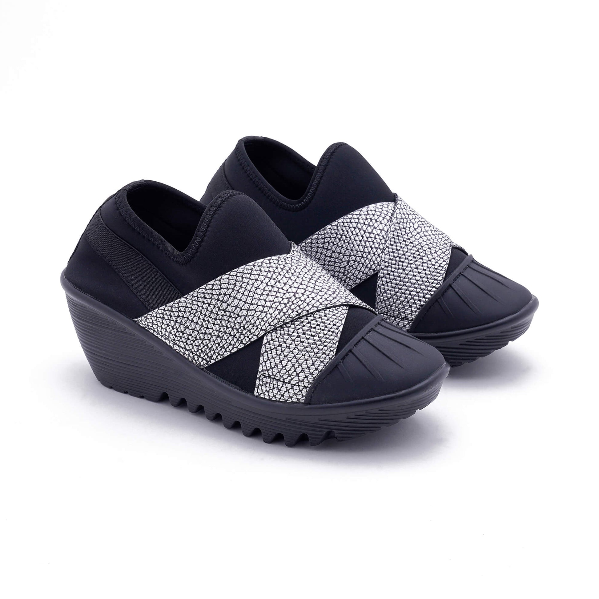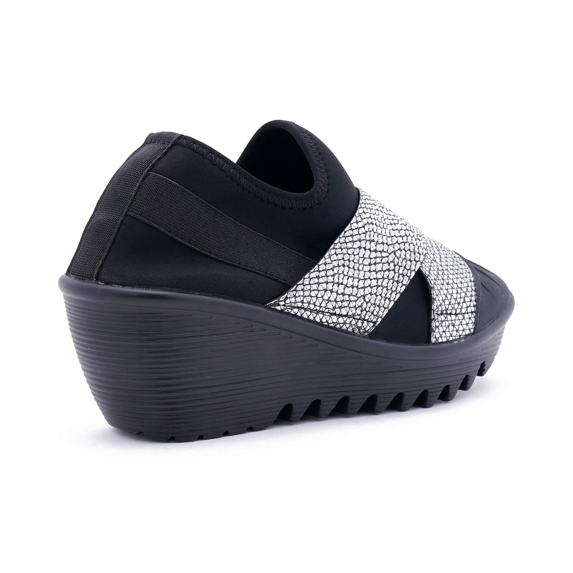 The Geneva Black Silver Wedge Heel is a slip-on shoe that features a black lycra fabric construction with cross over straps and a padded footbed. Its textured outsole provides superior grip for each step while the heel stands at a height of 7 cm. This stylish wedge heel was expertly designed in Italy.