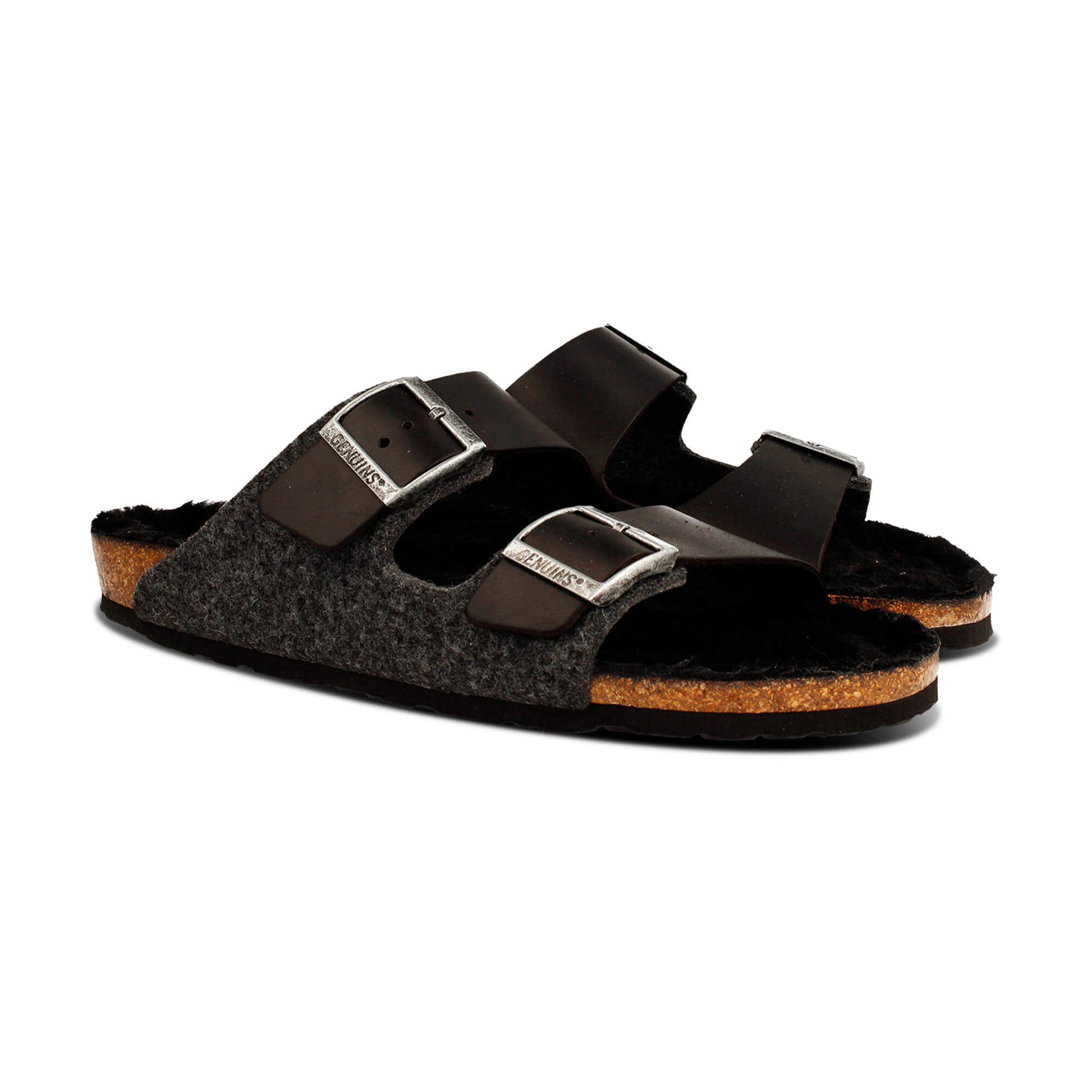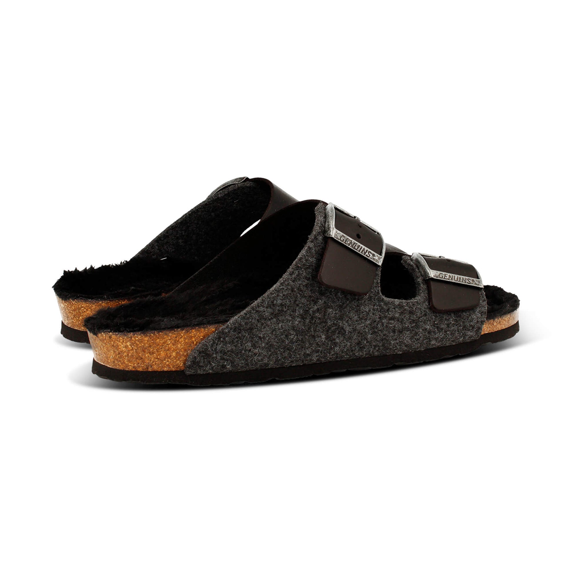 Crafted from wool and featuring two adjustable buckles, these authentic Hawaii Black Gray Sandals offer superior comfort with their natural cork and foam construction and cozy black synthetic fur lining. Expertly made in Spain, they are finished with an EVA outsole for added durability.