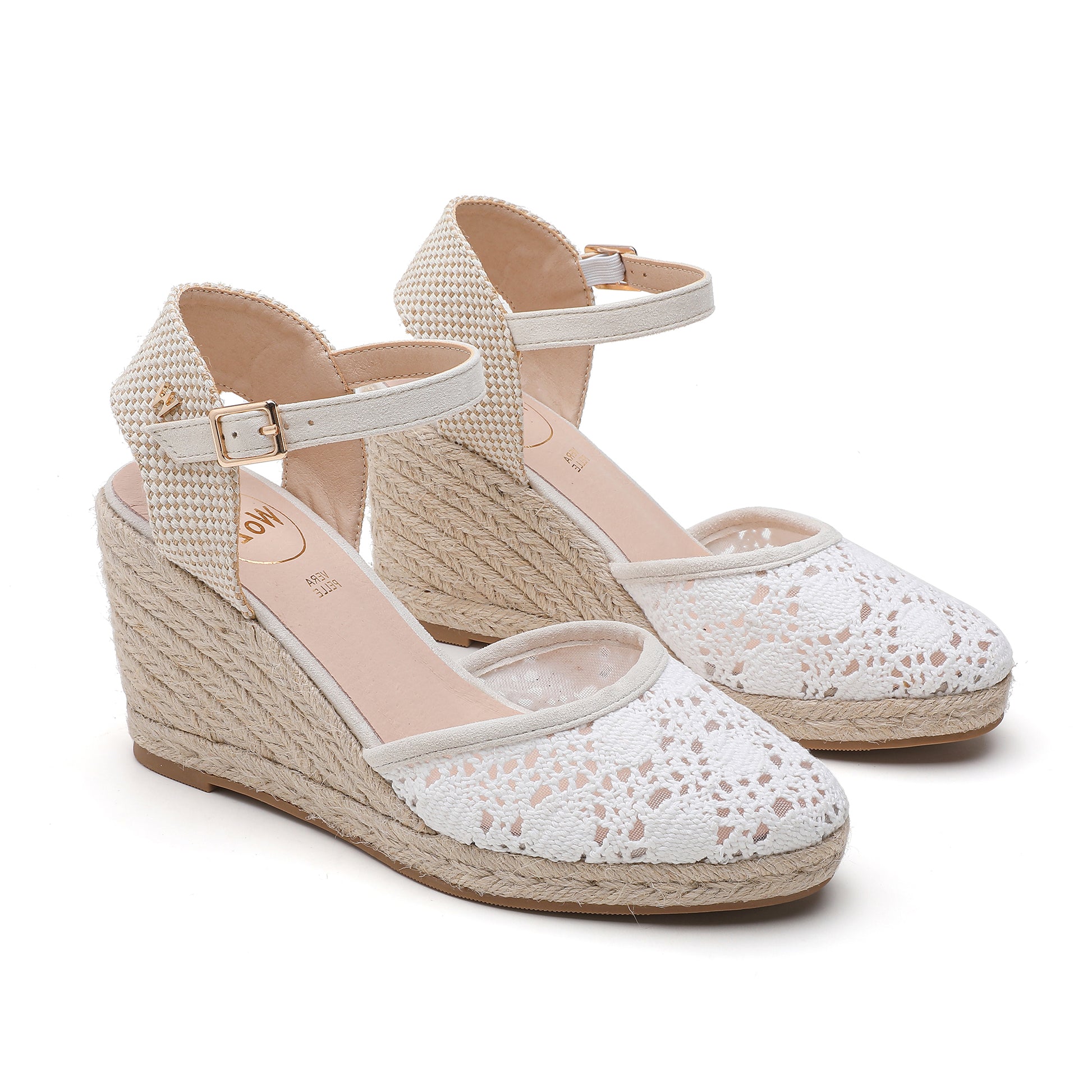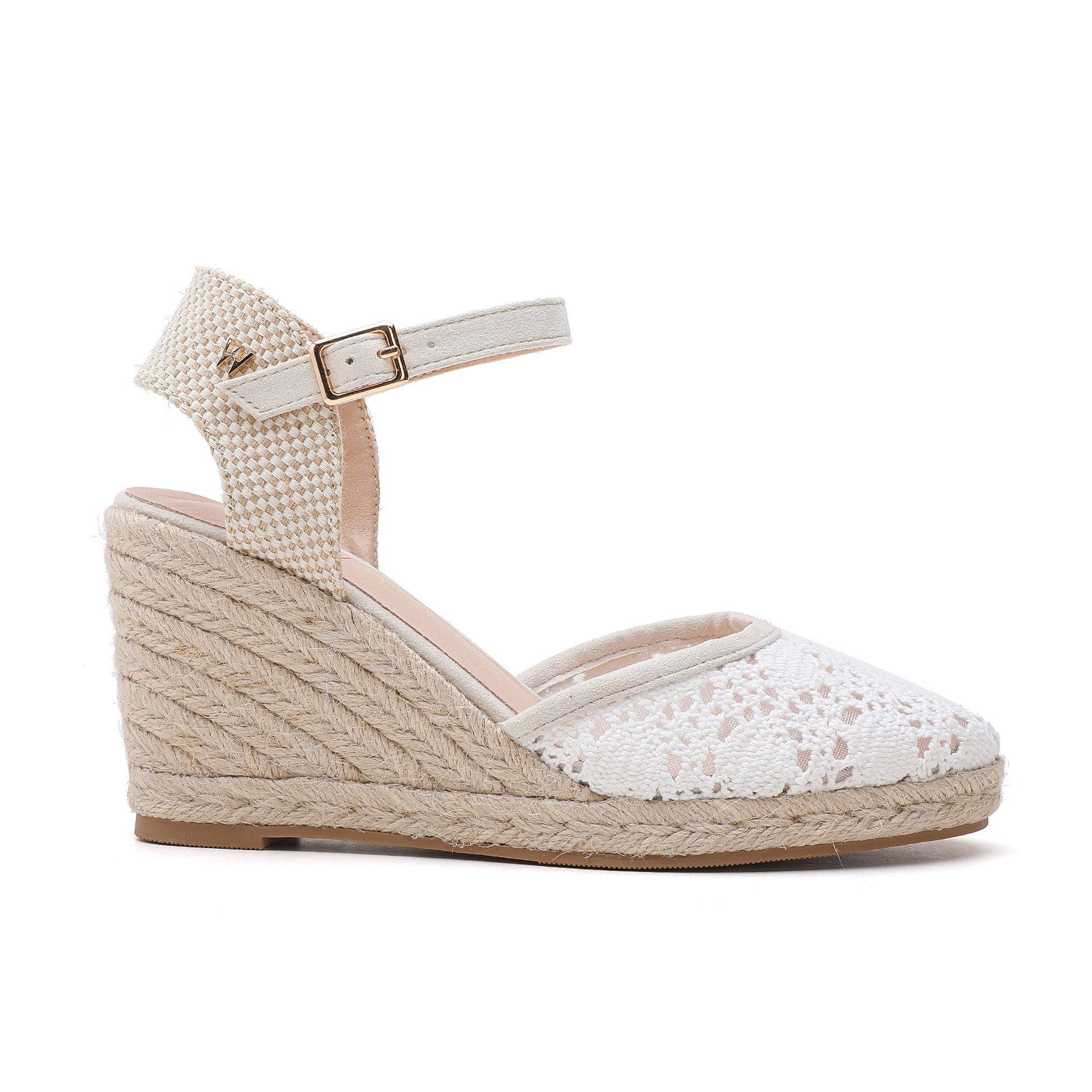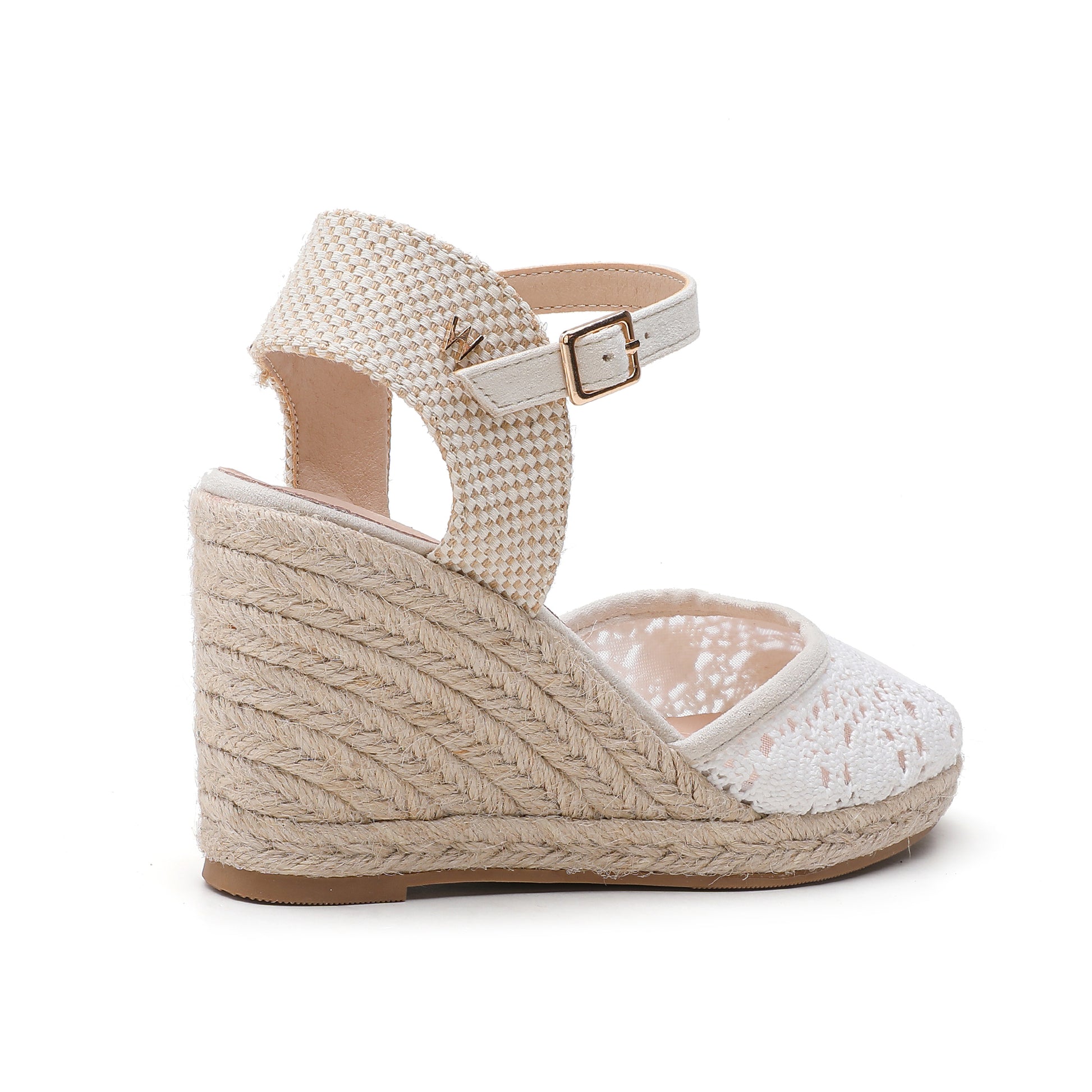 Crafted with a timeless crochet upper, secured by a buckle fastening ankle strap. Experience ultimate comfort with a soft padded footbed, while the heel remains elegantly wrapped in natural beige braided rope. With a heel height of 7 cm, these espadrilles were expertly designed in Italy.