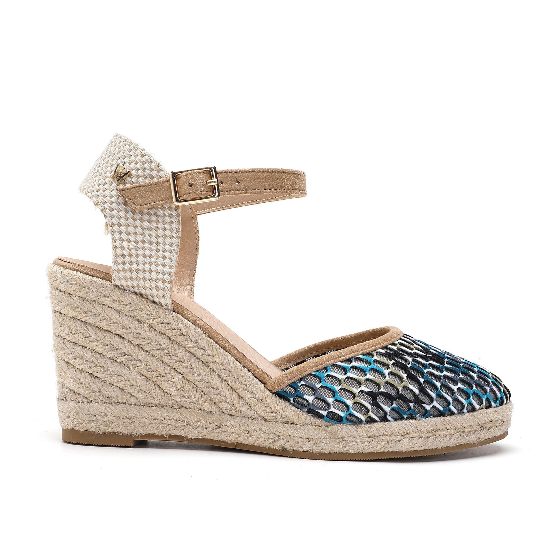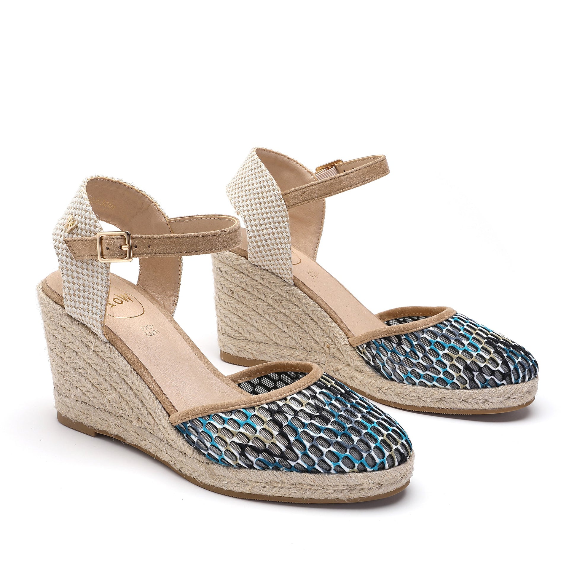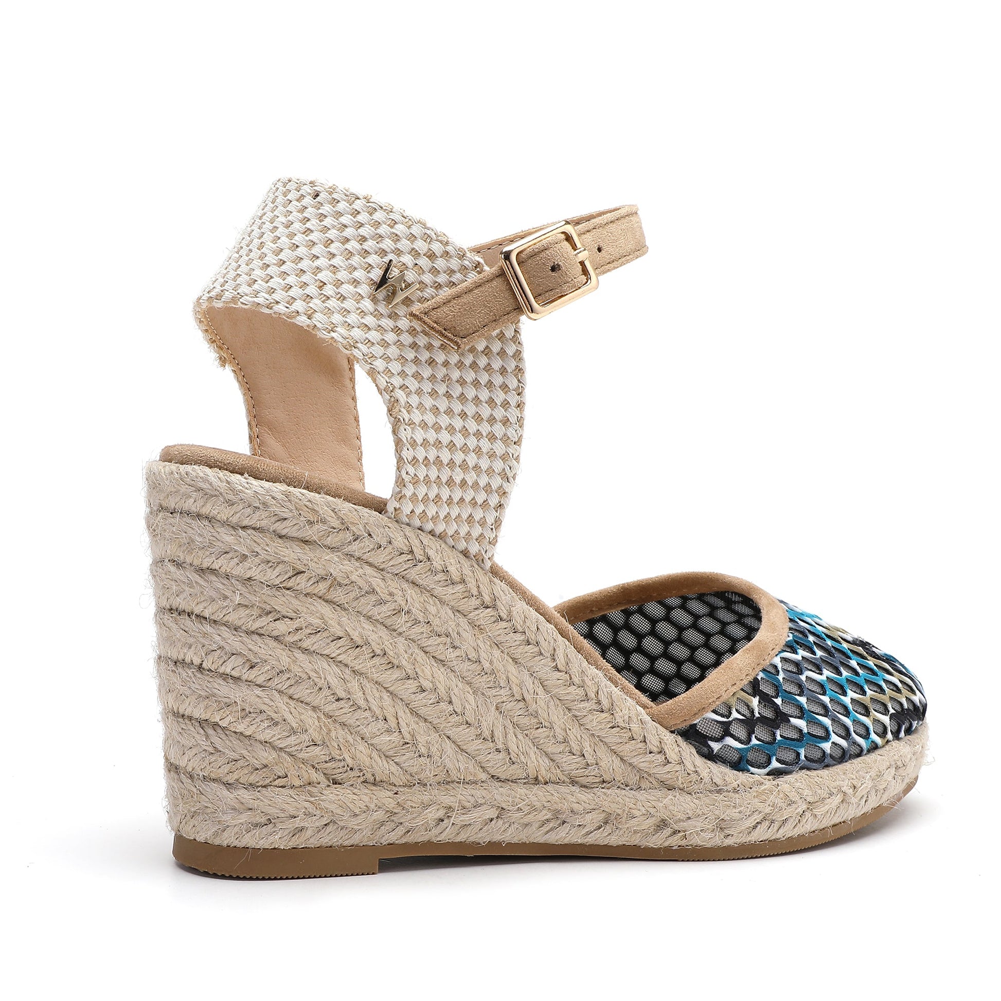 This expertly-crafted espadrille wedge features a durable mesh fabric construction and a comfortable, cushioned footbed. The adjustable ankle strap with buckle closure ensures a secure fit. With a sleek heel height of 7 cm, these shoes are designed in Italy for optimal style and quality.