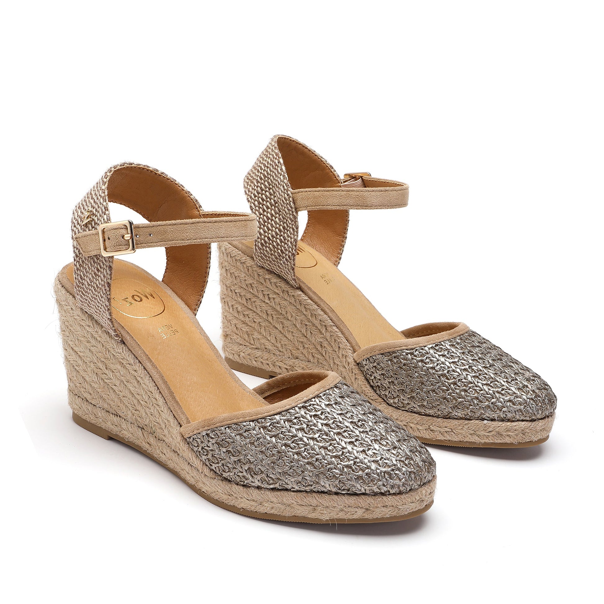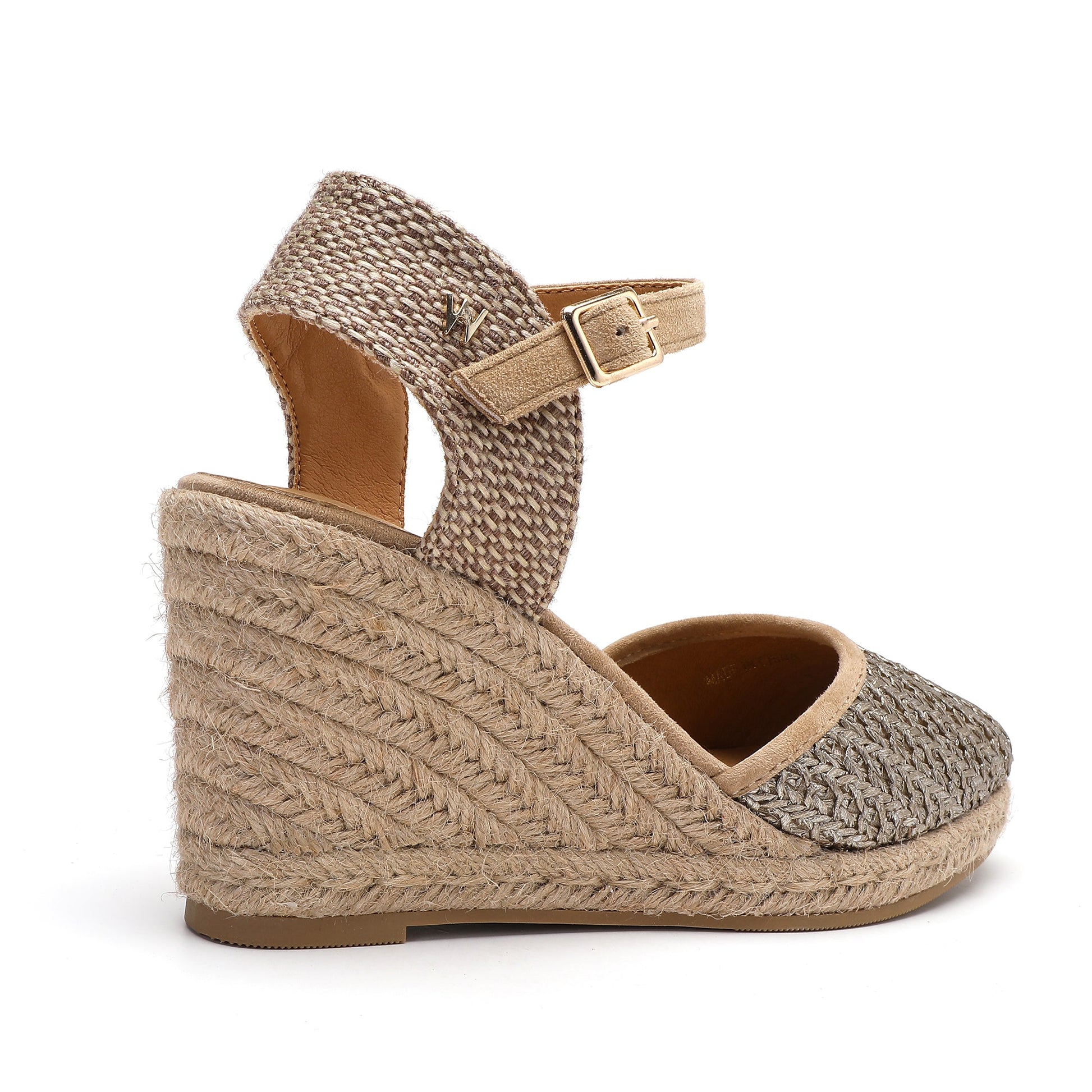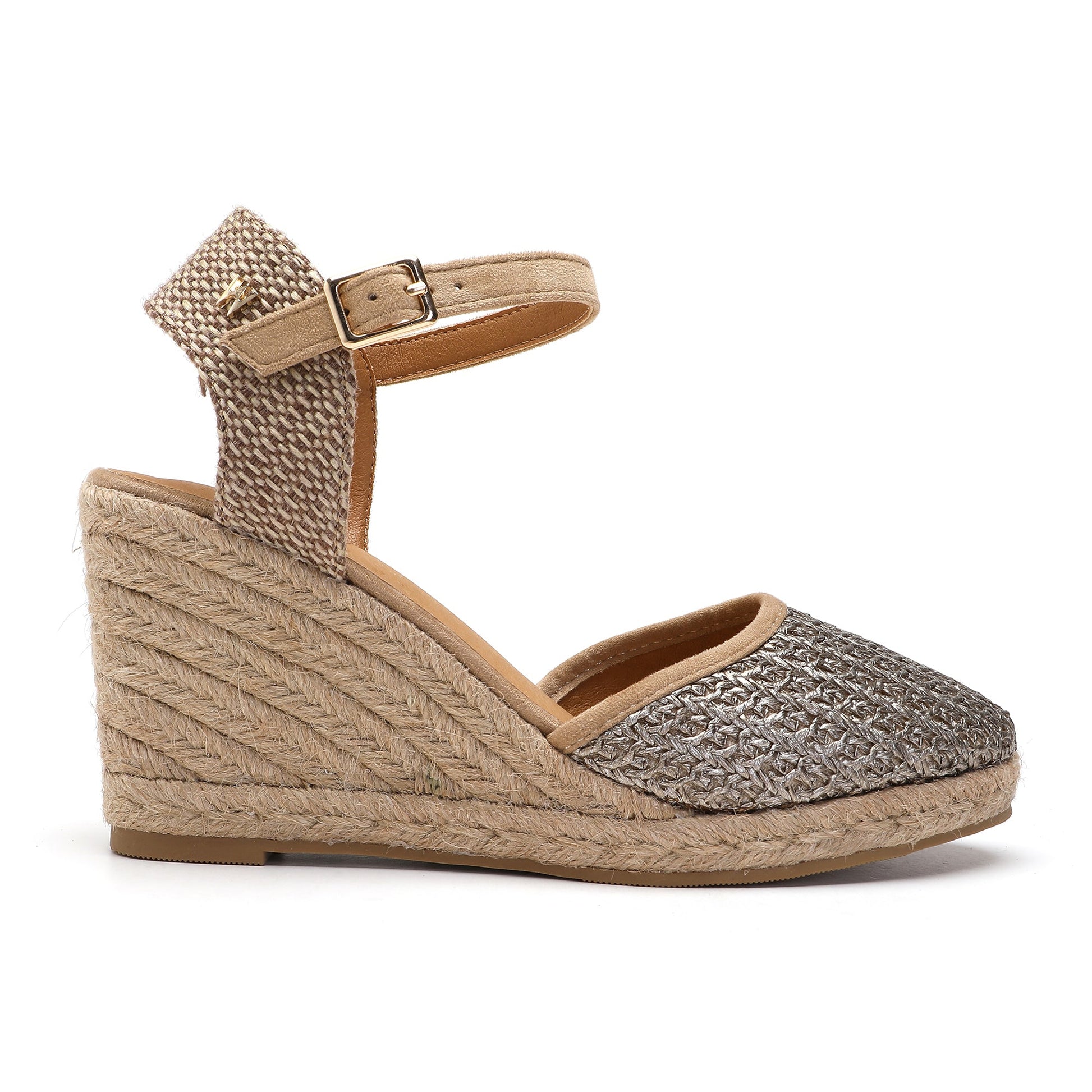 The Joy Taupe Espadrilles boast a sophisticated wedge design, crafted with a fabric and raffia upper and a 7 cm heel wrapped in natural jute. A buckle adjustable ankle strap adds practicality while a soft padded footbed ensures comfort. This trendy footwear was expertly designed in Italy for unbeatable style.
