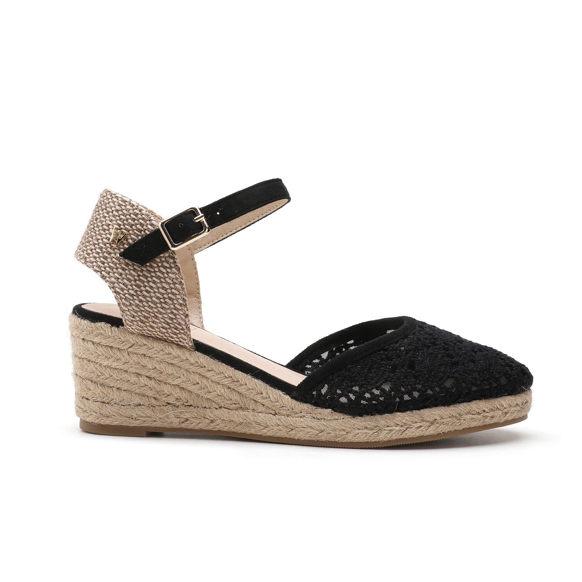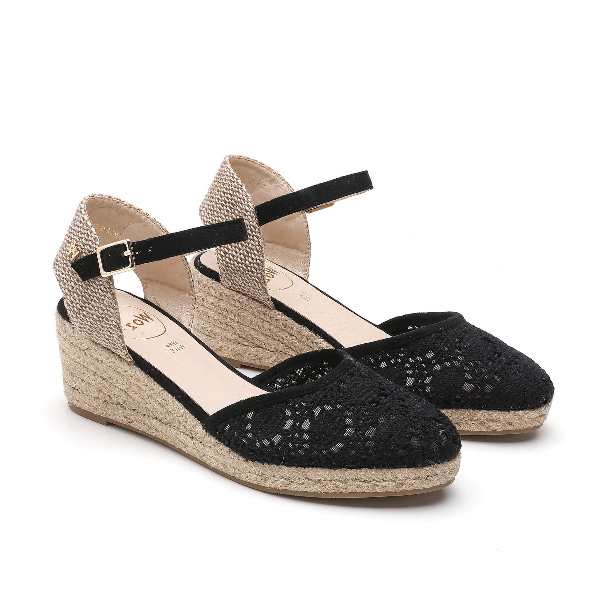 These Kelly Black Espadrilles boast a fashionable, mid-high heel with a crochet upper and a buckle fastening ankle strap. The footbed is soft and padded, while the heel is covered with a natural beige braided rope - all designed in Italy with a heel height of 5 cm.