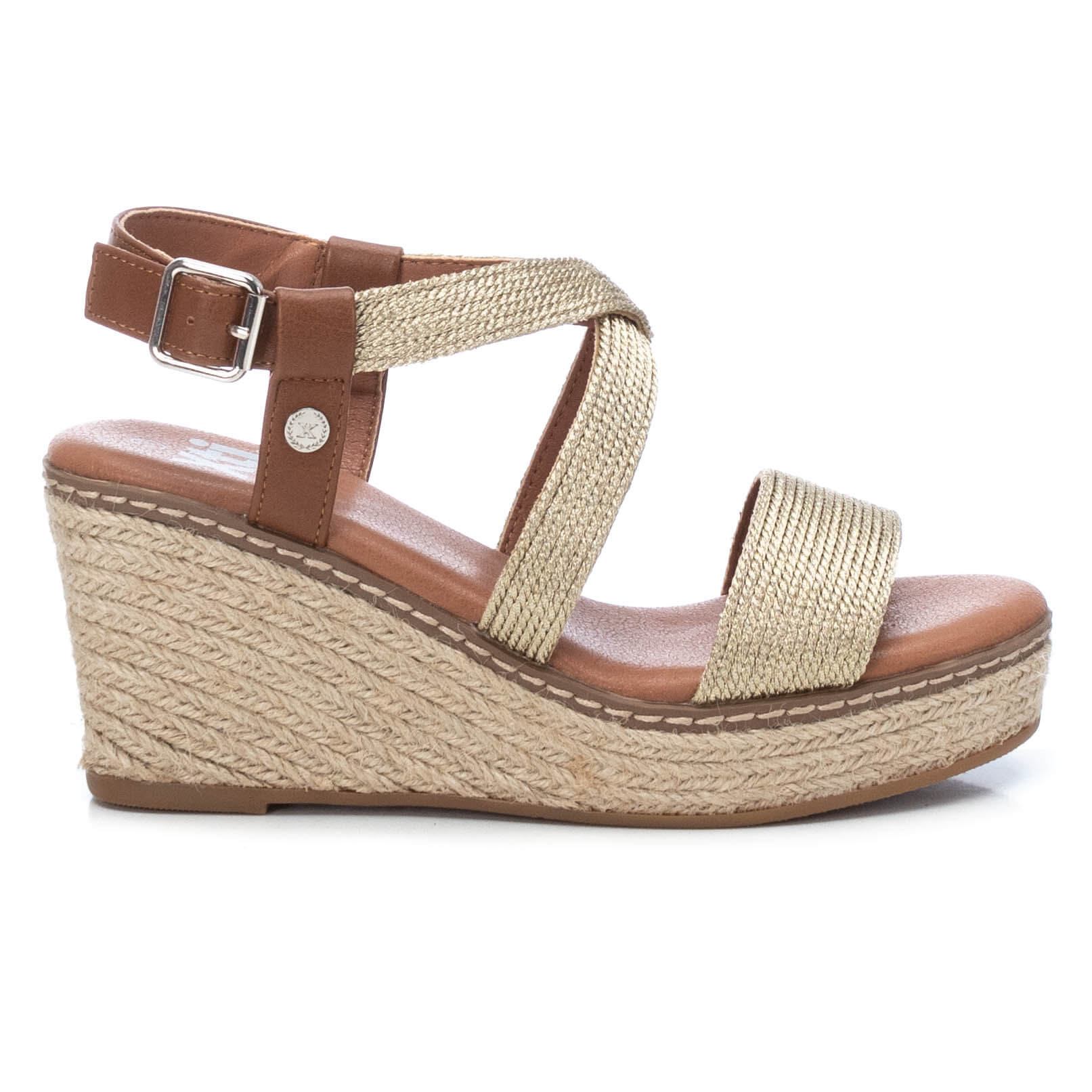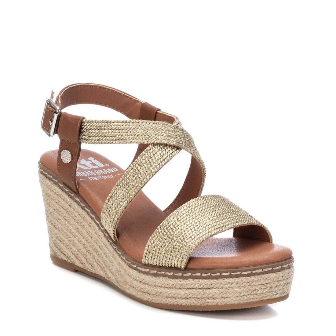 Experience maximum comfort and style with these metallic effect soft braided rope sandals from the Xti brand. Featuring an adjustable strap with a metallic buckle around the ankle, a comfortable padded insole, and a wedge heel covered with braided jute, these sandals offer a heel height of 7 cm and a non-slip rubber sole for added safety.