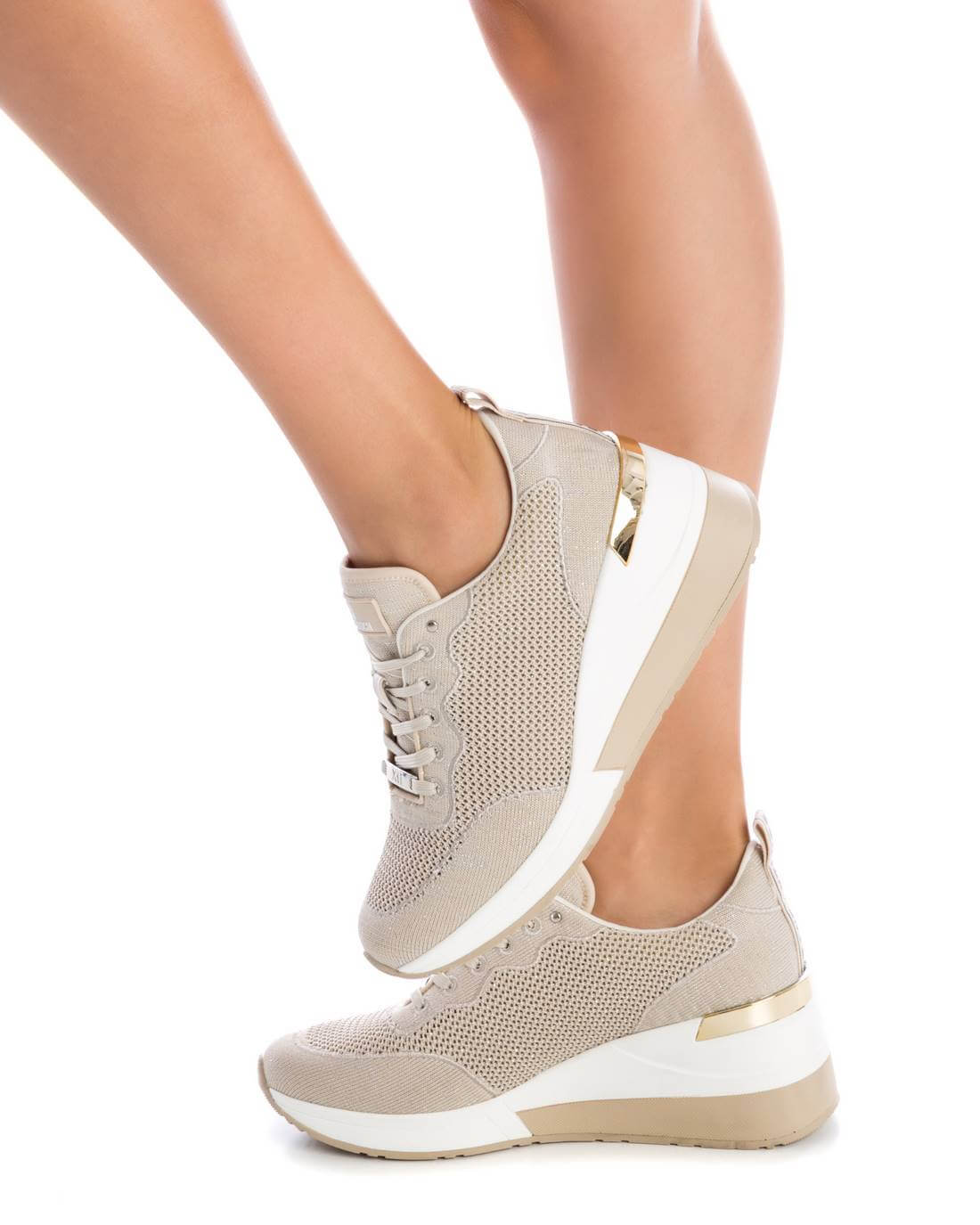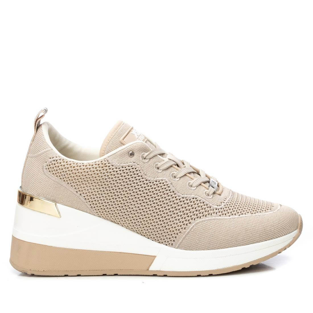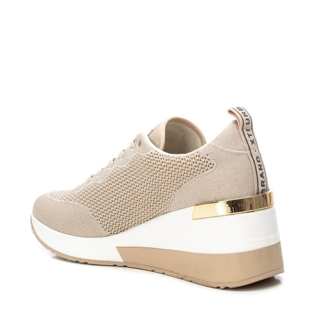 These Marbella Beige Sneakers, manufactured by Xti, feature a lace-up closure and are made of textile material. The shoes also offer a 7 cm high wedge for a casual look and have a two-tone outsole. The non-slip rubber sole provides durability and stability.