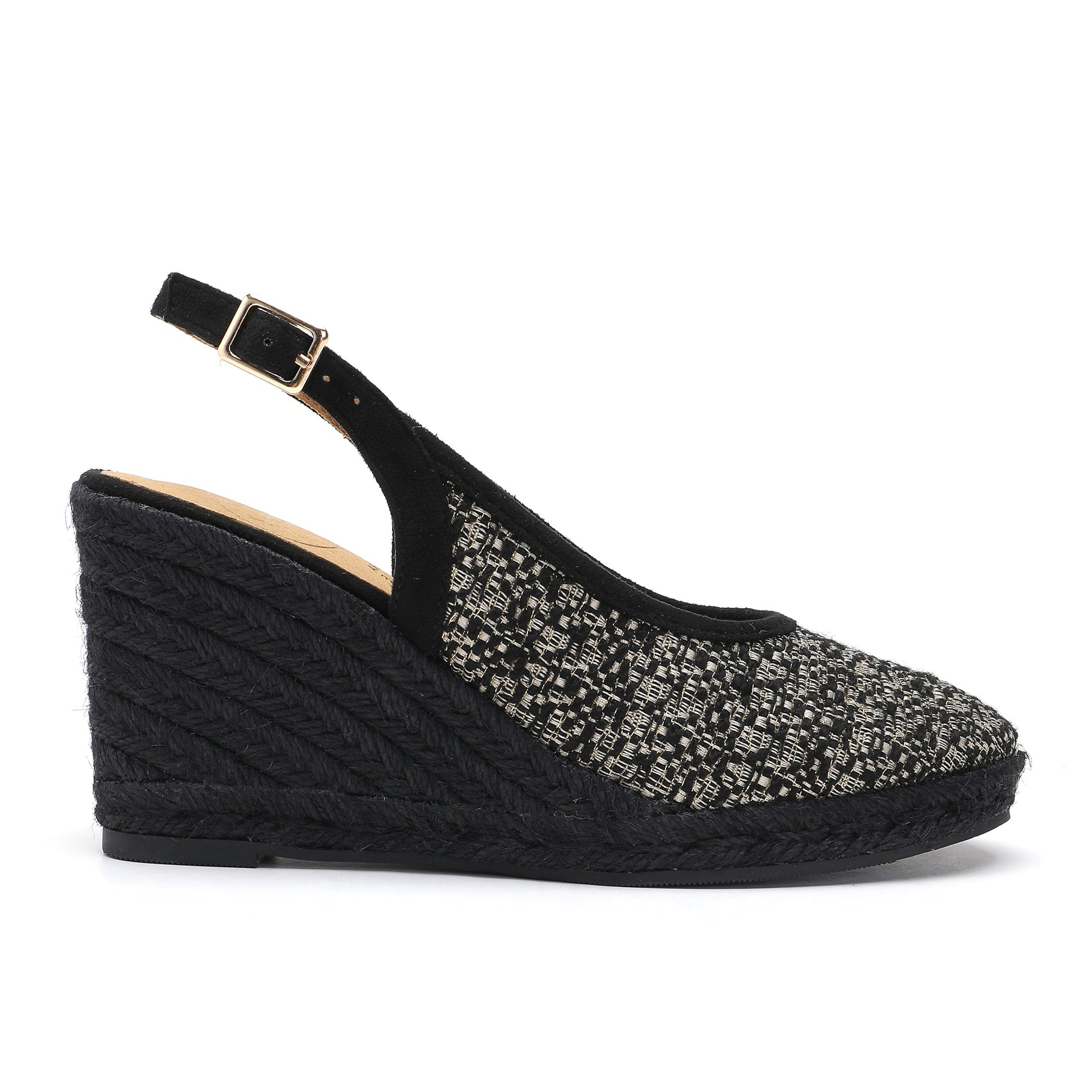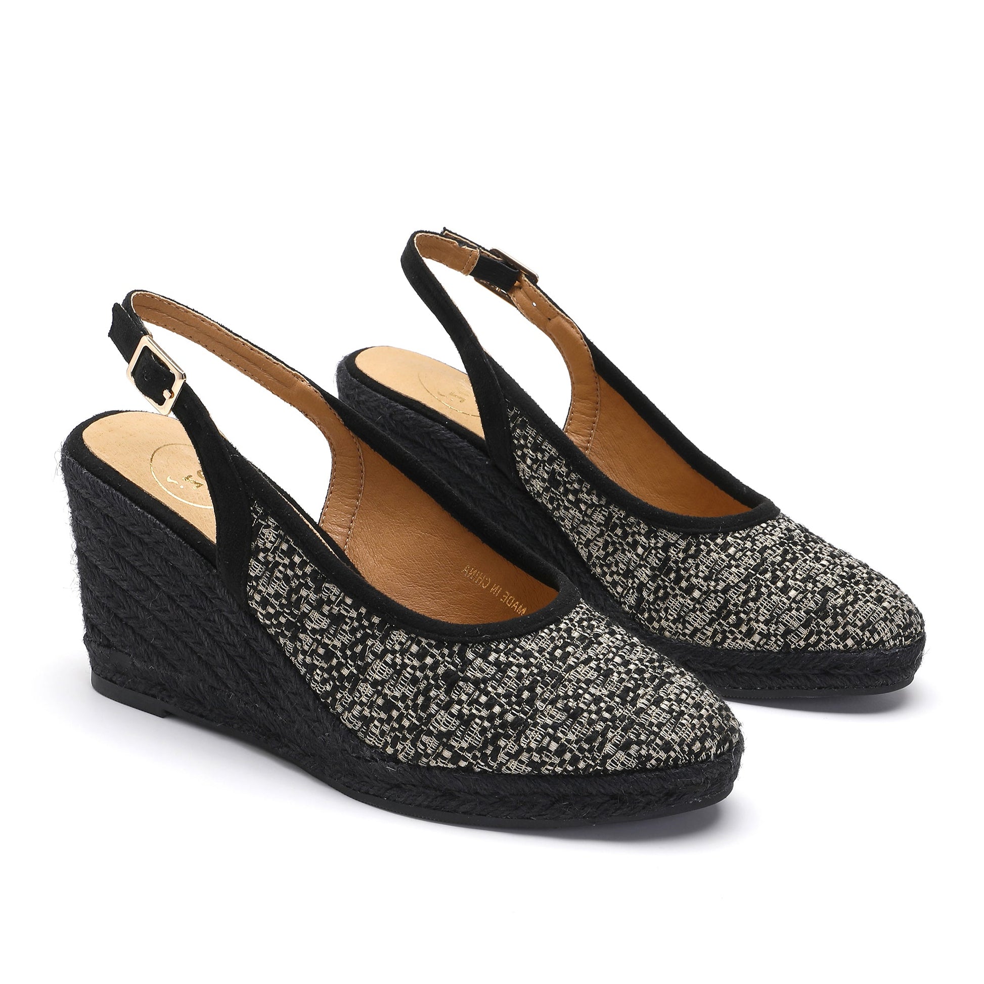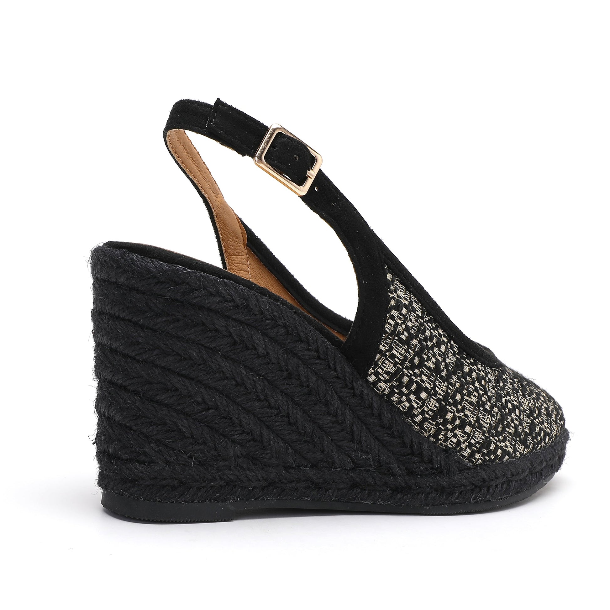 Elegant wedge espadrilles crafted from fabric with a soft padded footbed and a buckle-adjustable ankle strap. Featuring a 7 cm heel covered in black braided jute, these shoes are expertly designed in Italy.
