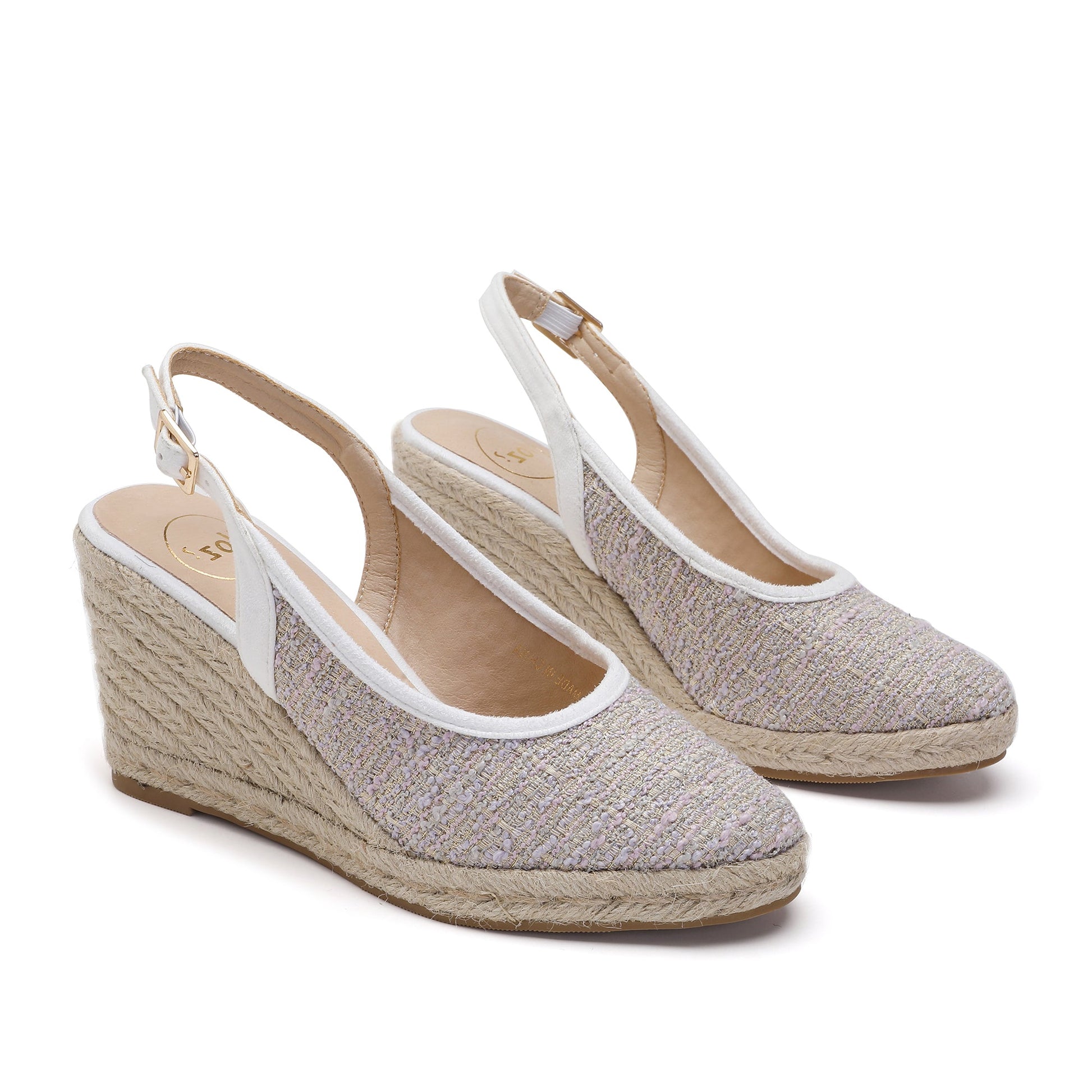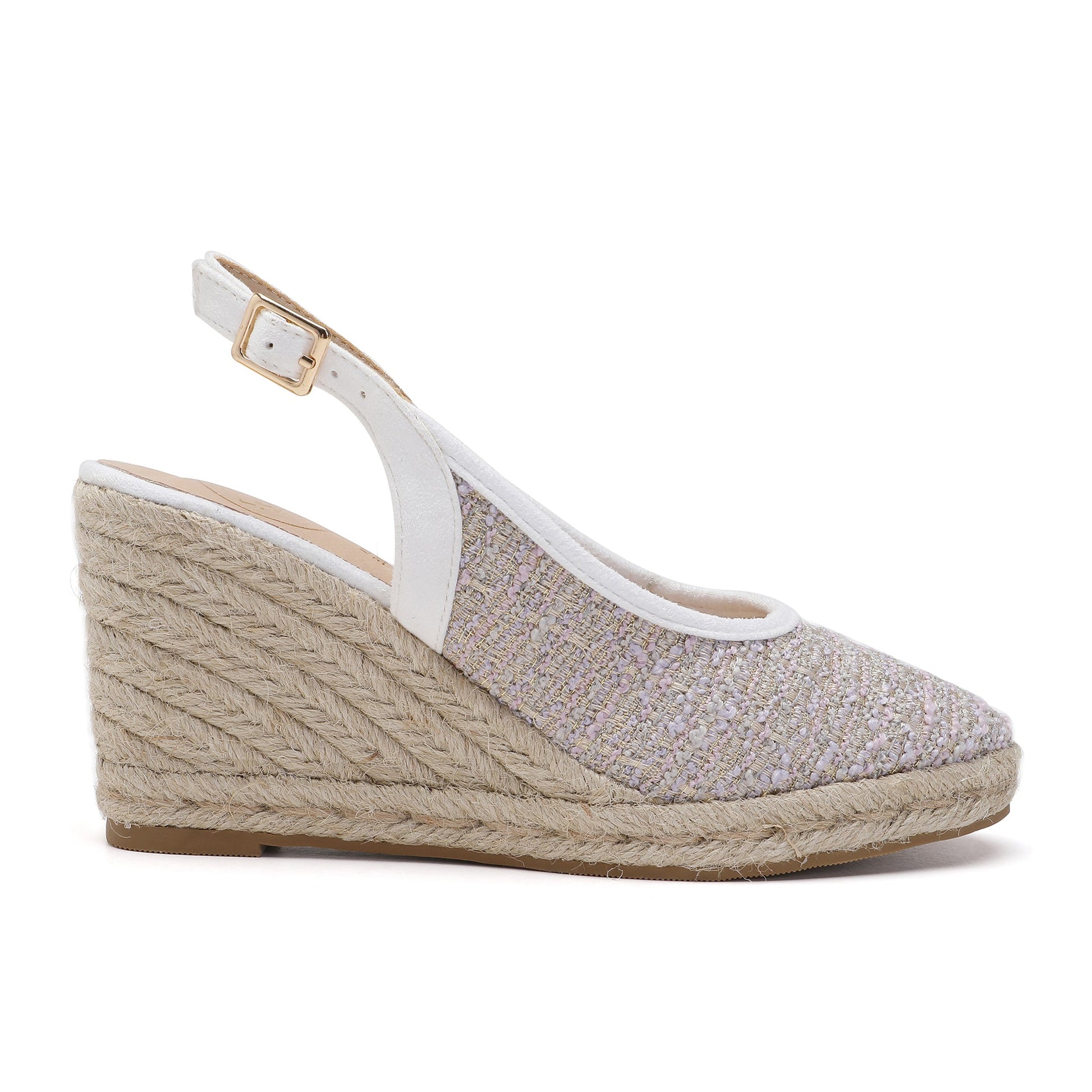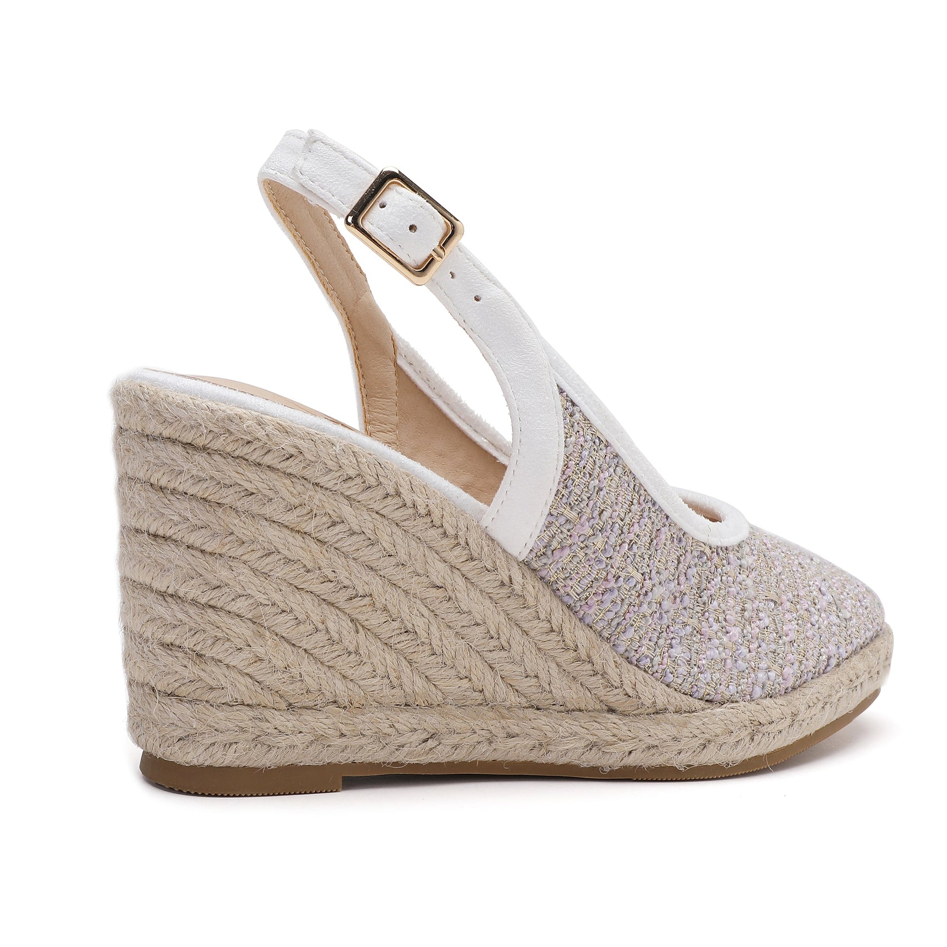 The Marilyn White Purple Espadrilles feature a 7 cm wedge heel made from soft, padded fabric. The heel is adjustable with a buckle ankle strap and covered in natural jute. Designed in Italy, these espadrilles are the perfect combination of comfort and style.
