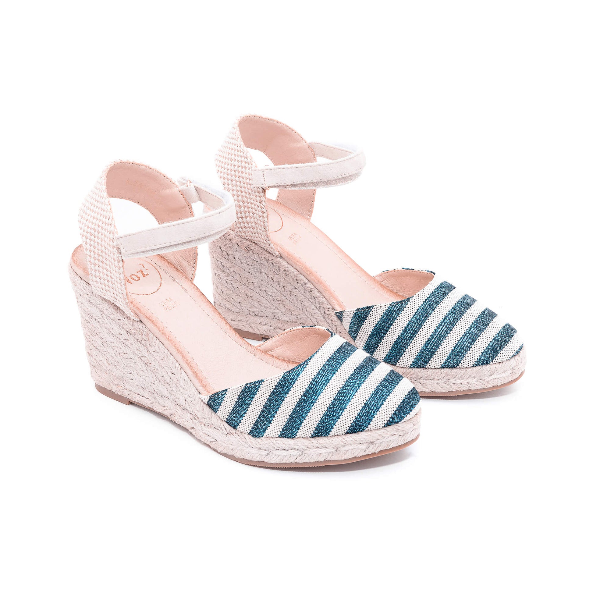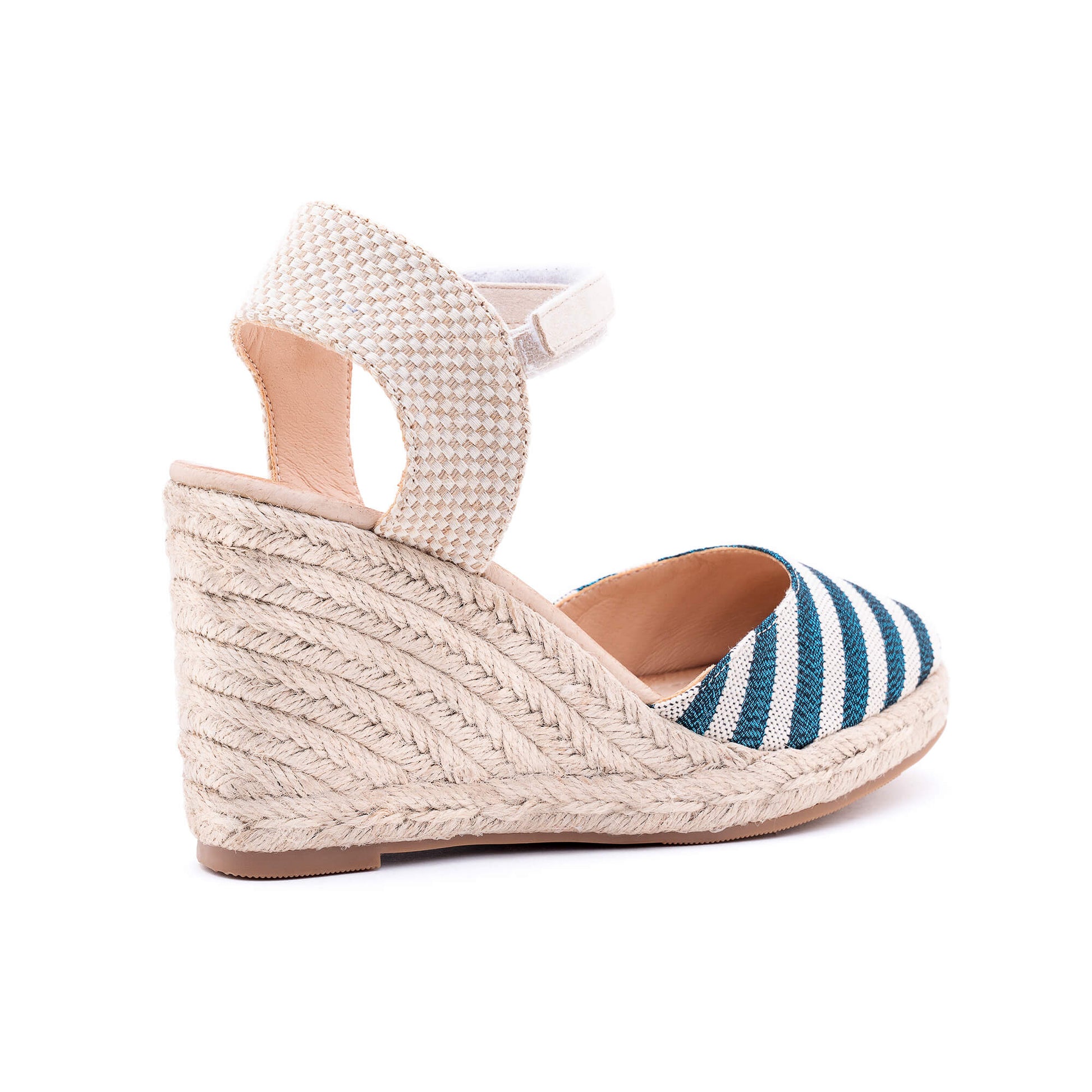 These Mary Aqua Espadrilles feature a stylish wedge made from quality fabric, along with an adjustable velcro ankle strap for a perfect fit. The footbed is designed with soft padding, while the heel is covered in natural beige jute, giving it a chic and sophisticated look. The heel height measures 7 cm and these espadrilles are proudly designed in Italy.