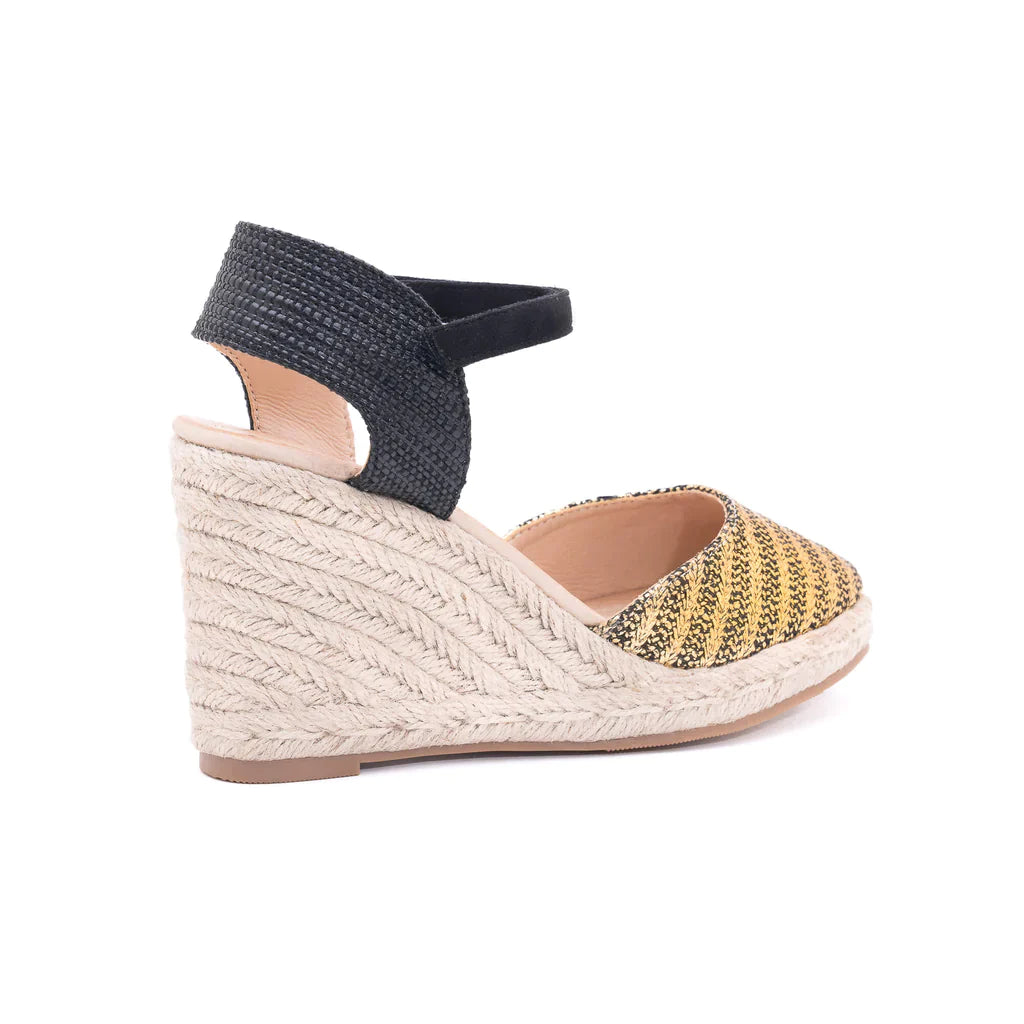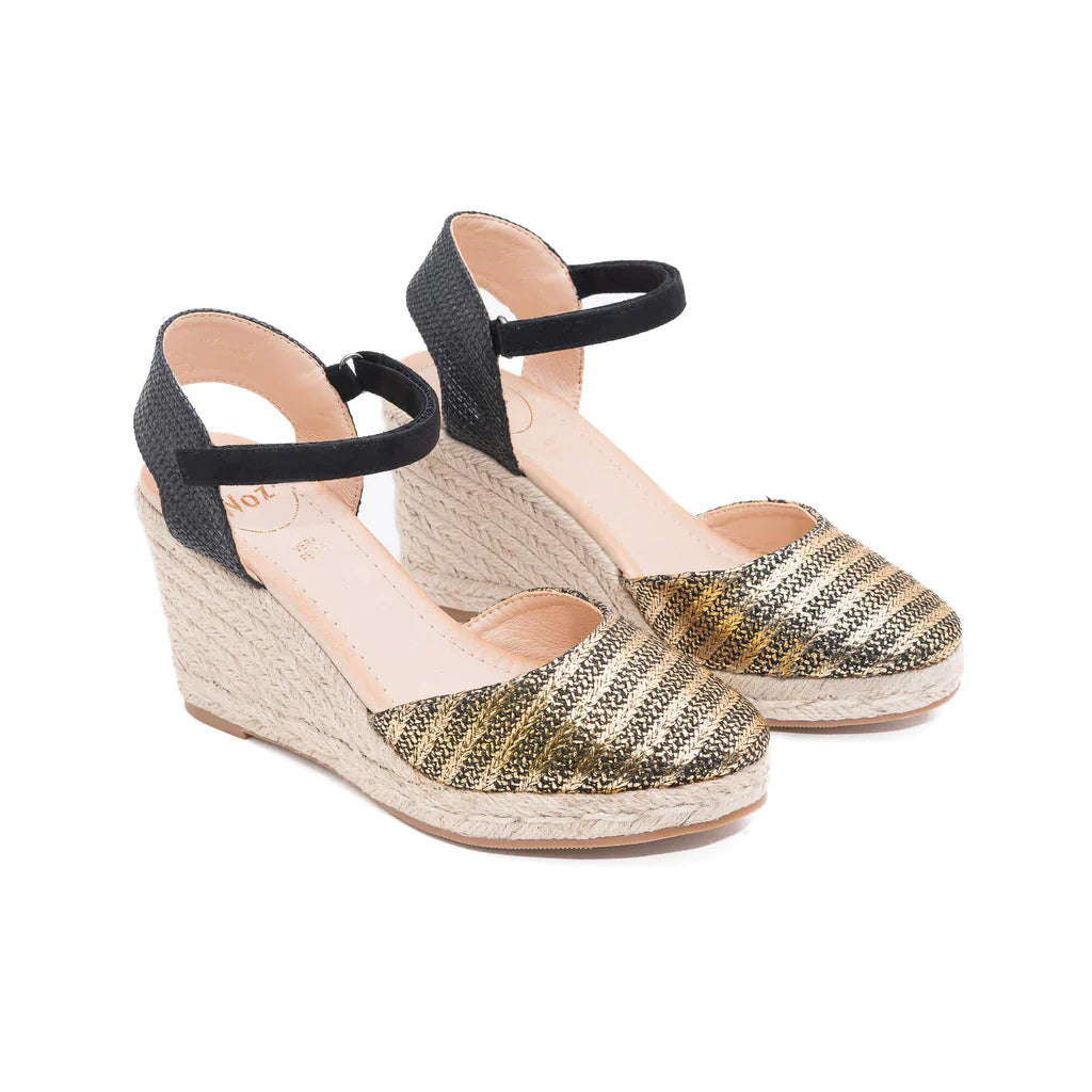 Designed in Italy, these Mary Black Gold Espadrilles feature a soft, padded footbed and an adjustable velcro ankle strap. The wedge heel is covered in natural braided jute, with a height of 7 cm. These espadrilles offer a lovely, comfortable style perfect for any occasion.