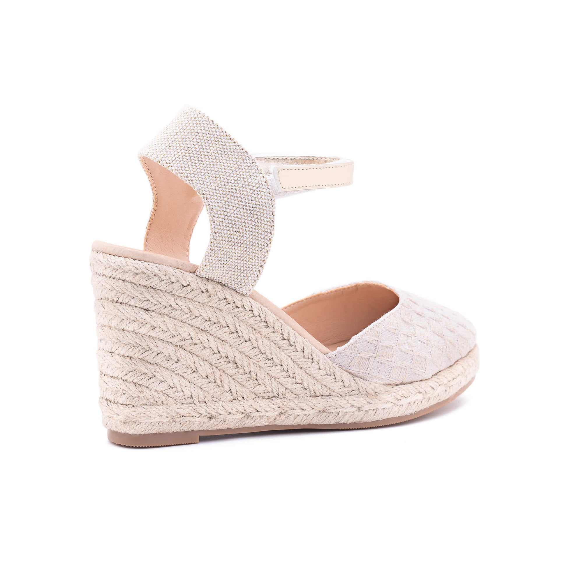 This Mary Light Gold Espadrille features an adjustable velcro ankle strap and a soft padded footbed for added comfort. The wedge heel, measuring 7 cm, is covered with natural beige fabric and designed in Italy.