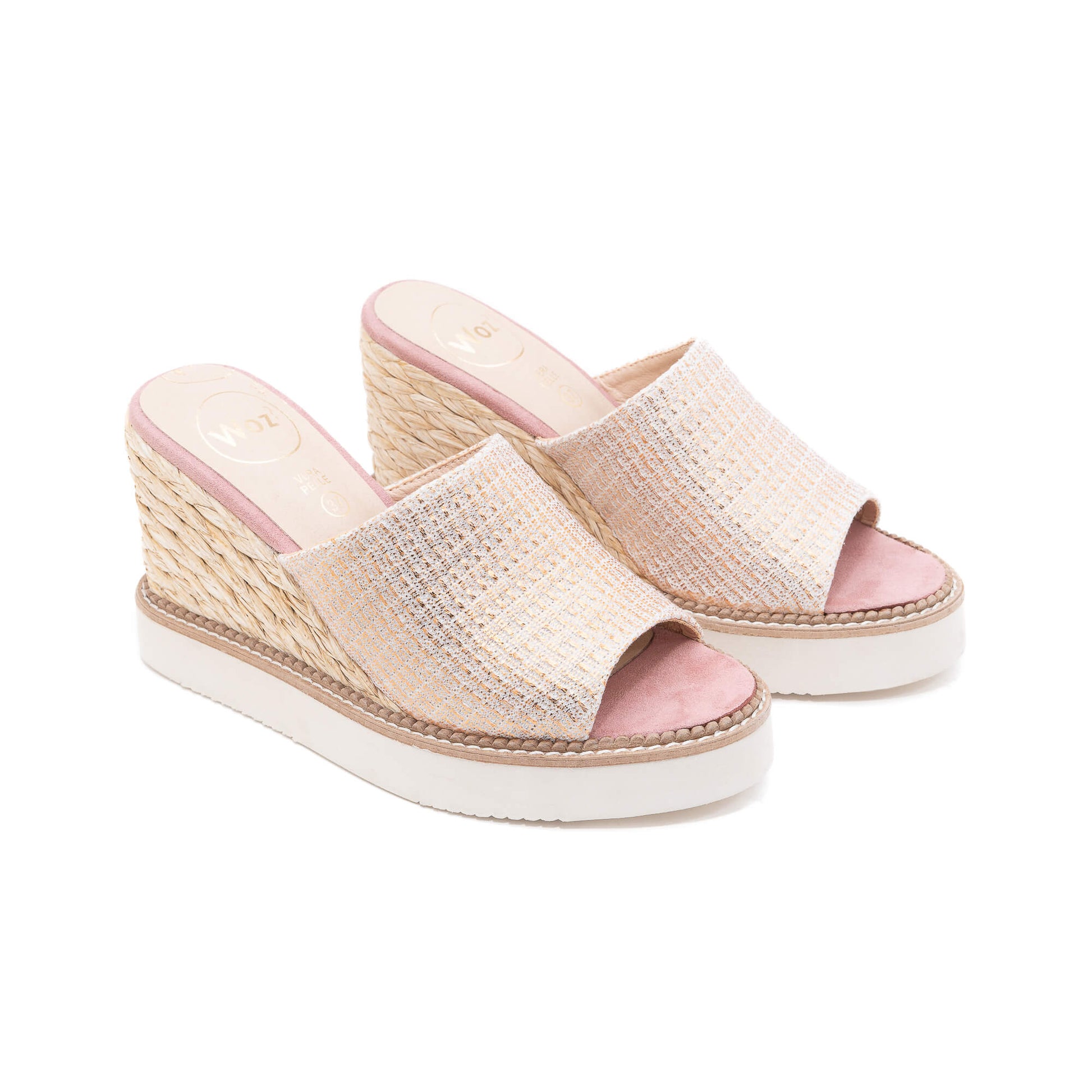 This espadrille sandal features a fabric upper and a soft padded footbed. The heel is made of natural beige braided raffia and measures 9 cm in height. Designed in Italy.