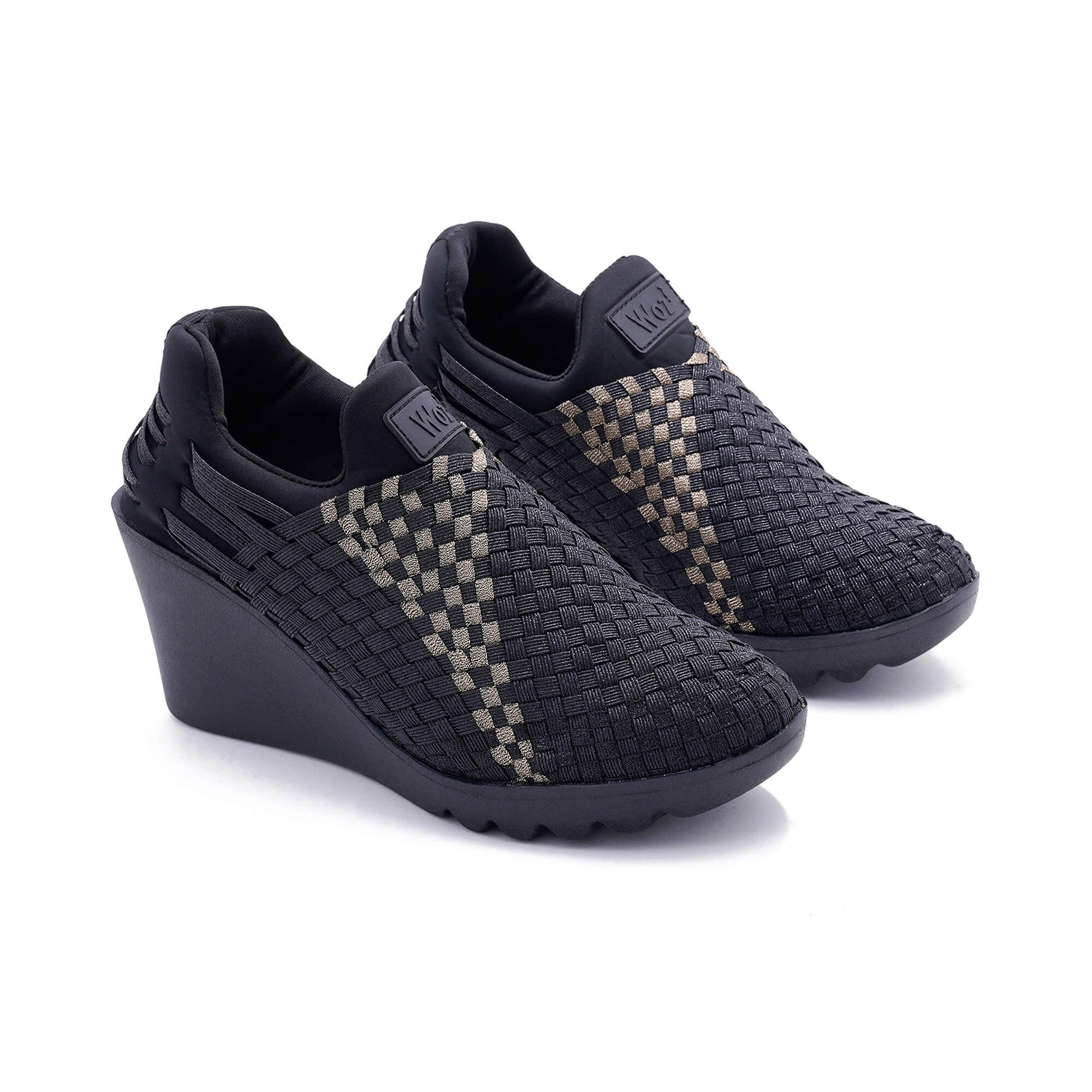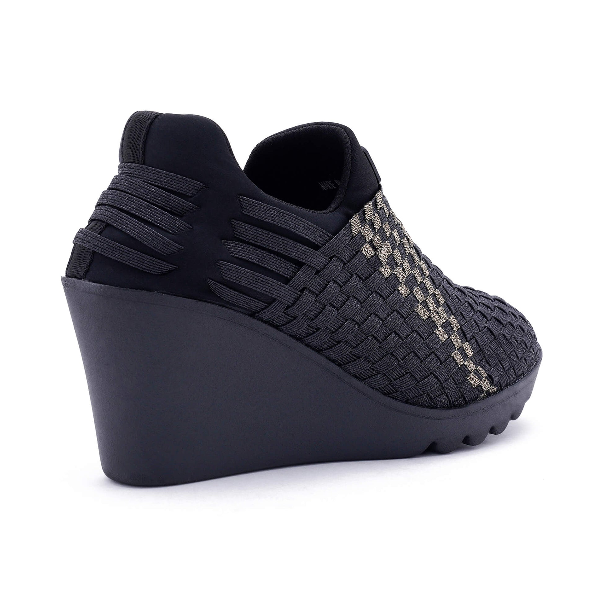 Expertly designed in Italy, this Parma Black Bronze Wedge Heel is crafted from a stretch woven textile for easy slip-on wear. With a soft padded footbed, you'll experience unparalleled comfort with every step. Plus, the black outsole provides exceptional grip for a confident stride. This stylish wedge features a 7cm heel height for a subtle yet stylish lift.