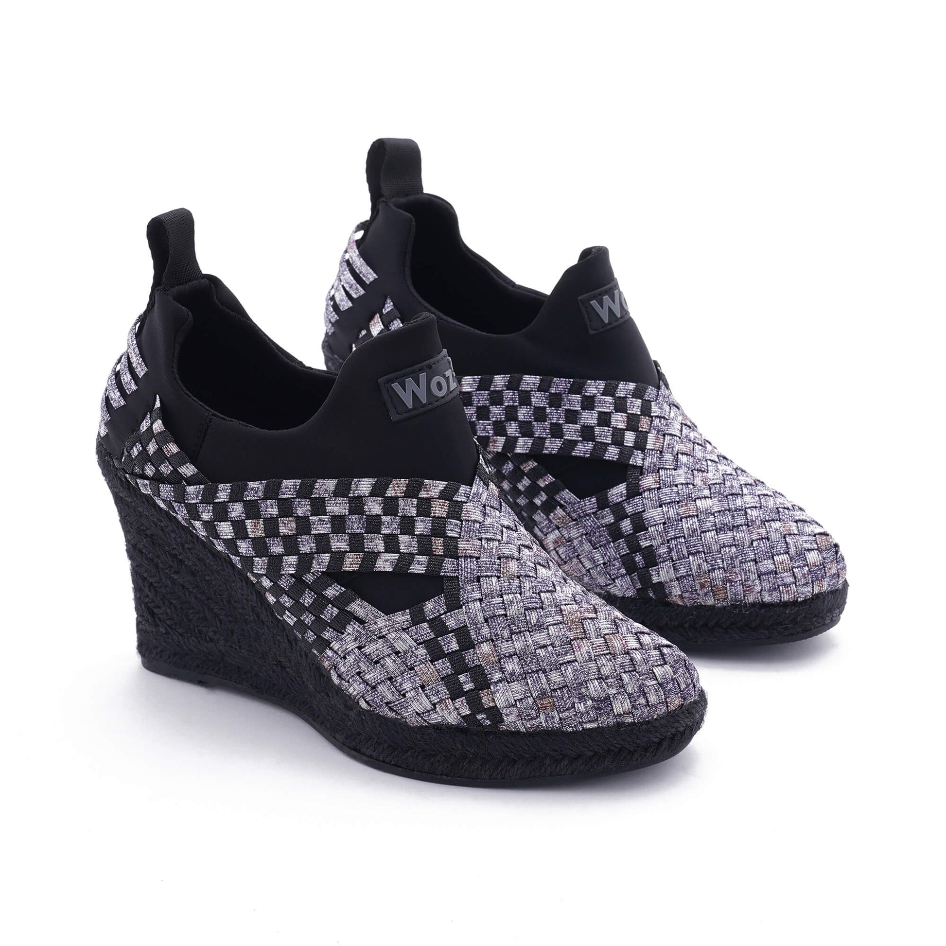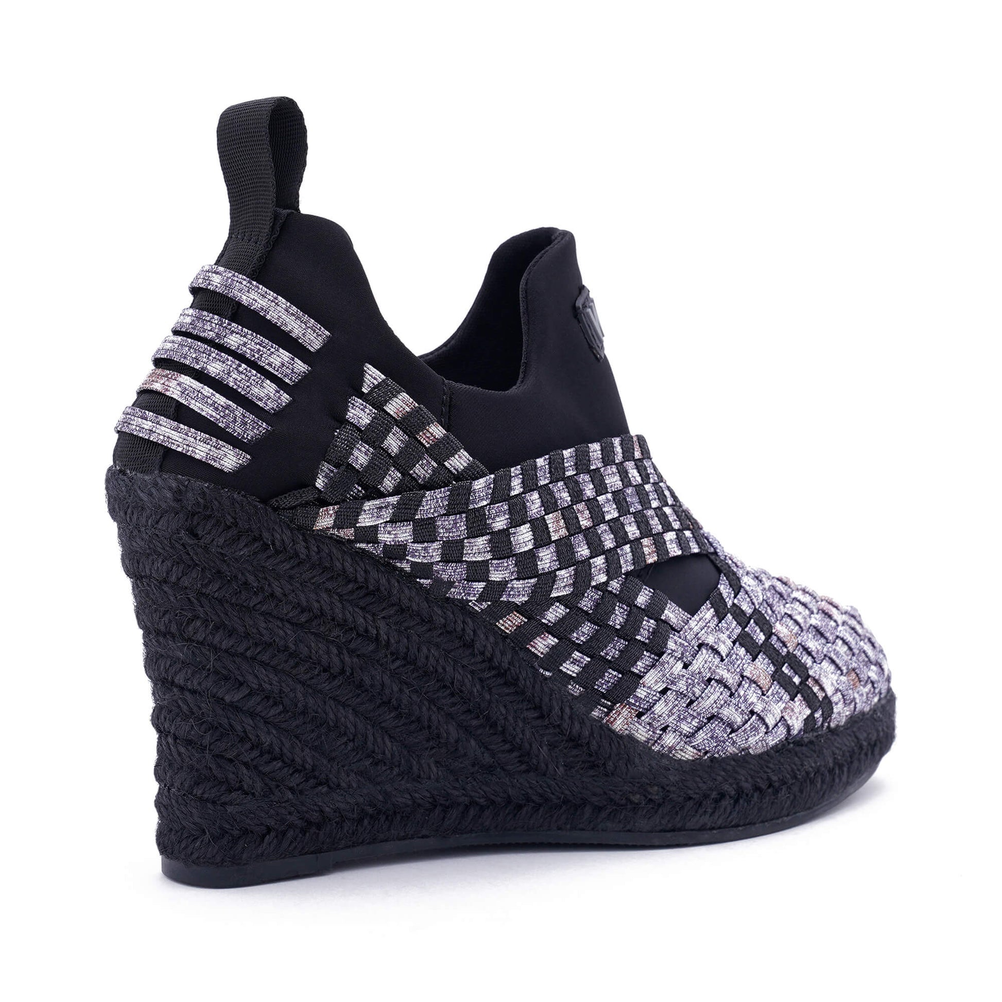Crafted from a durable stretch woven textile, these slip-on espadrilles feature a soft padded footbed for a relaxed and comfortable walking experience. Finished with a sleek black braided rope and a 7cm heel height. Designed in Italy.