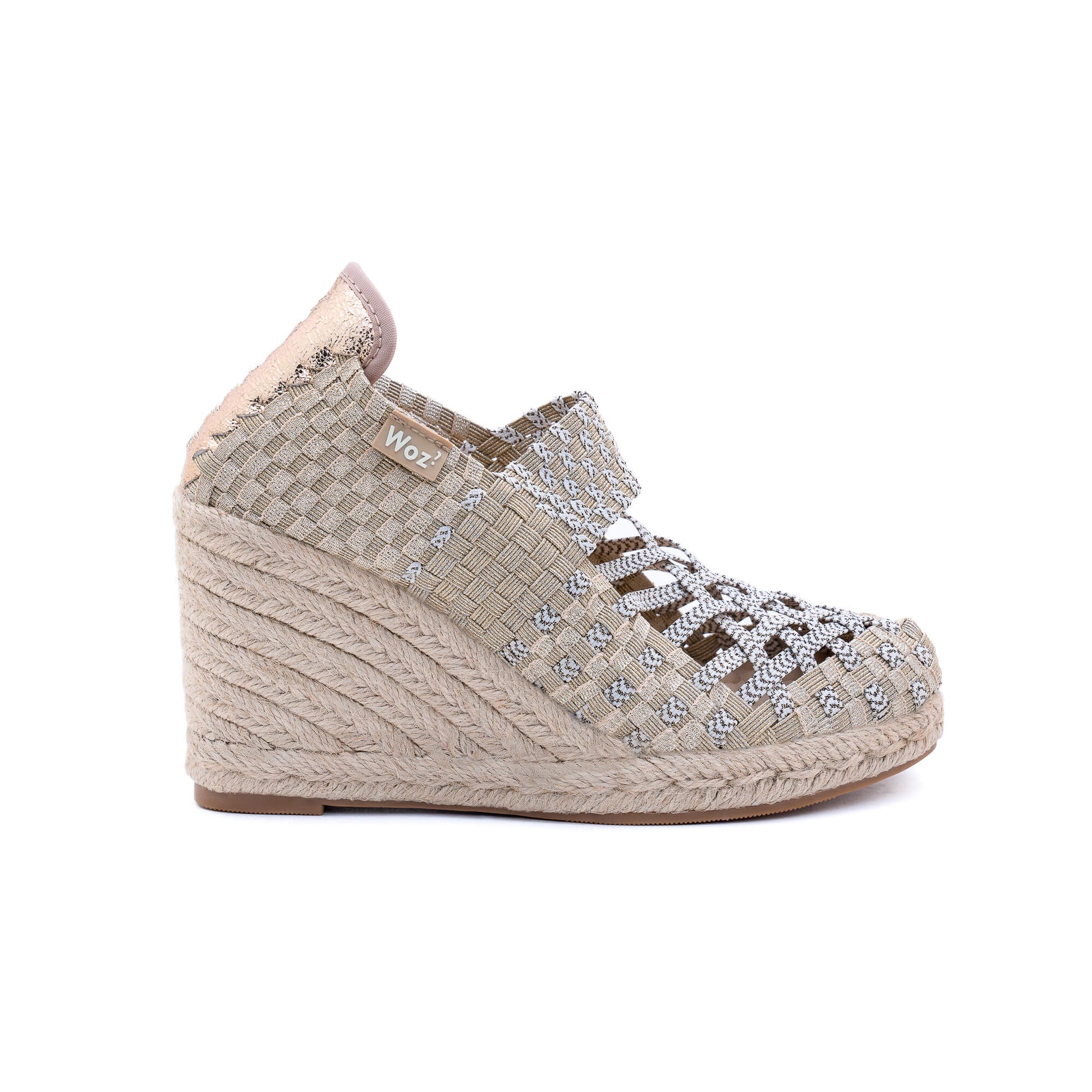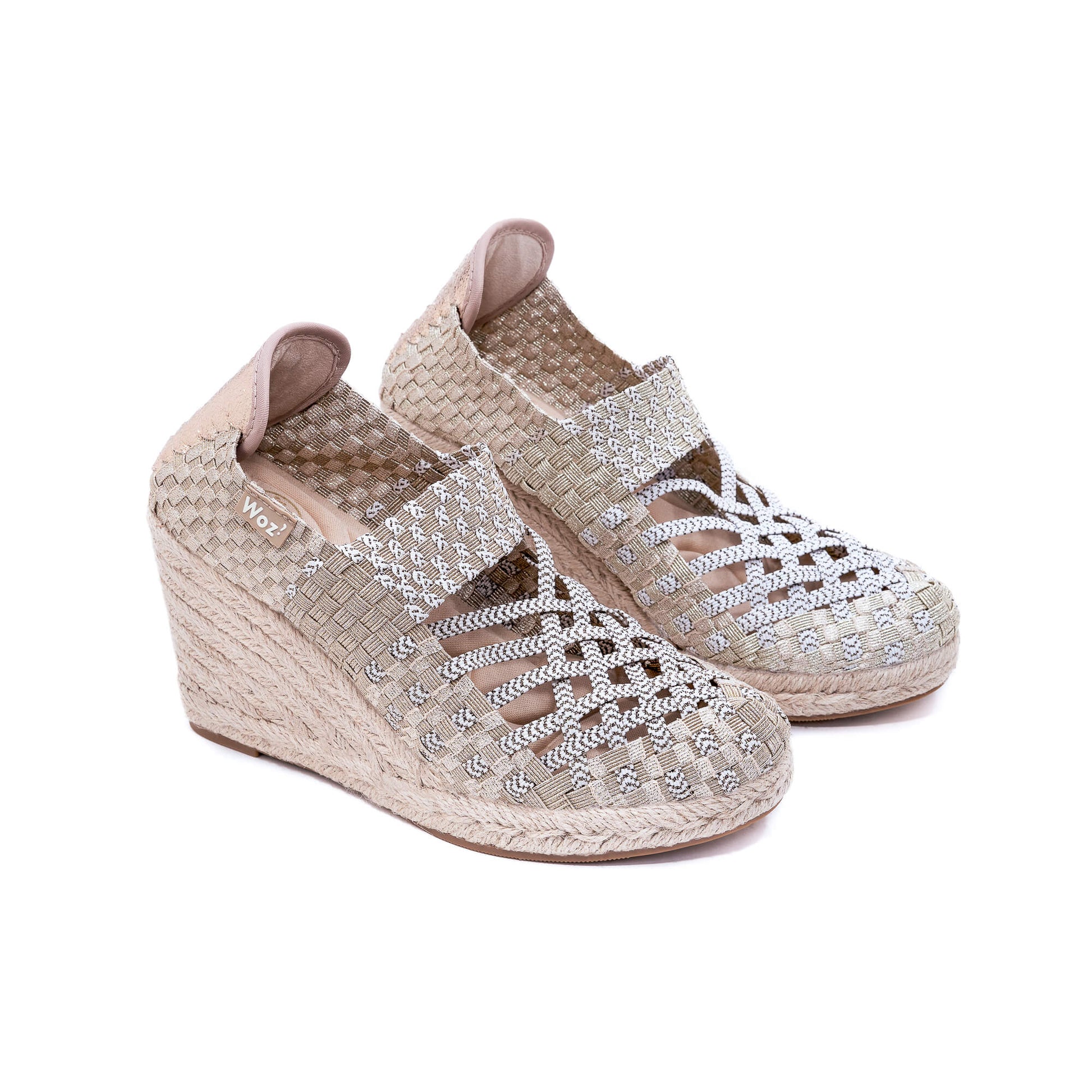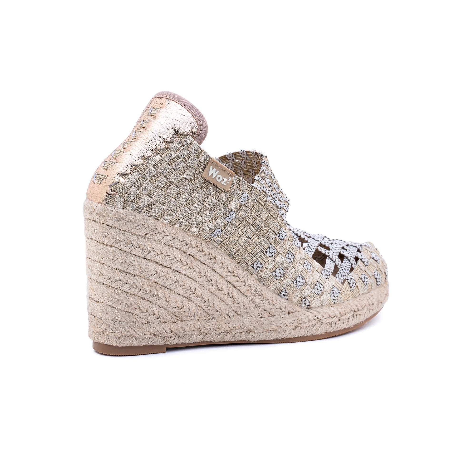 These Positano Gold & White Espadrilles are designed in Italy with a stylish, criss-cross textile pattern that molds to your feet for added comfort. The stretch woven textile creates a relaxed and elegant feel, while the 7cm heel is covered in beige braided rope for a fashionable touch. With a soft padded footbed, these slip-on espadrilles are the perfect combination of comfort and style.