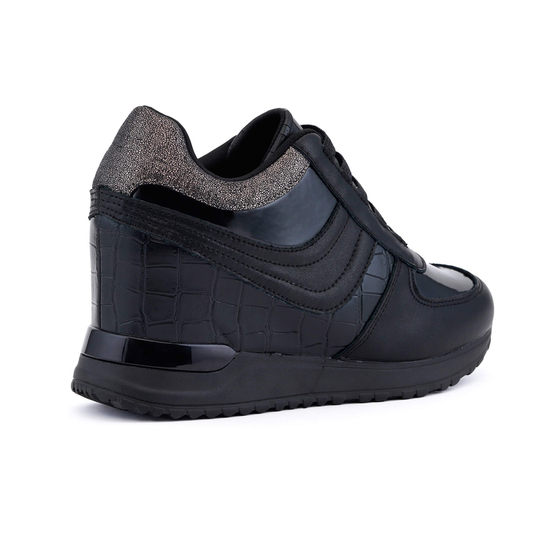 Italian-designed Prato Black Wedge Heel Sneakers feature a synthetic upper, soft padded footbed, stylish grip outsole, and a comfortable 7 cm hidden heel.