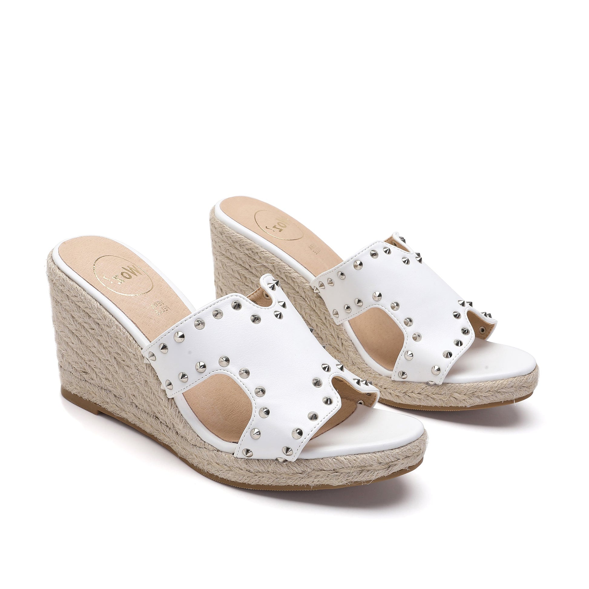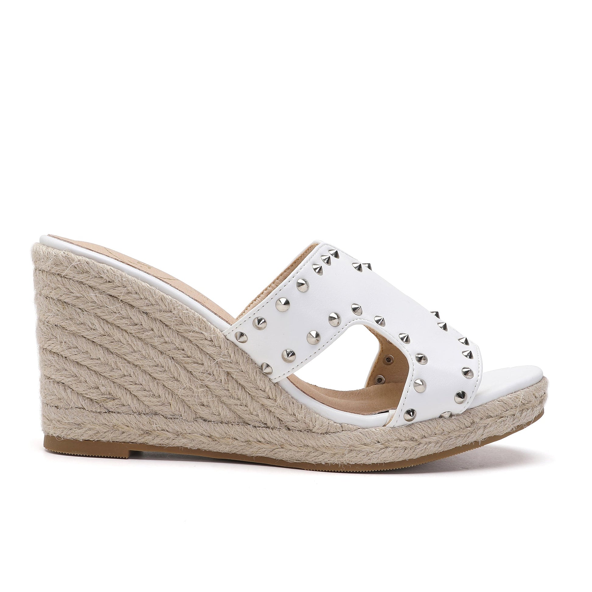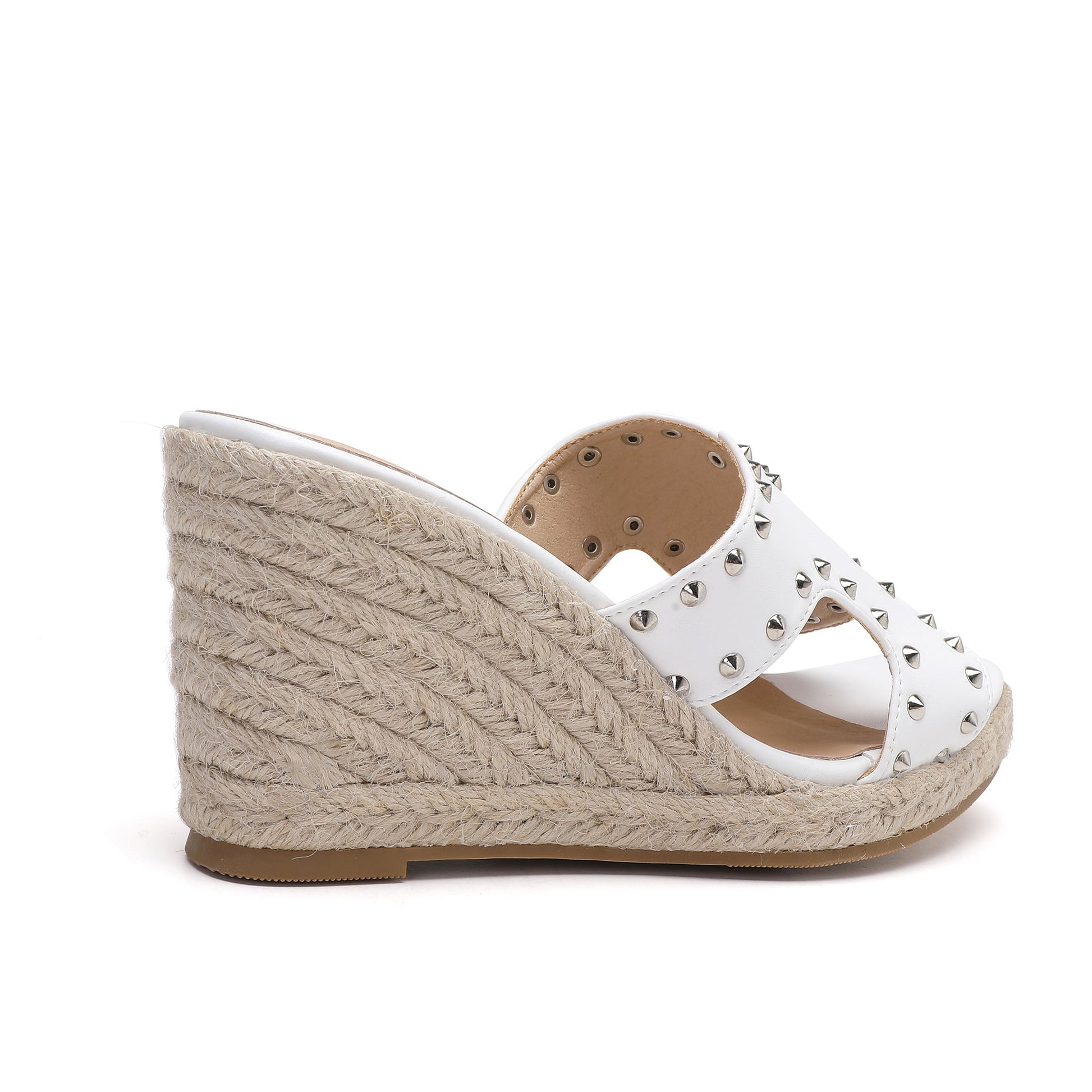 The Regina White Espadrilles are crafted with synthetic leather and adorned with silver studs. With a comfortable, soft padded footbed and a 7 cm heel covered in natural jute, these Italian-designed shoes are sure to elevate any look.