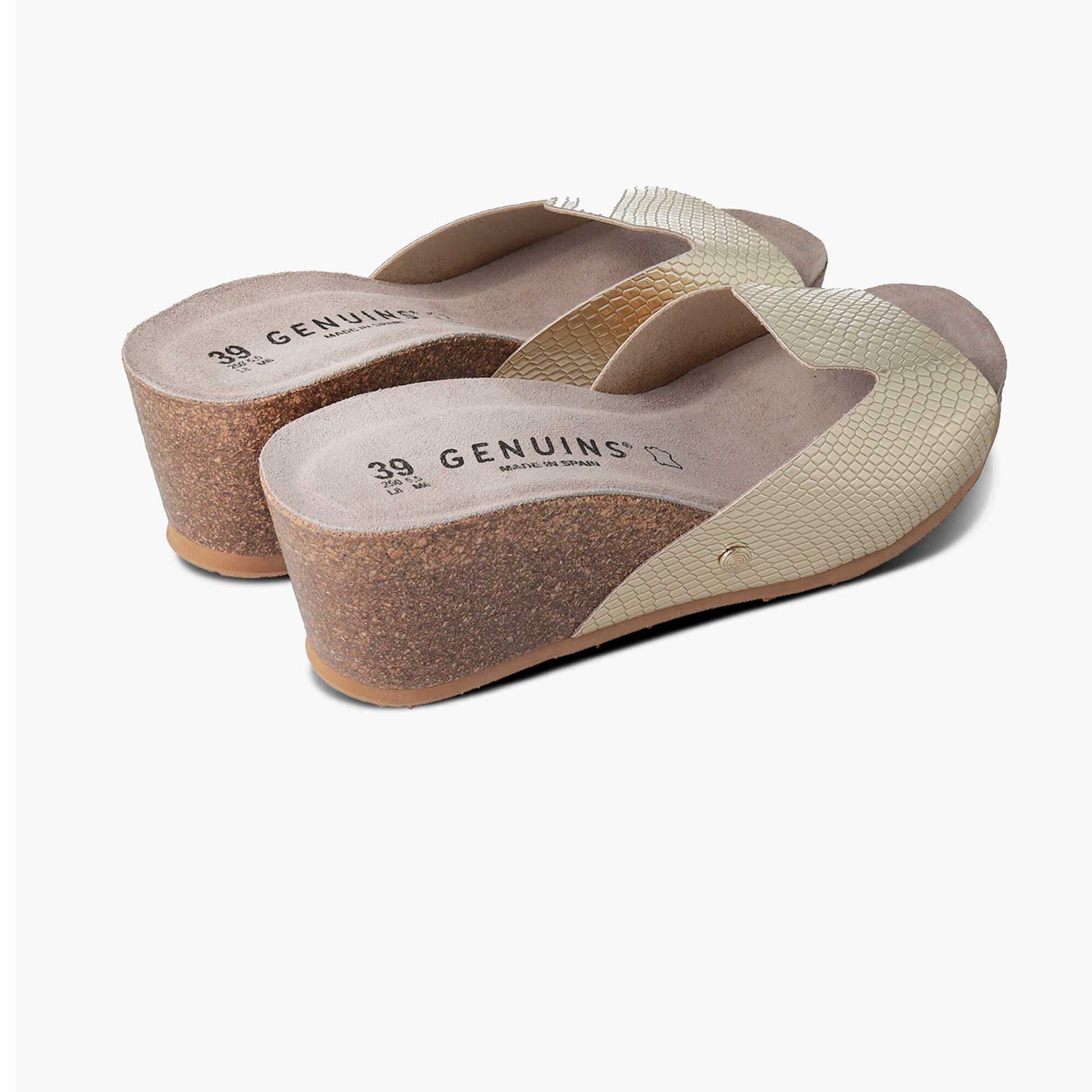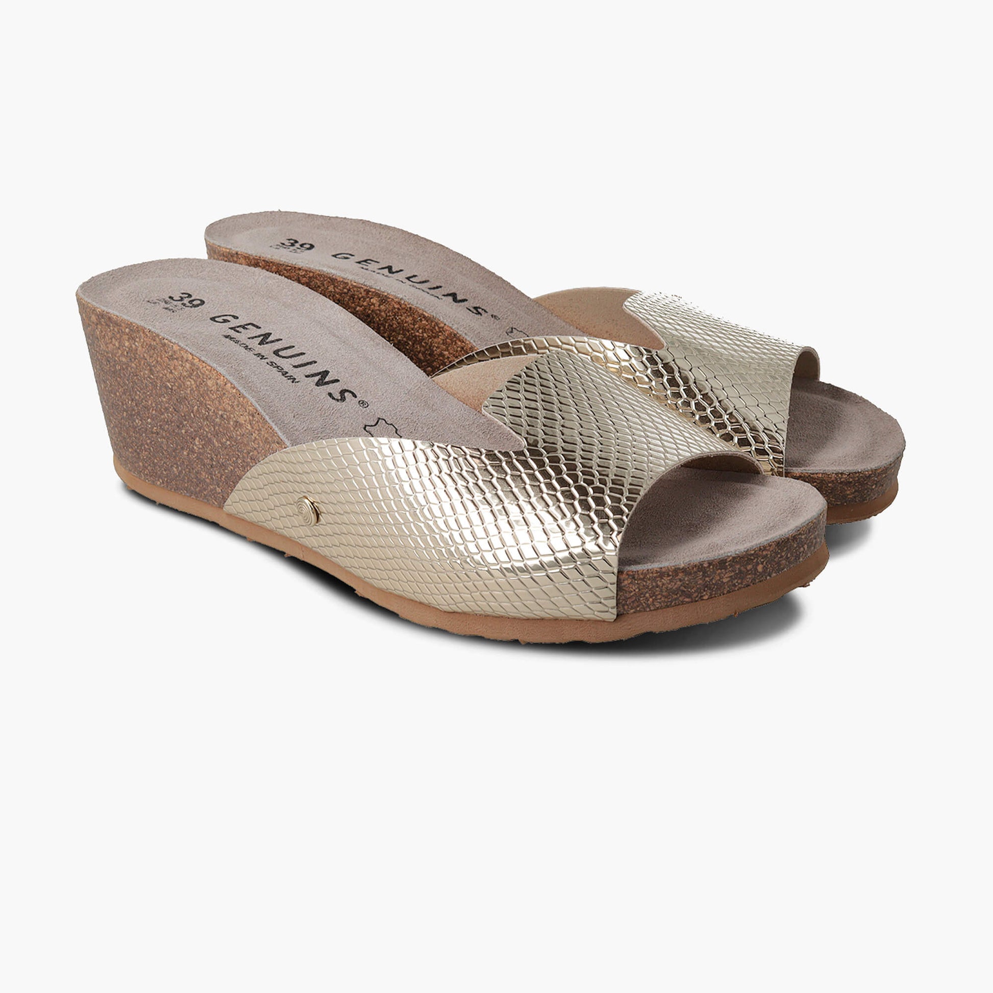 Made in Spain, these Thalia Gold Sandals boast a heel height of 6 cm and a synthetic material wedge, making them both stylish and comfortable. The leather lining and contoured footbed provide support, while the EVA outsole and soft cork anatomical plant offer durability.