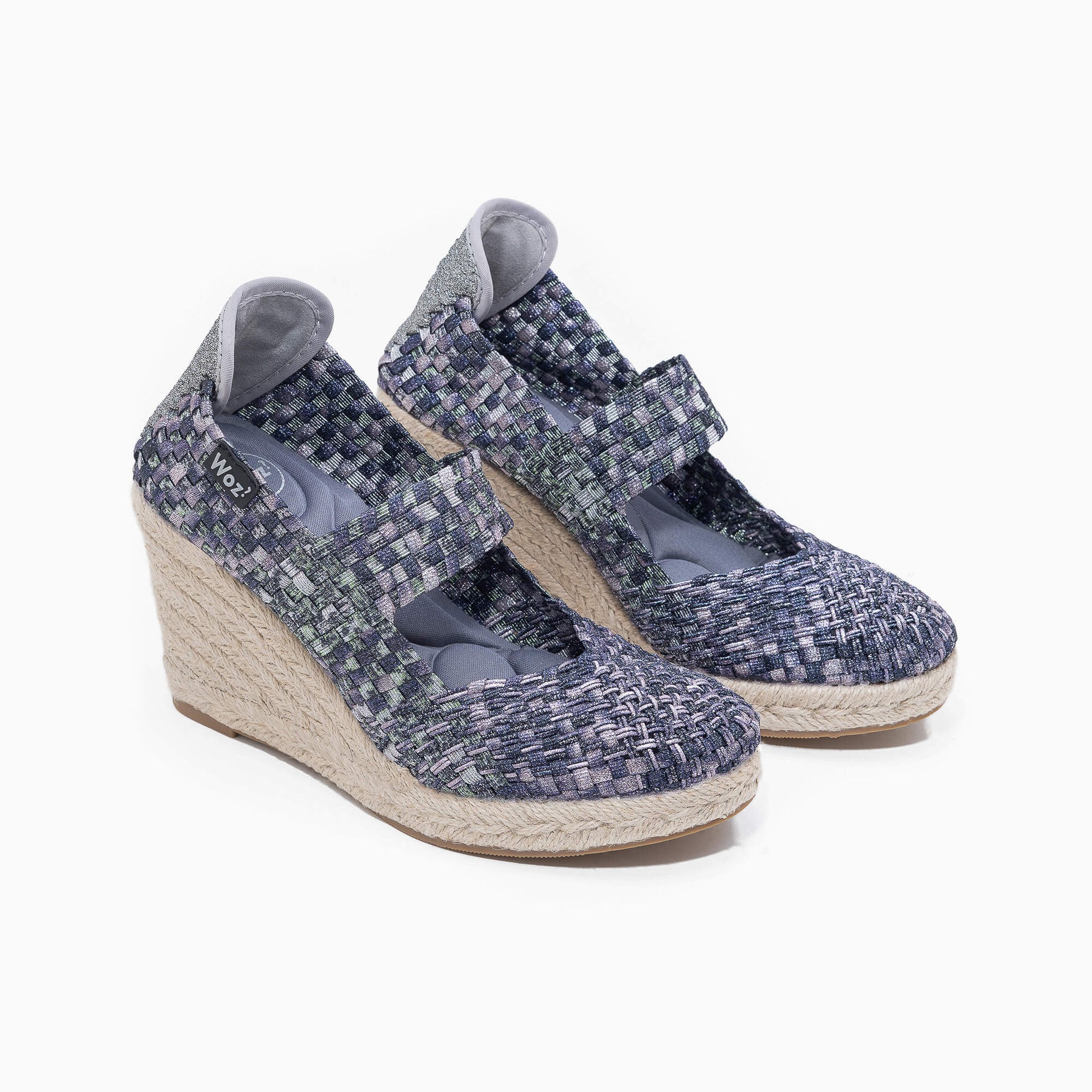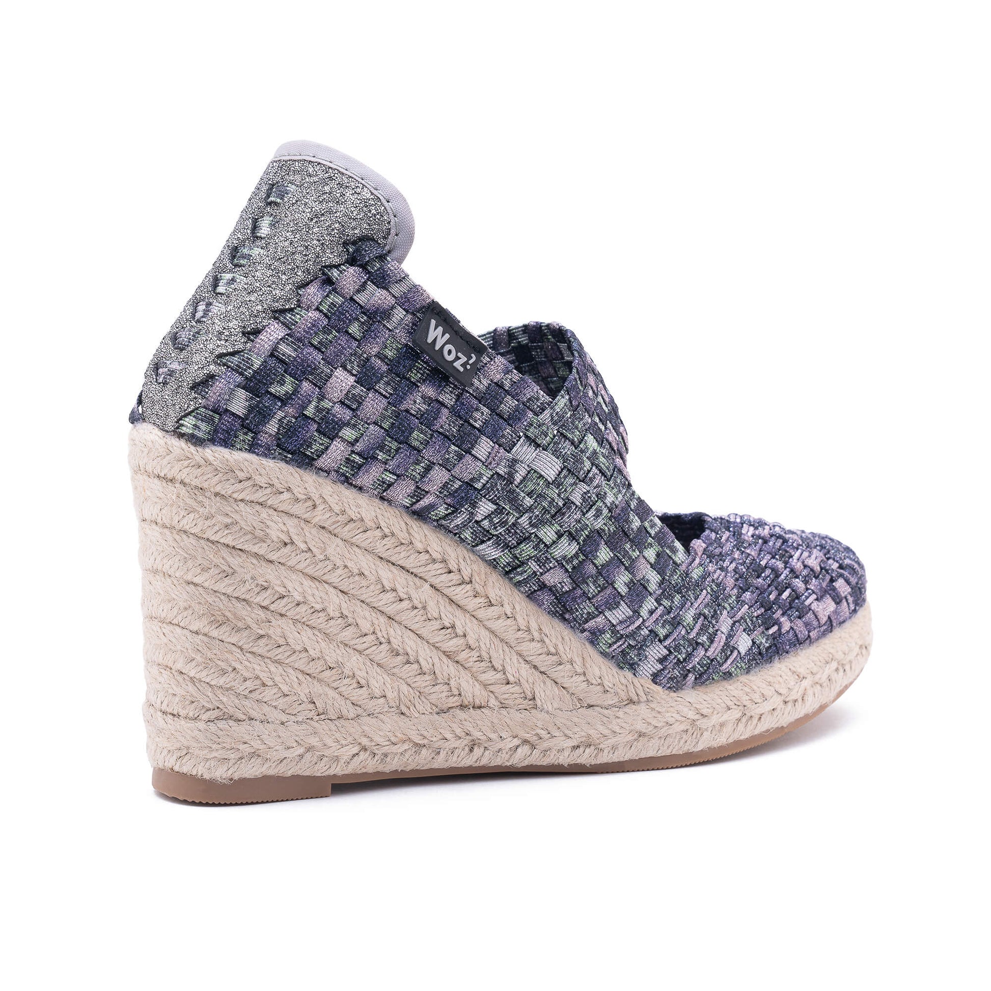 This espadrille wedge features a stretch woven textile construction and a soft padded footbed for a comfortable walking experience. The heel is adorned with a beige braided rope, adding a stylish touch. The heel height is 7cm and the design is from Italy.